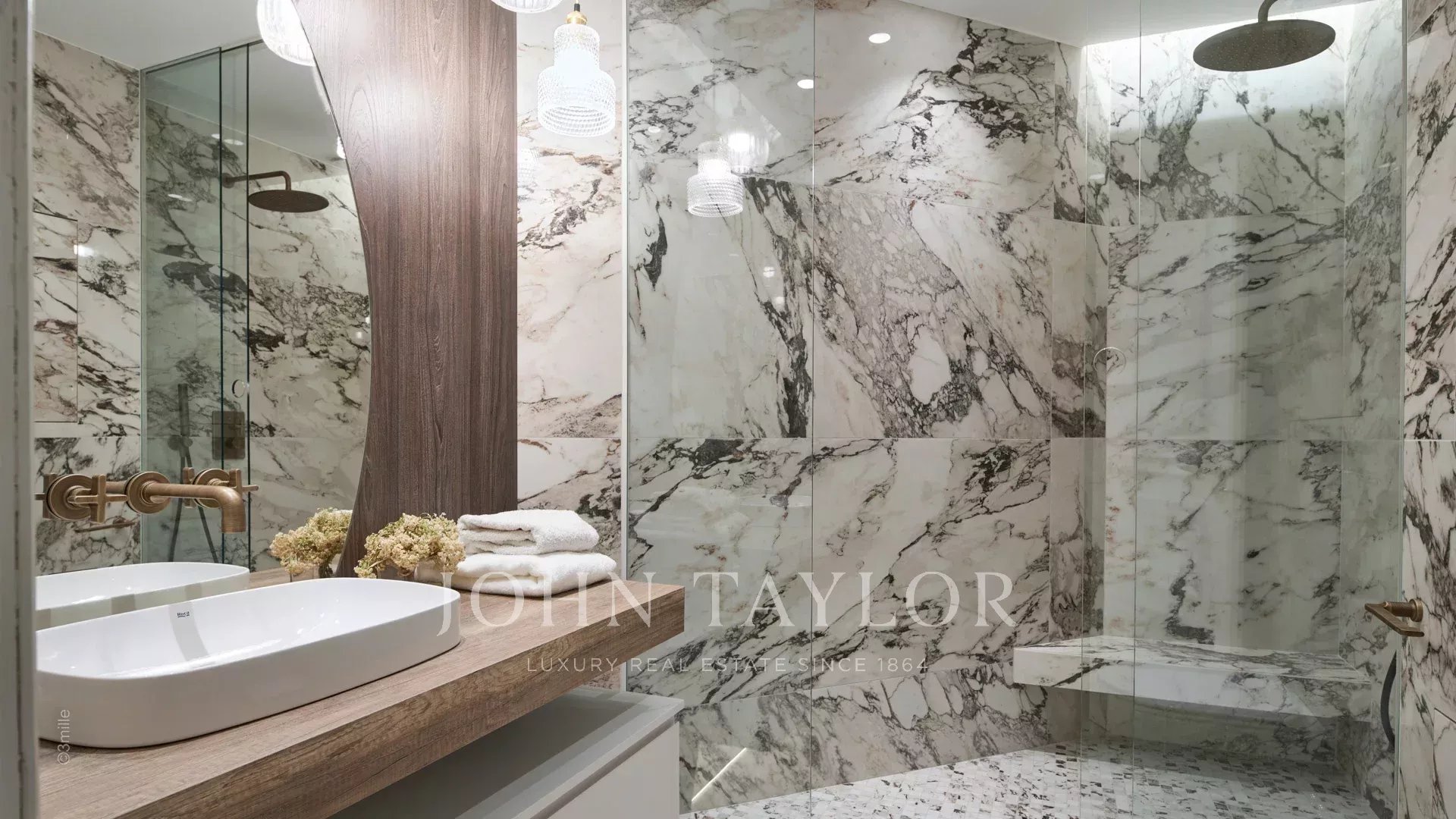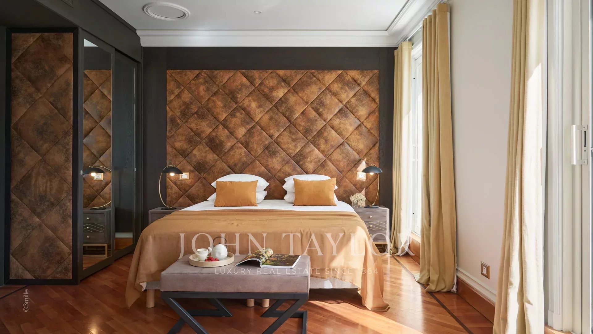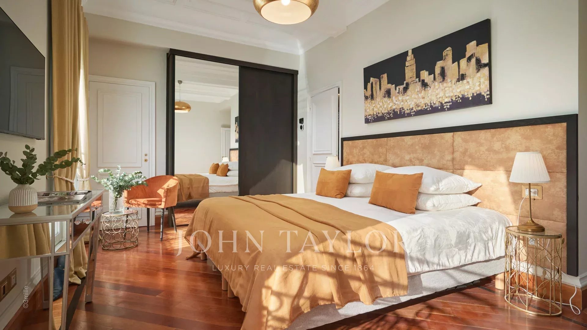 - Hlavní ložnice s manželskou postelí velikosti king size, která nabízí úchvatný výhled na Palais des Festivals, a vlastní sprchový kout s WC.
