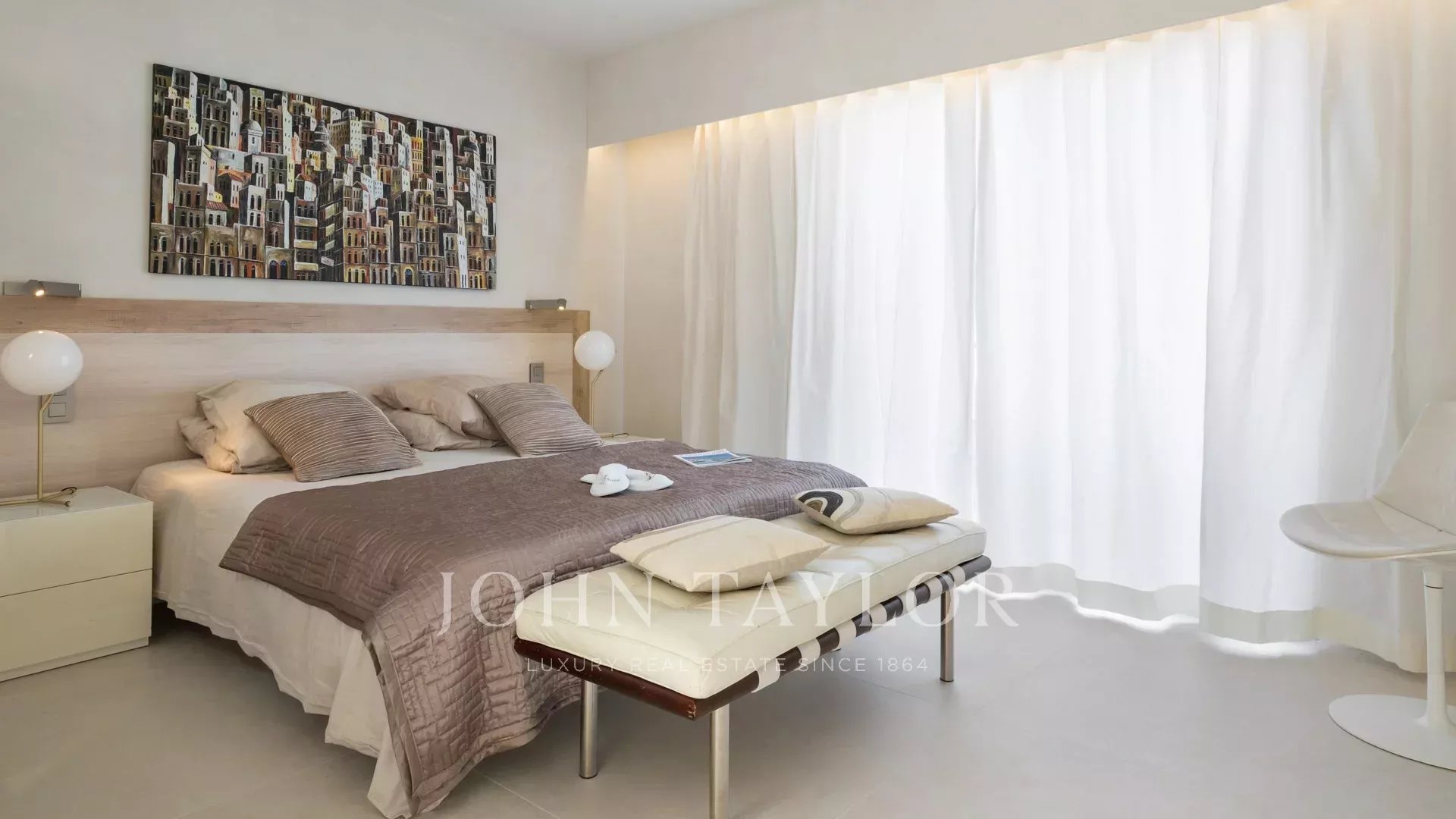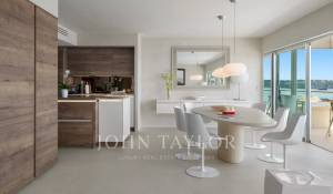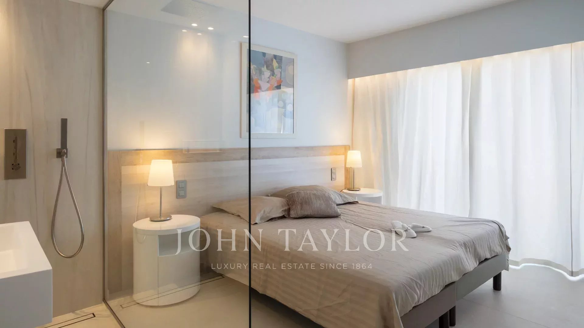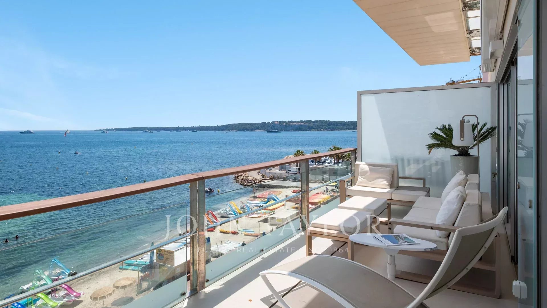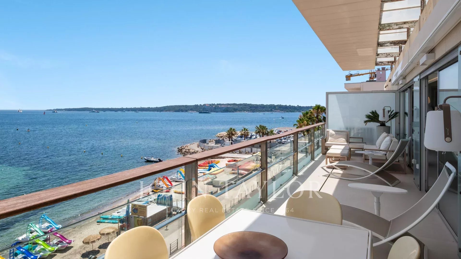 Krásný 4pokojový byt v 5. a posledním patře rezidence na pláži Palm Beach v Cannes s výhledem na Lérinsovy ostrovy a Cap d'Antibes. Nádherný výhled na moře.