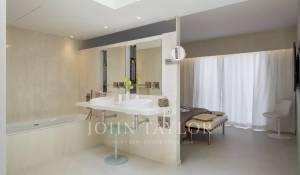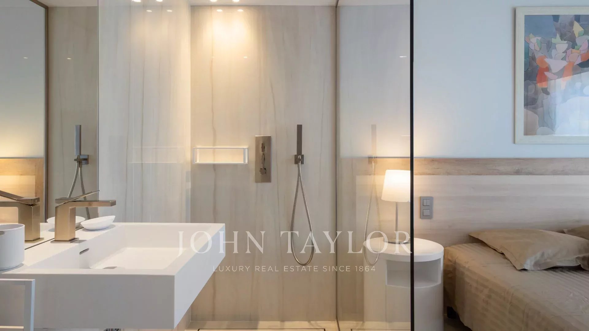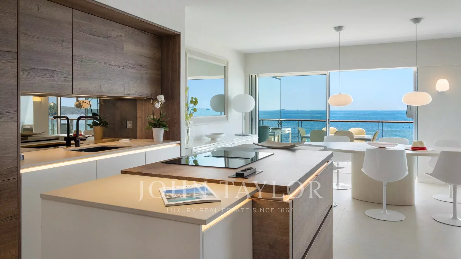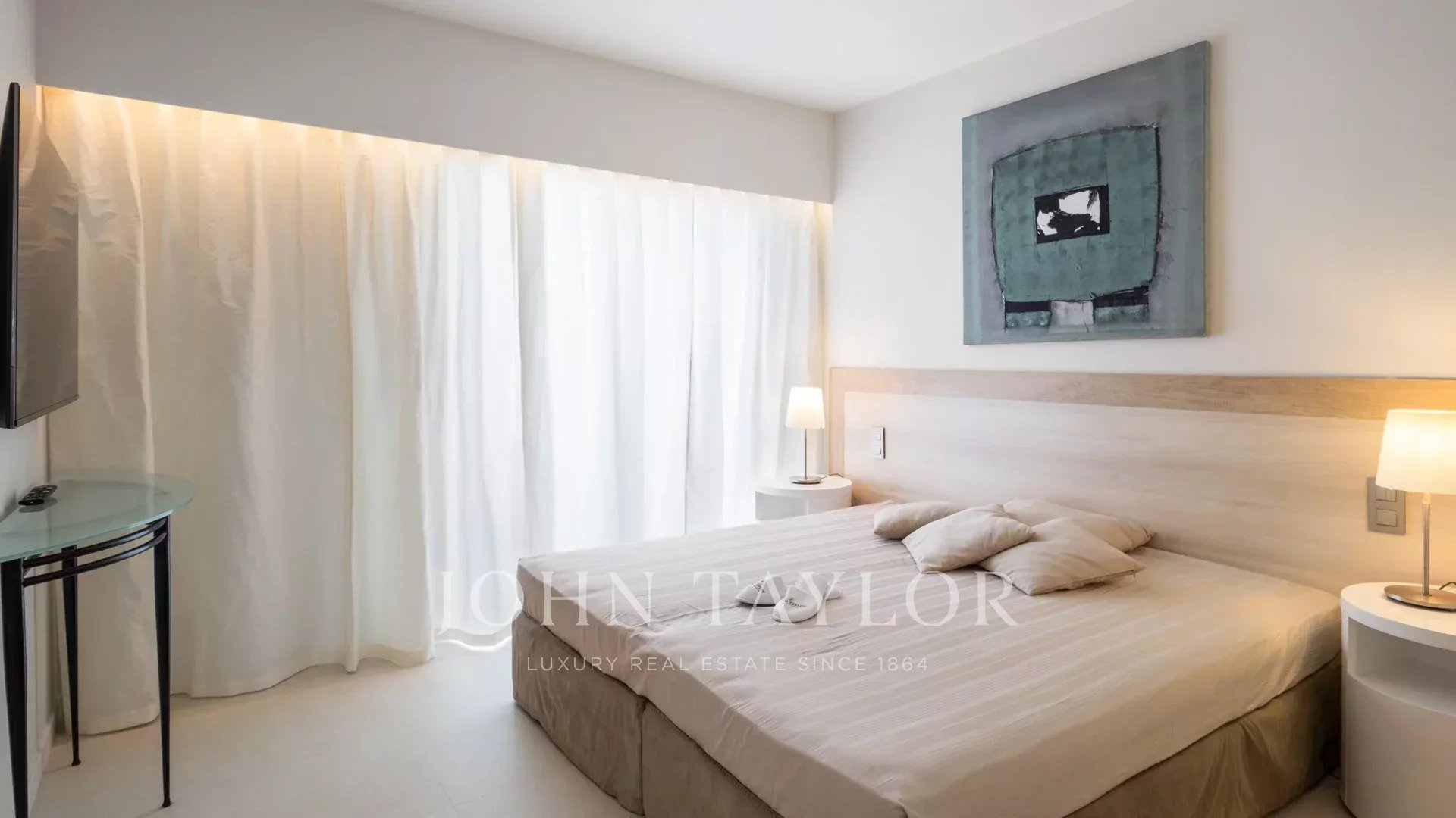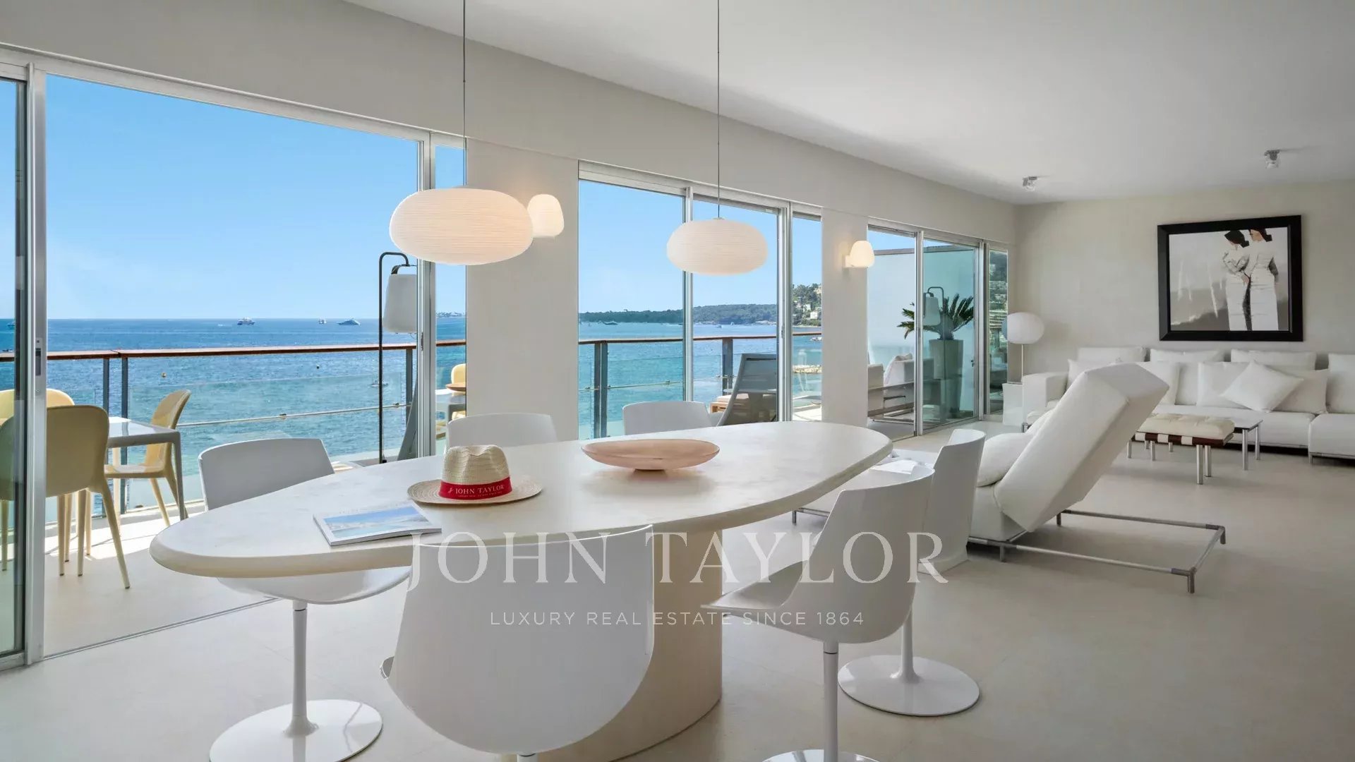 Krásný 4pokojový byt v 5. a posledním patře rezidence na pláži Palm Beach v Cannes s výhledem na Lérinsovy ostrovy a Cap d'Antibes. Nádherný výhled na moře.