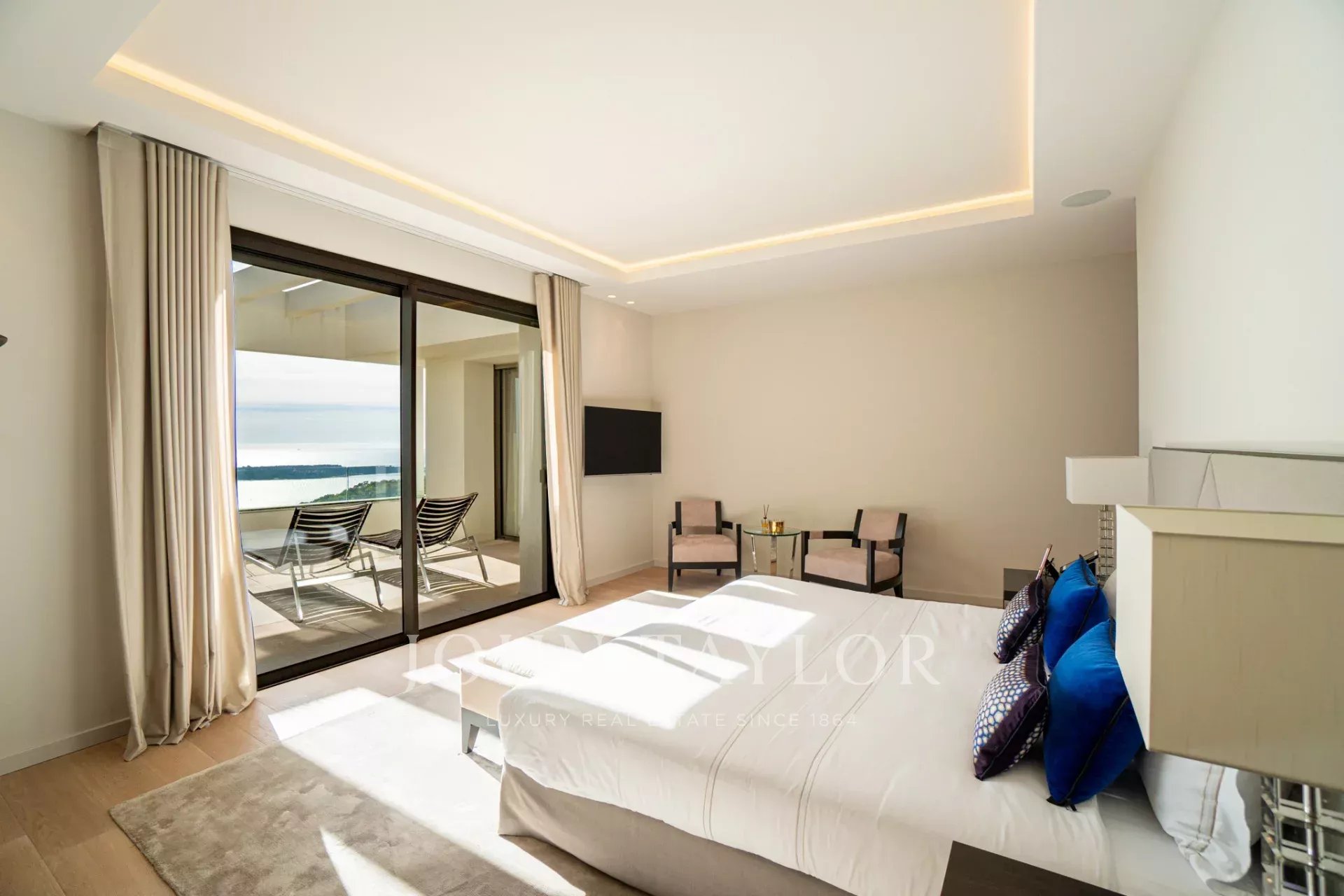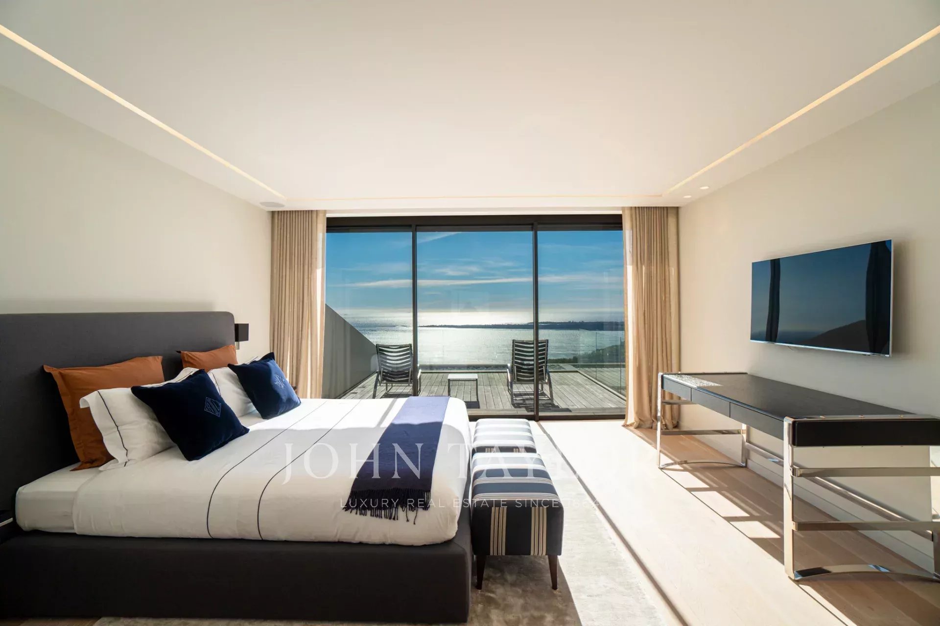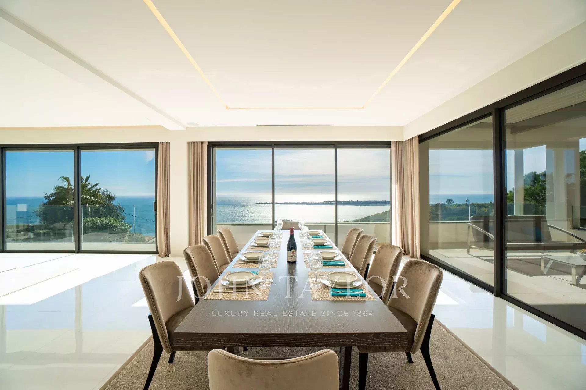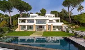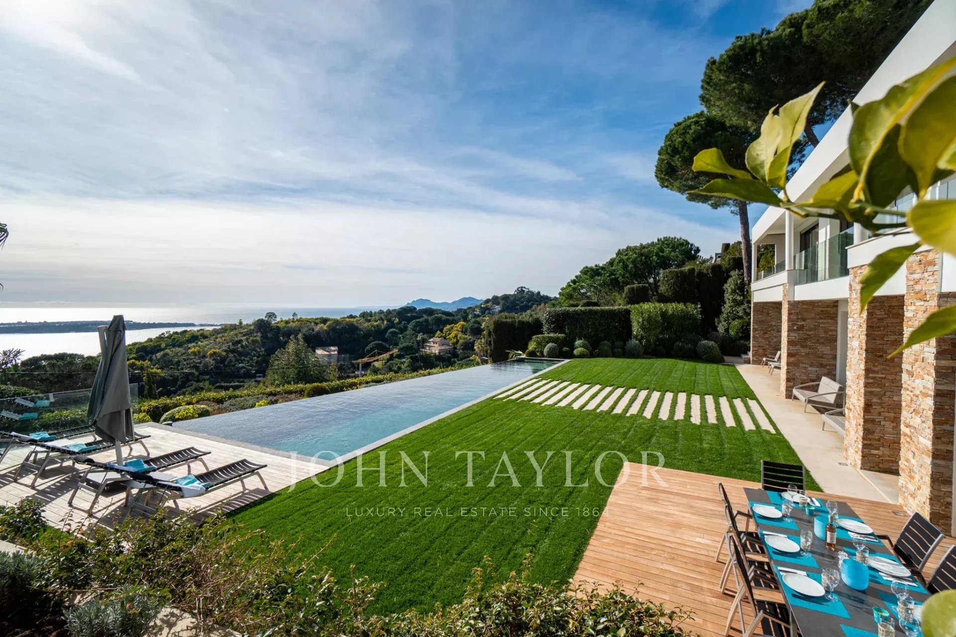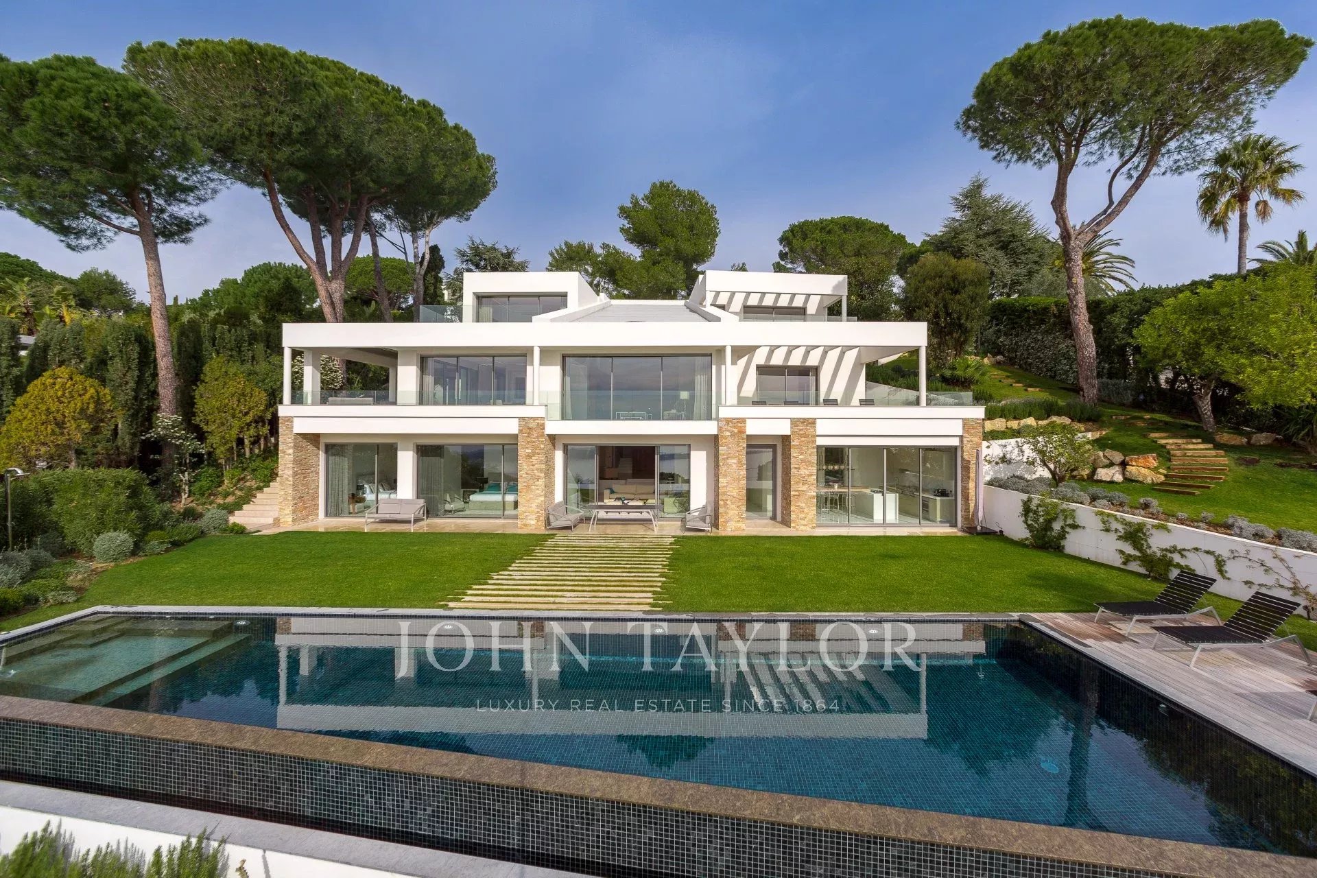 Na výšinách Cannes, v dominantní poloze s panoramatickým výhledem na moře, ostrovy Lérins, Cap d'Antibes a masiv Estérel, krásná nová klimatizovaná vila v moderním stylu s vysoce kvalitními prvky, která nabízí přibližně 630 m² obytné plochy na krásném pozemku o rozloze 2 000 m².