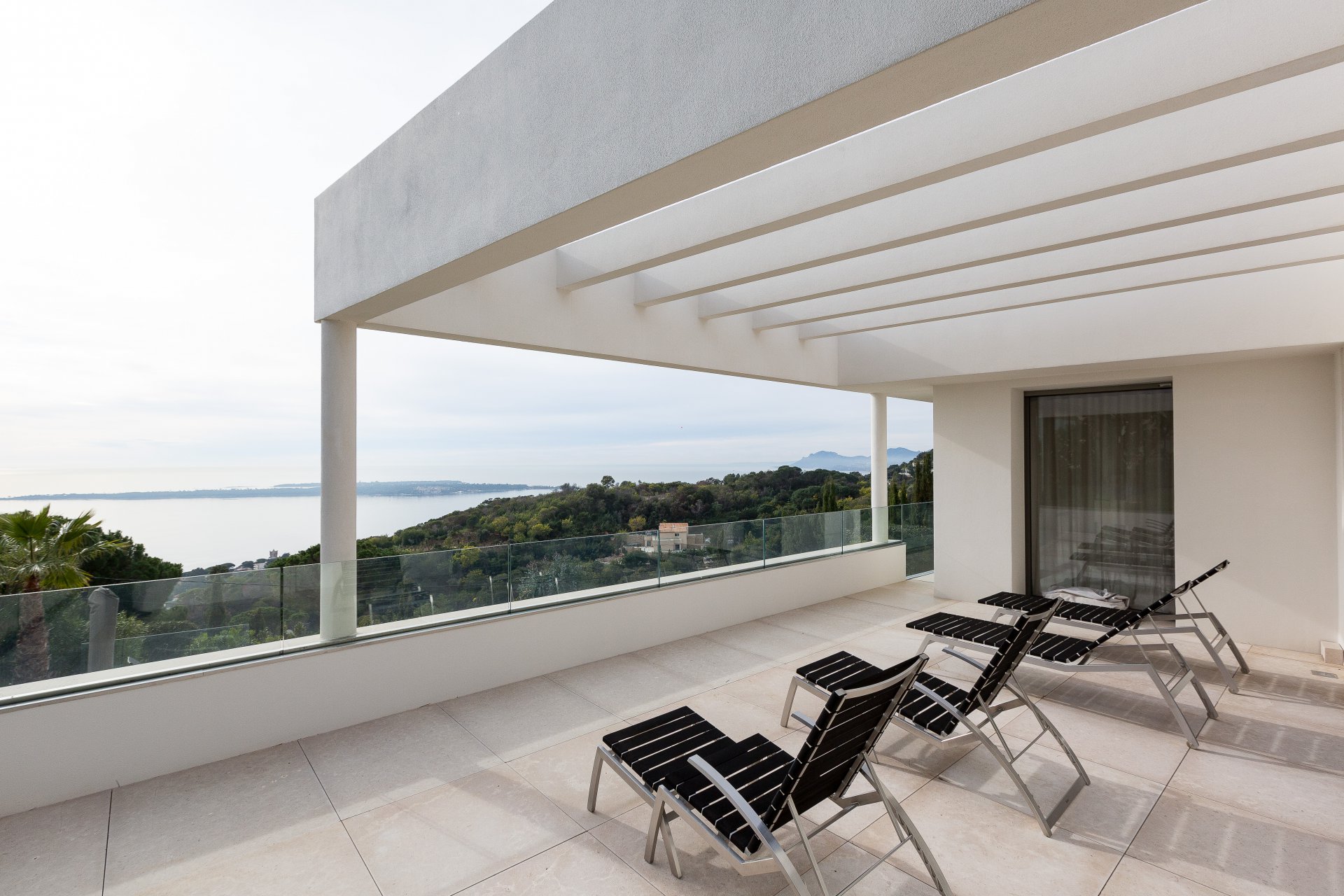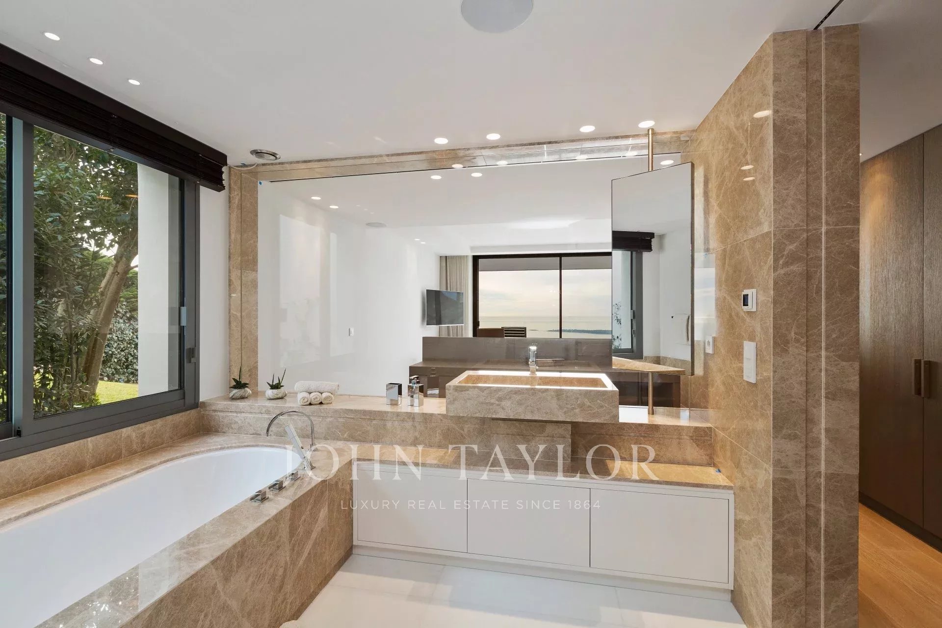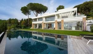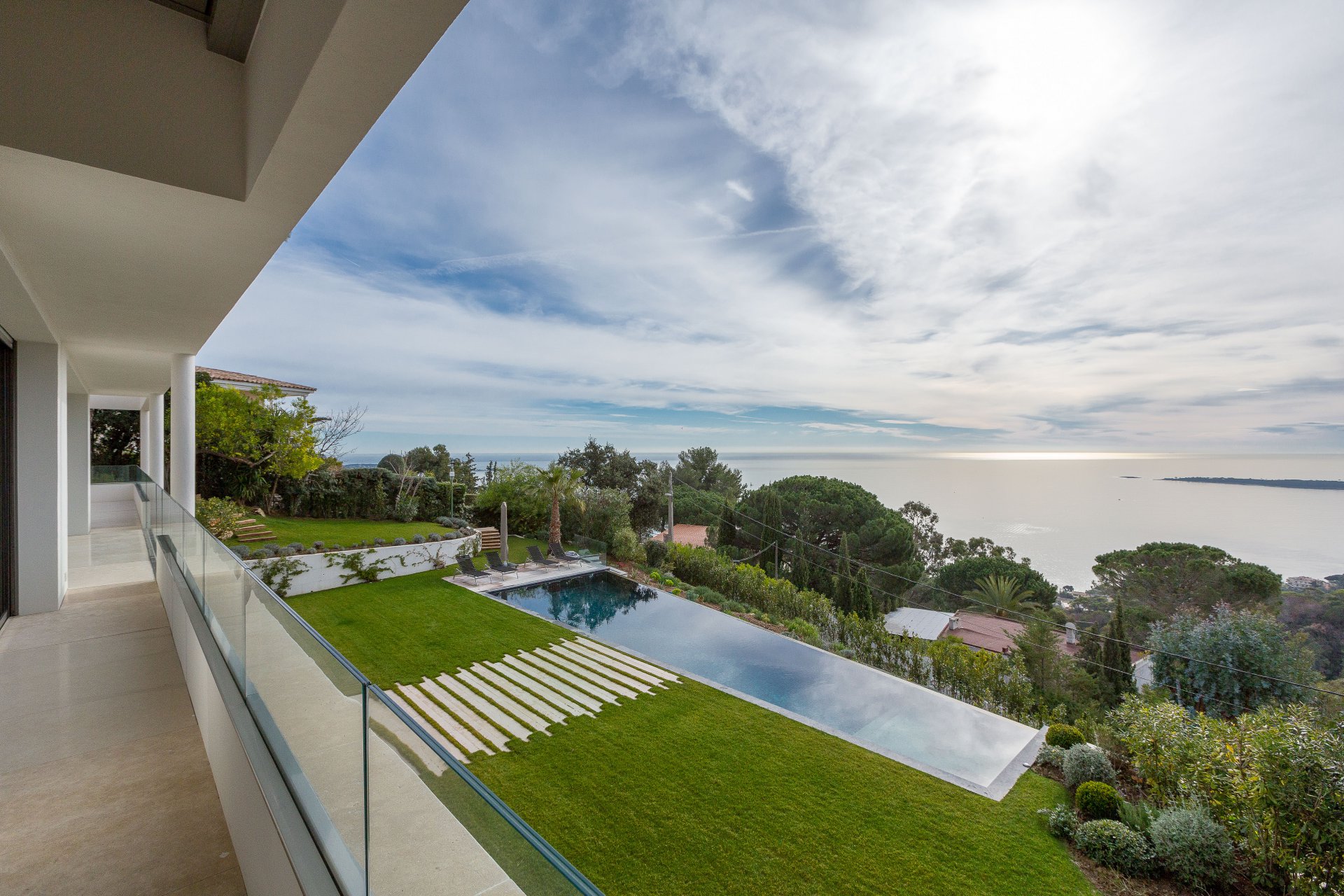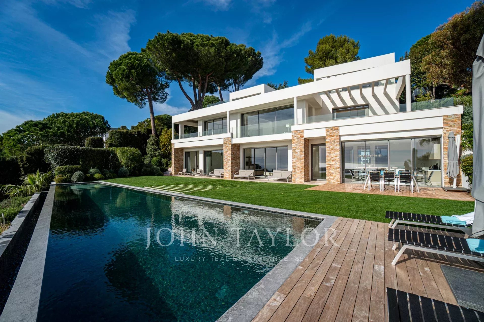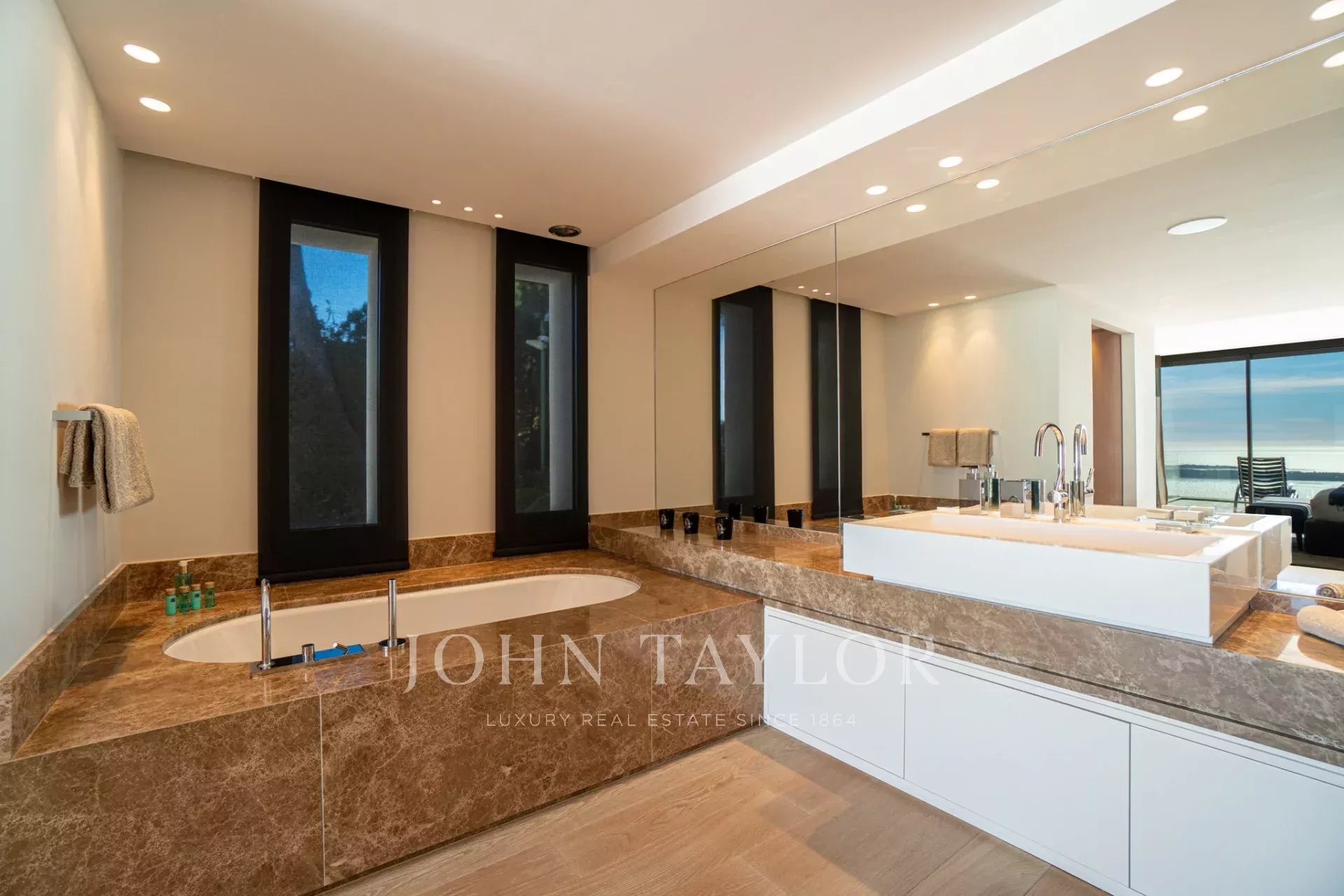 Na výšinách Cannes, v dominantní poloze s panoramatickým výhledem na moře, ostrovy Lérins, Cap d'Antibes a masiv Estérel, krásná nová klimatizovaná vila v moderním stylu s vysoce kvalitními prvky, která nabízí přibližně 630 m² obytné plochy na krásném pozemku o rozloze 2 000 m².