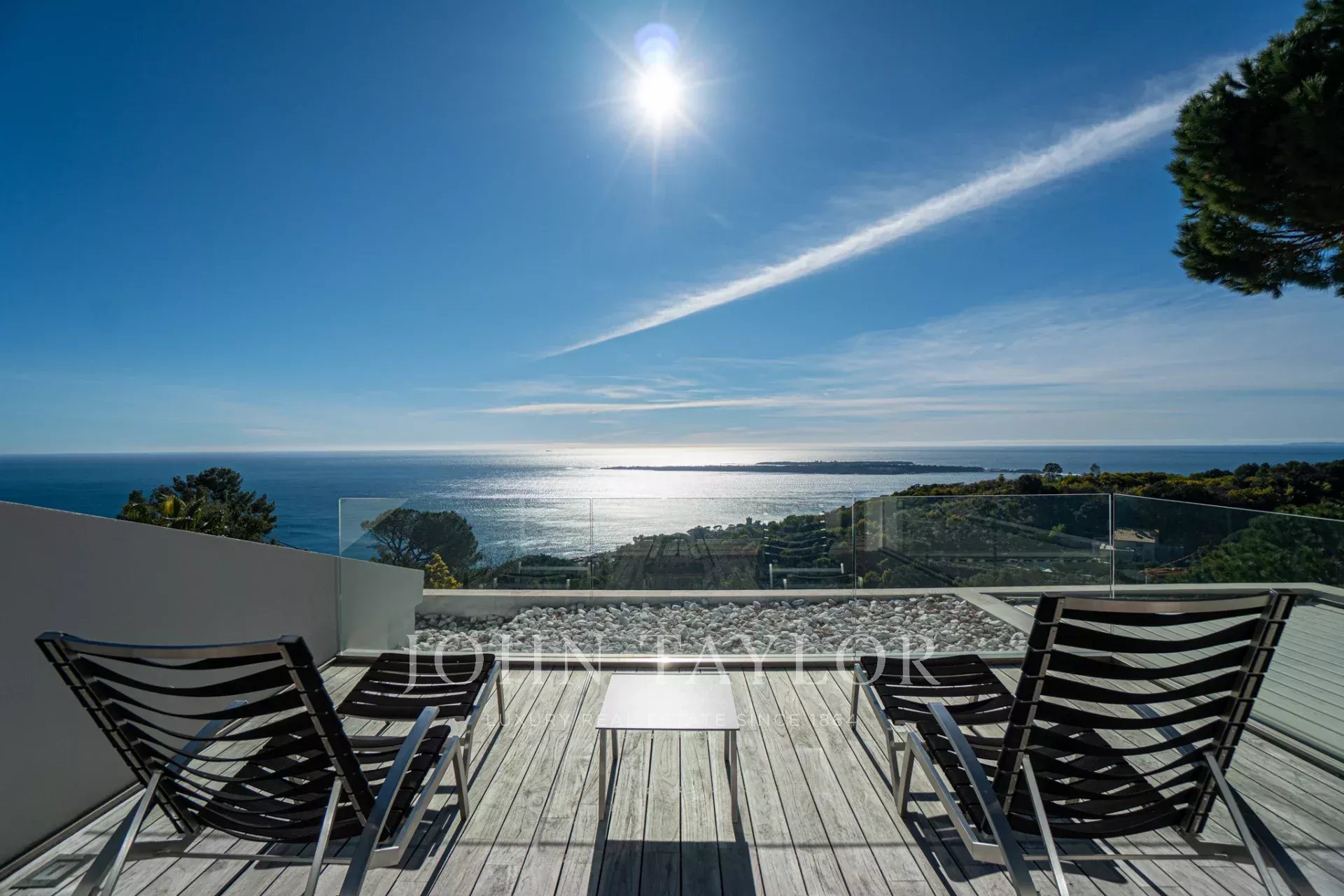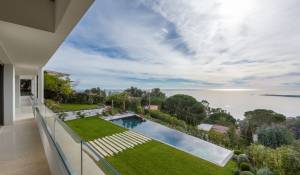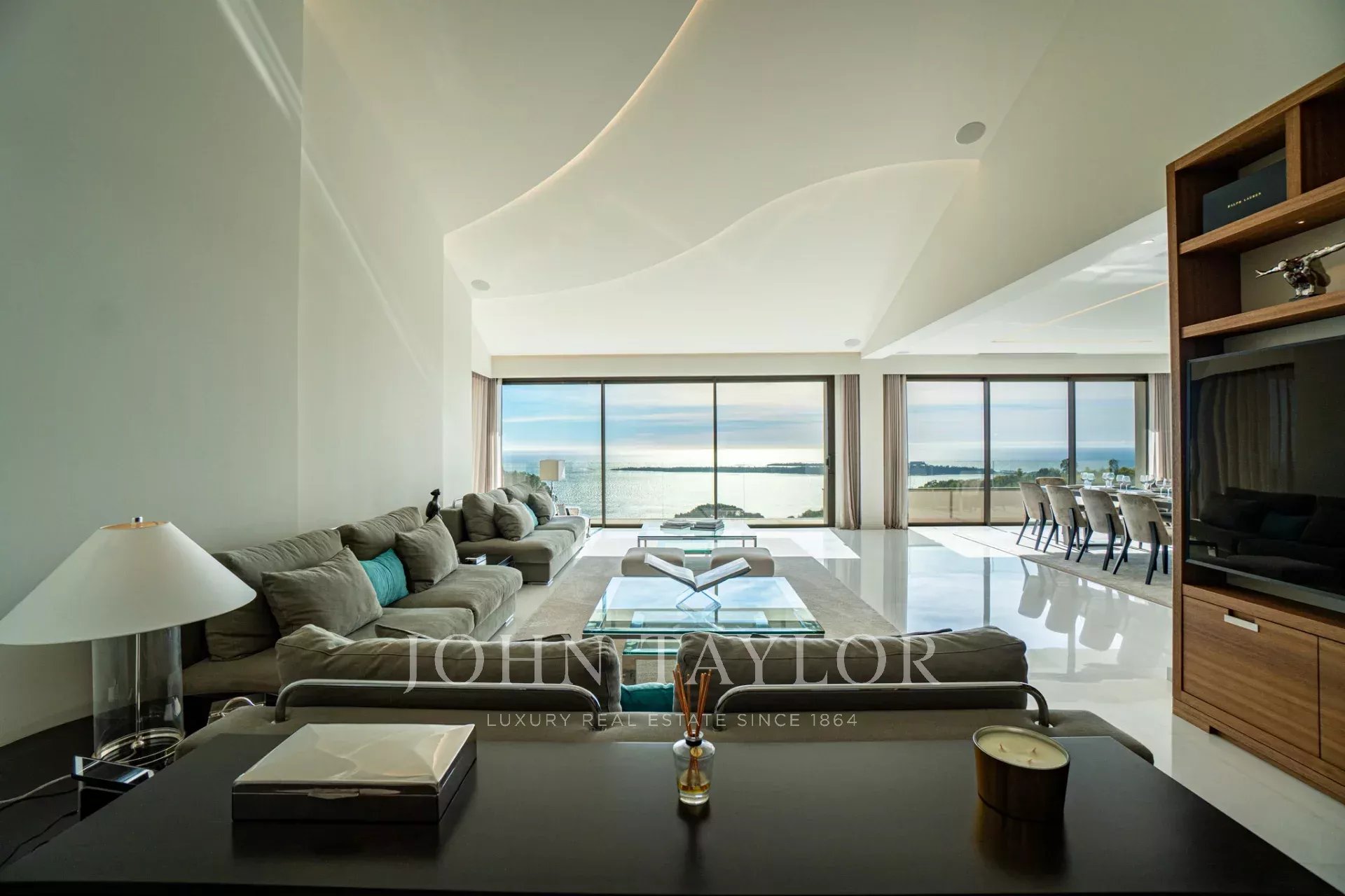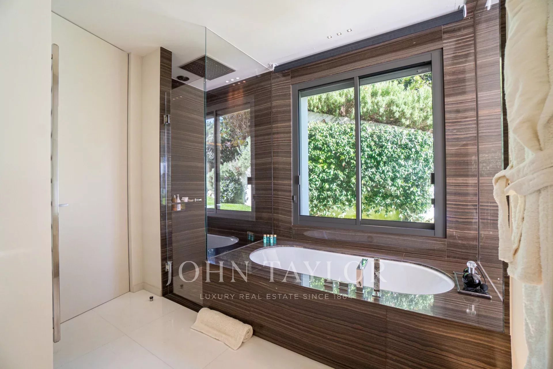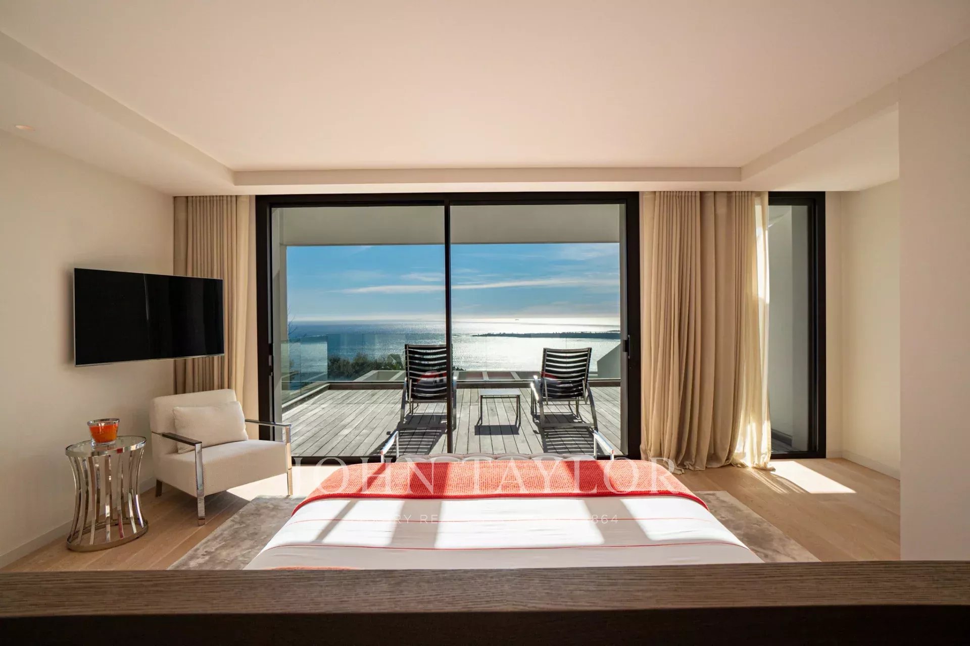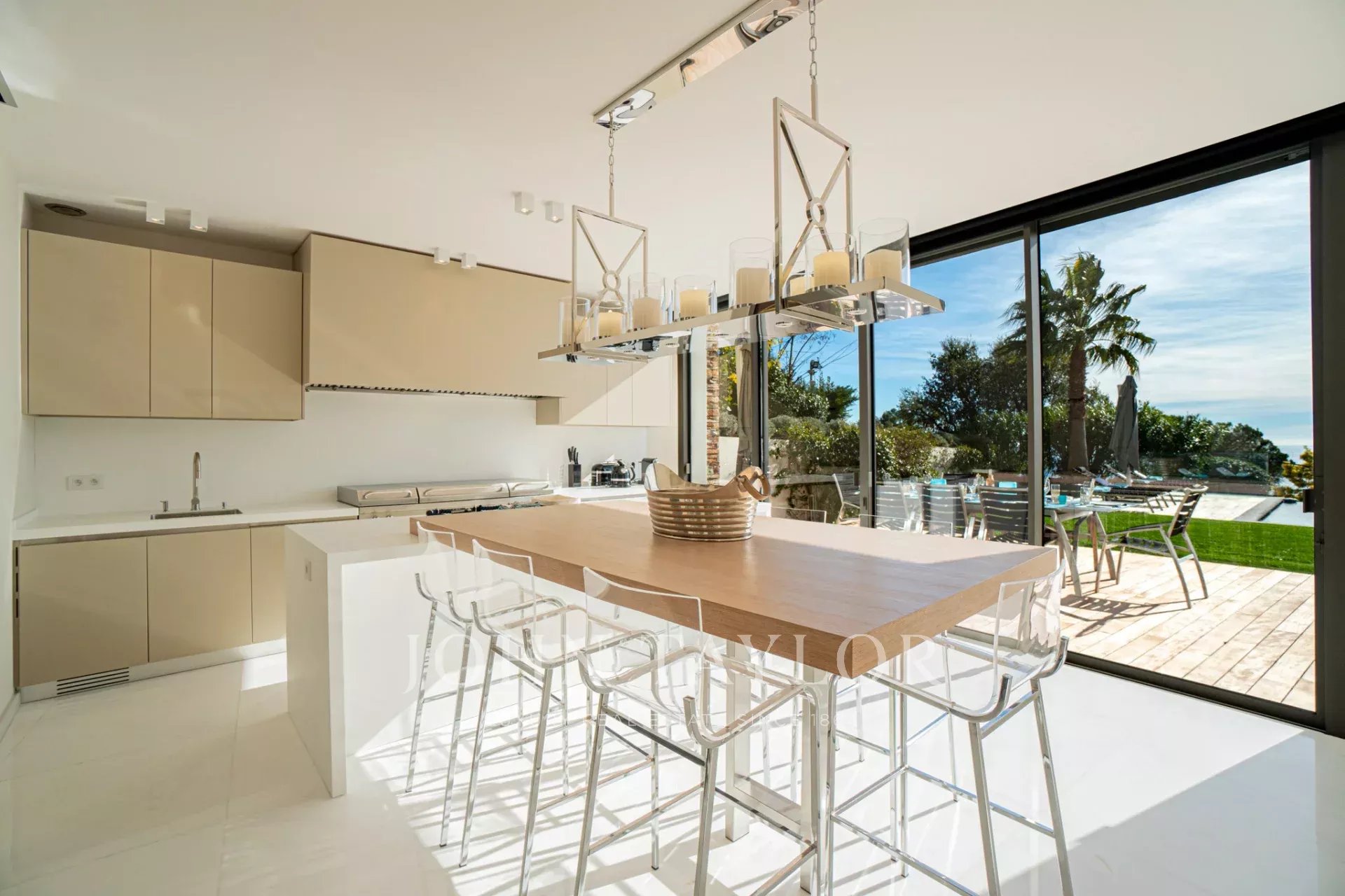 Na výšinách Cannes, v dominantní poloze s panoramatickým výhledem na moře, ostrovy Lérins, Cap d'Antibes a masiv Estérel, krásná nová klimatizovaná vila v moderním stylu s vysoce kvalitními prvky, která nabízí přibližně 630 m² obytné plochy na krásném pozemku o rozloze 2 000 m².