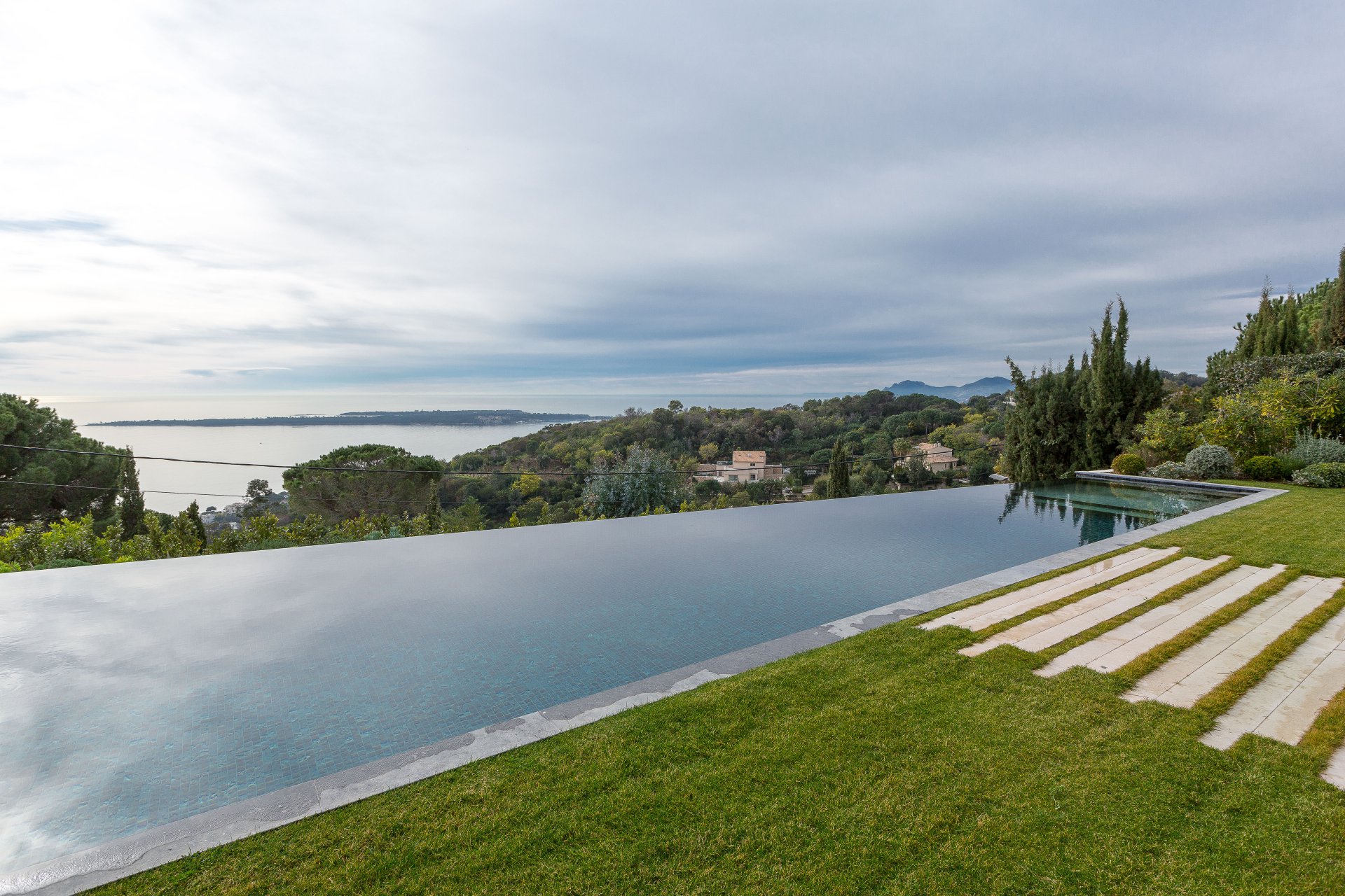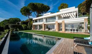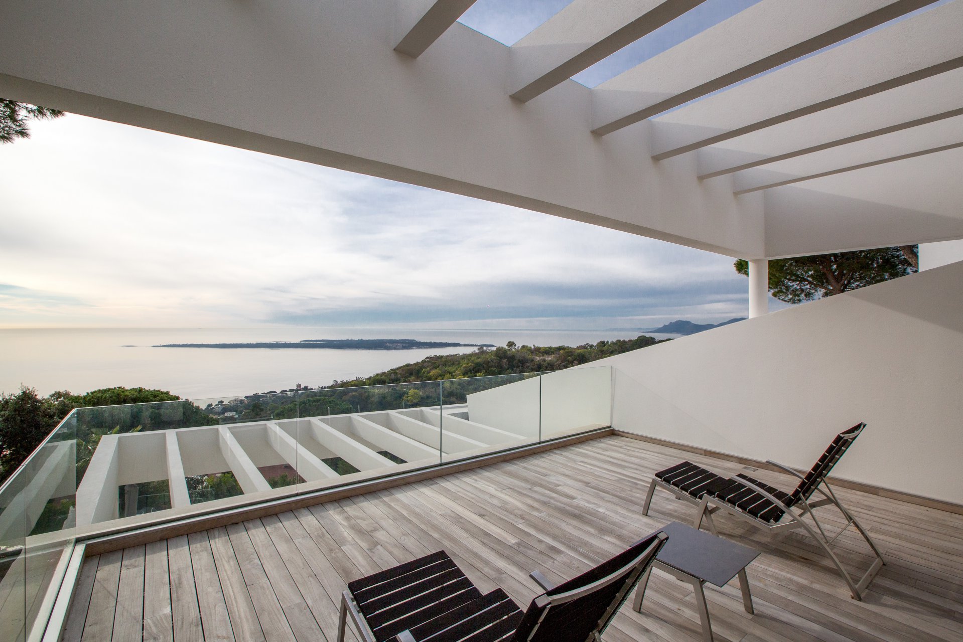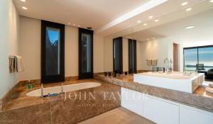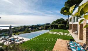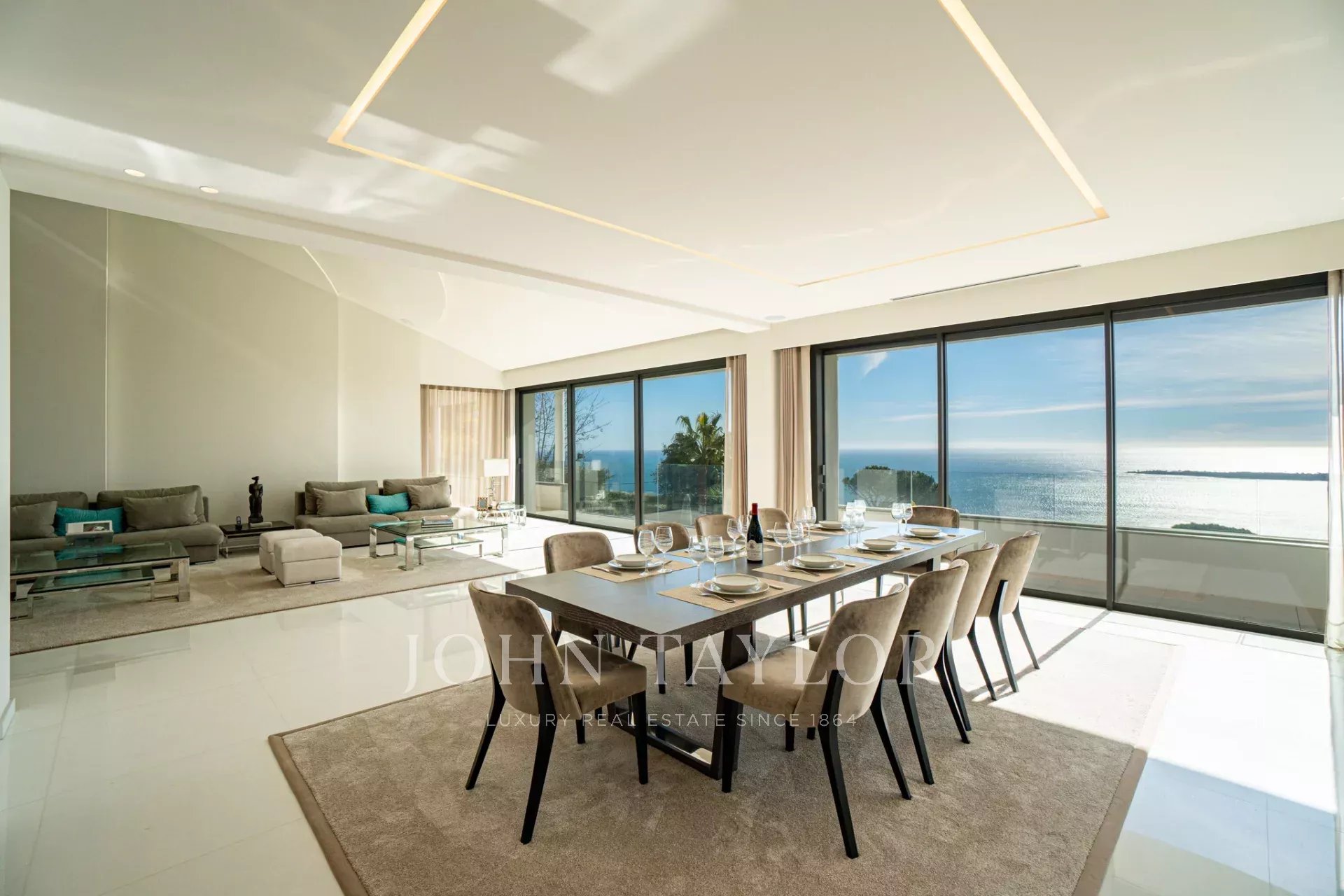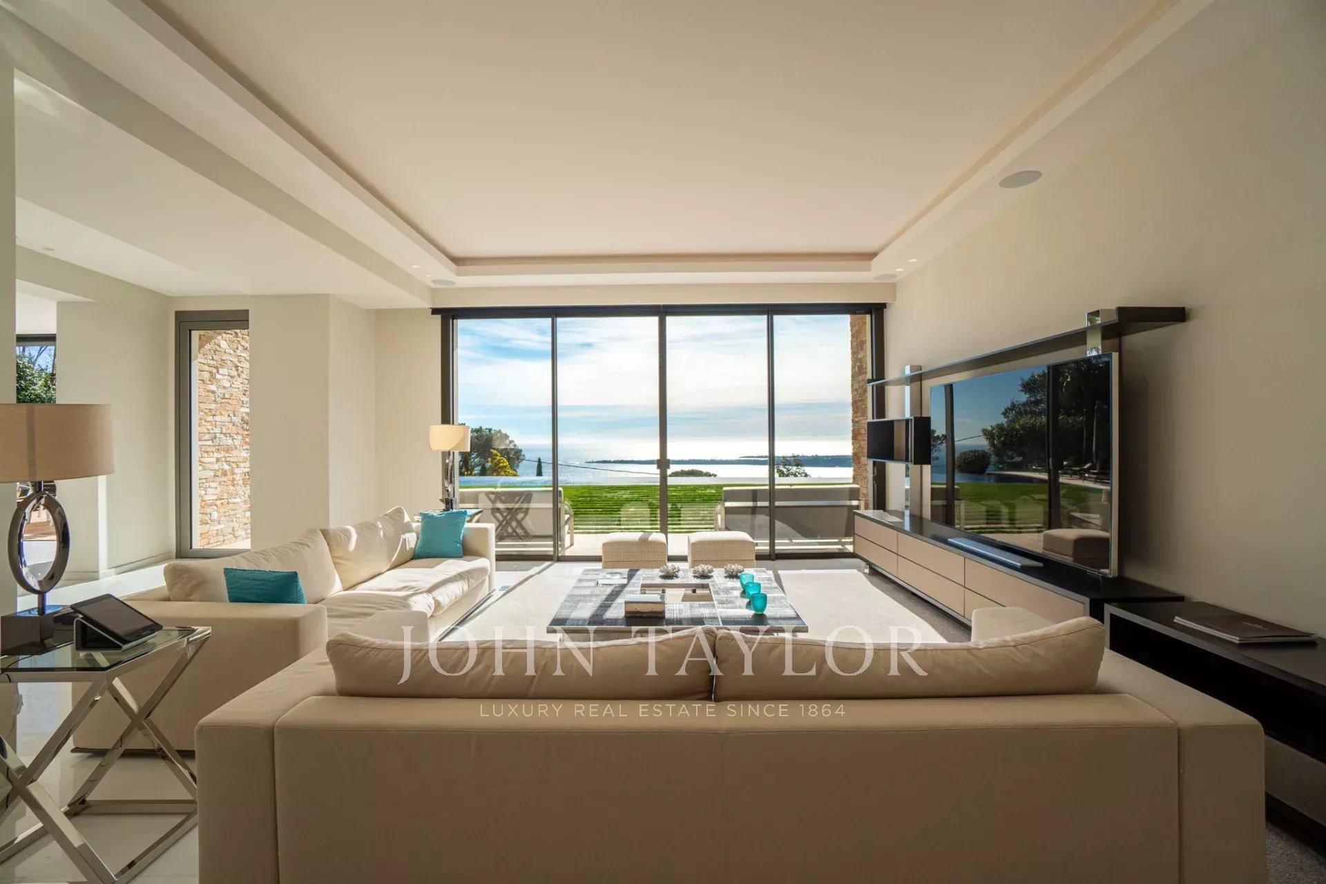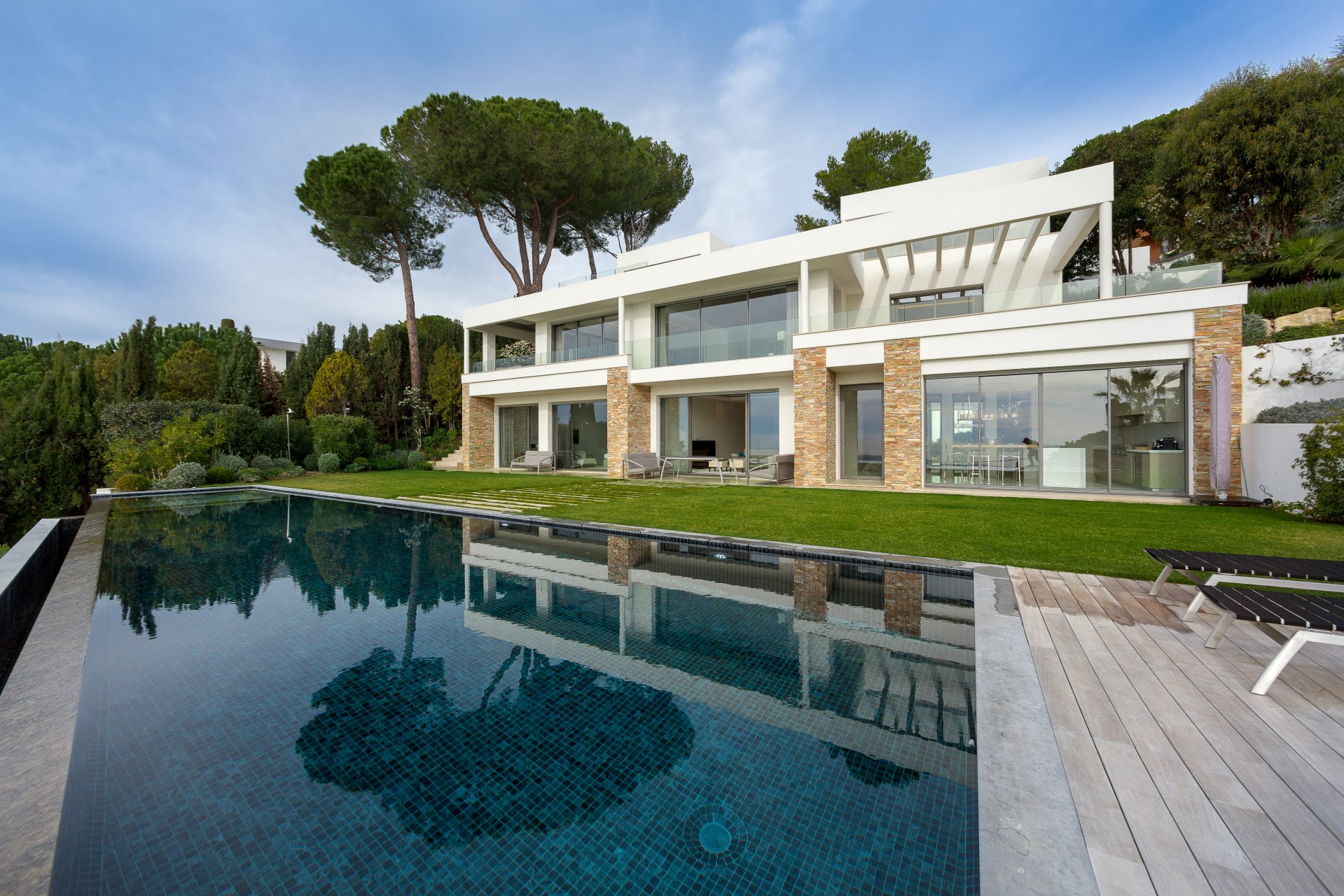 Na výšinách Cannes, v dominantní poloze s panoramatickým výhledem na moře, ostrovy Lérins, Cap d'Antibes a masiv Estérel, krásná nová klimatizovaná vila v moderním stylu s vysoce kvalitními prvky, která nabízí přibližně 630 m² obytné plochy na krásném pozemku o rozloze 2 000 m².