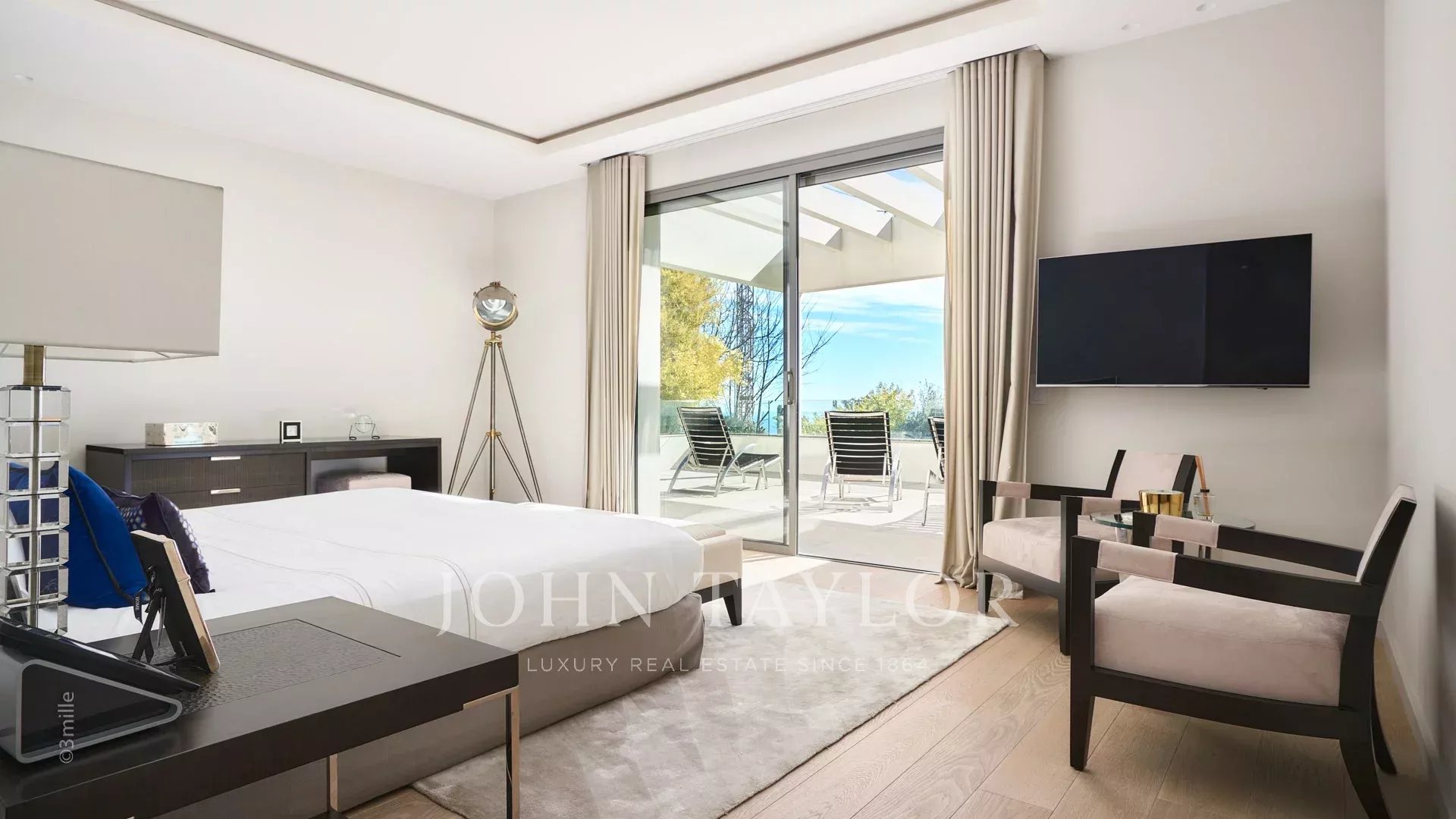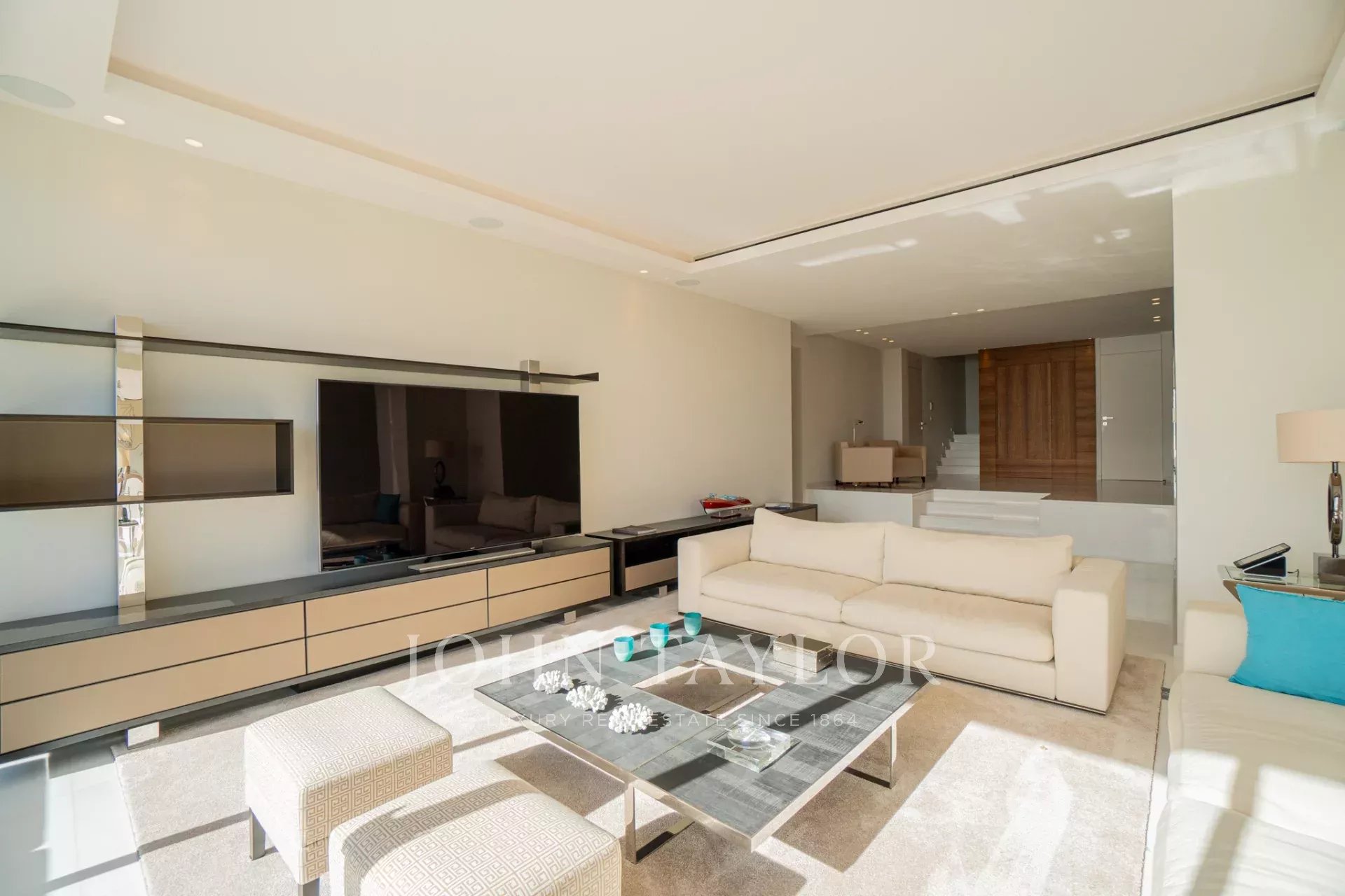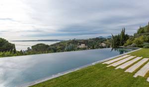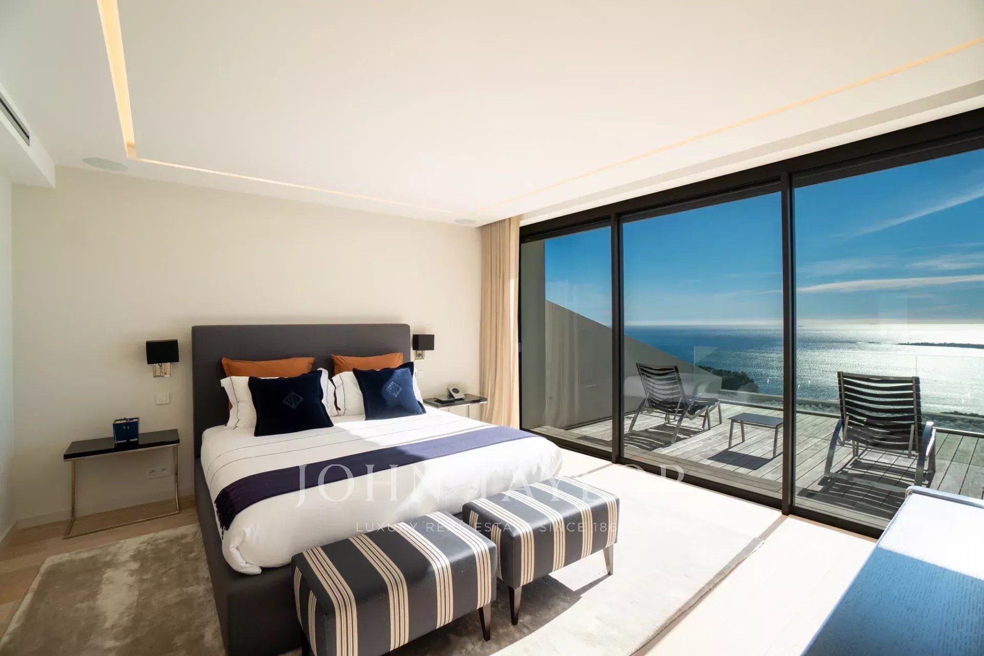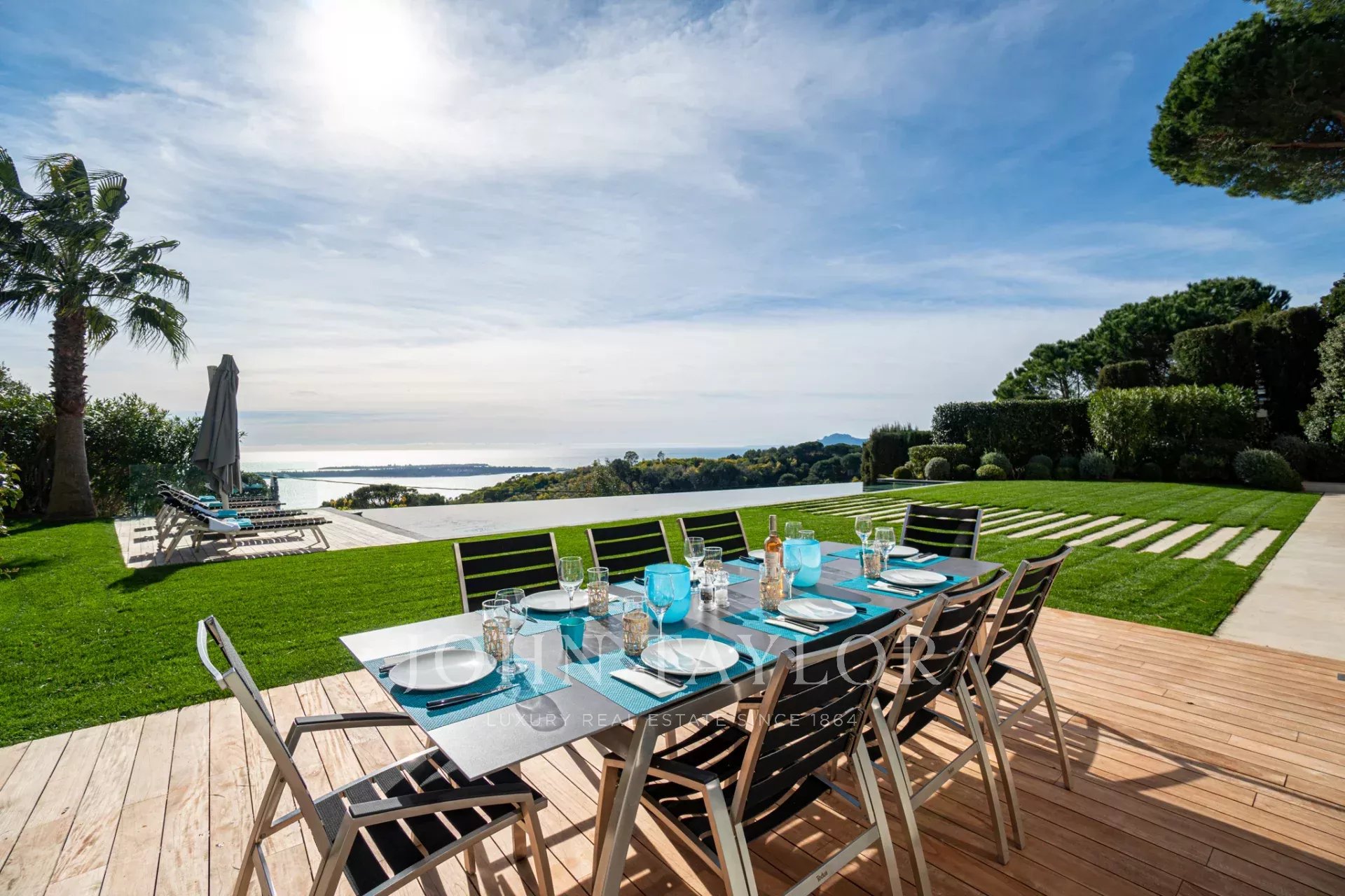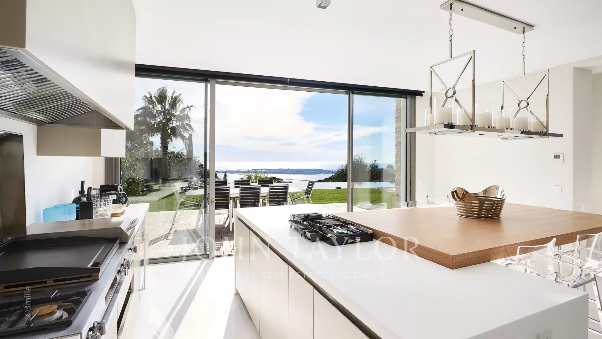 Na výšinách Cannes, v dominantní poloze s panoramatickým výhledem na moře, ostrovy Lérins, Cap d'Antibes a masiv Estérel, krásná nová klimatizovaná vila v moderním stylu s vysoce kvalitními prvky, která nabízí přibližně 630 m² obytné plochy na krásném pozemku o rozloze 2 000 m².