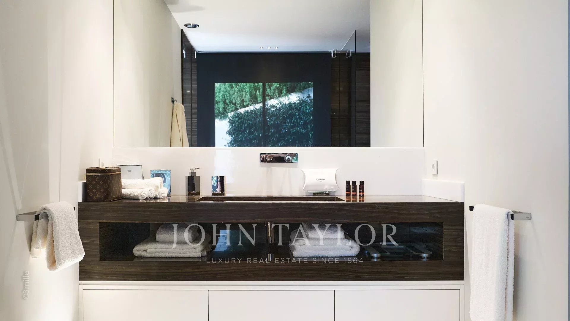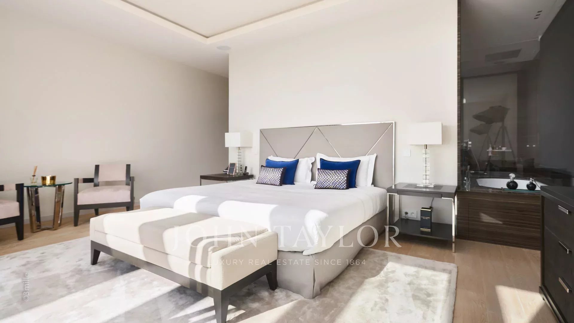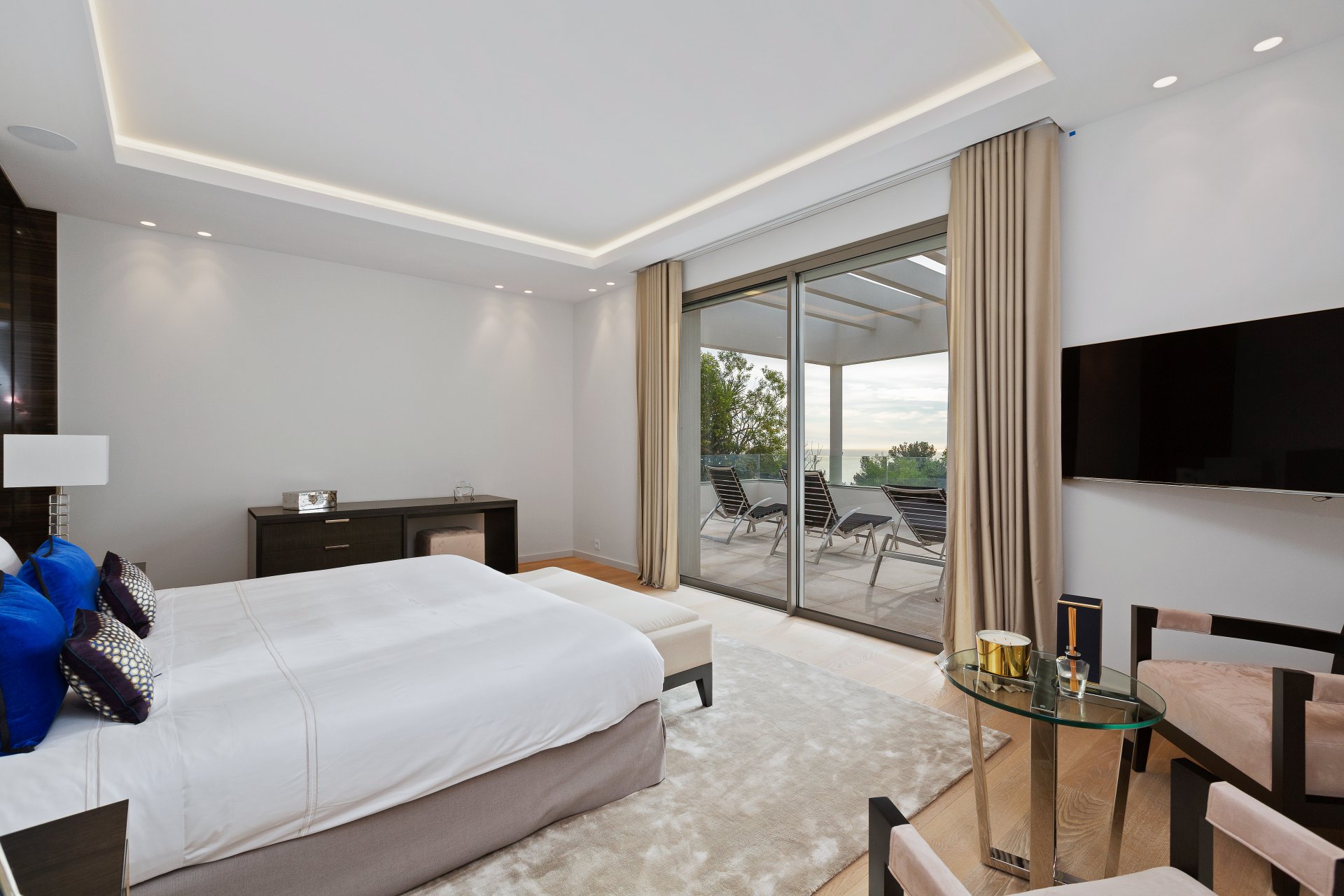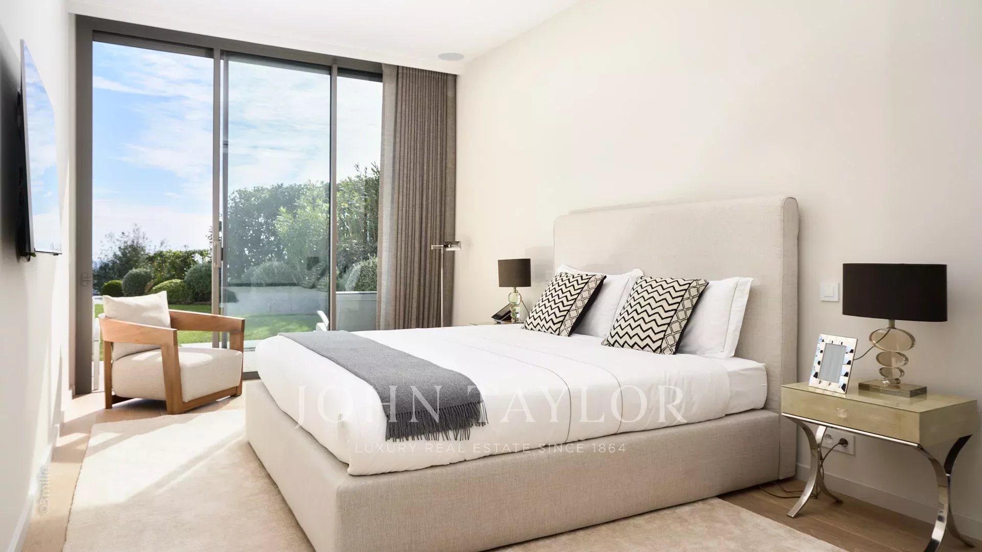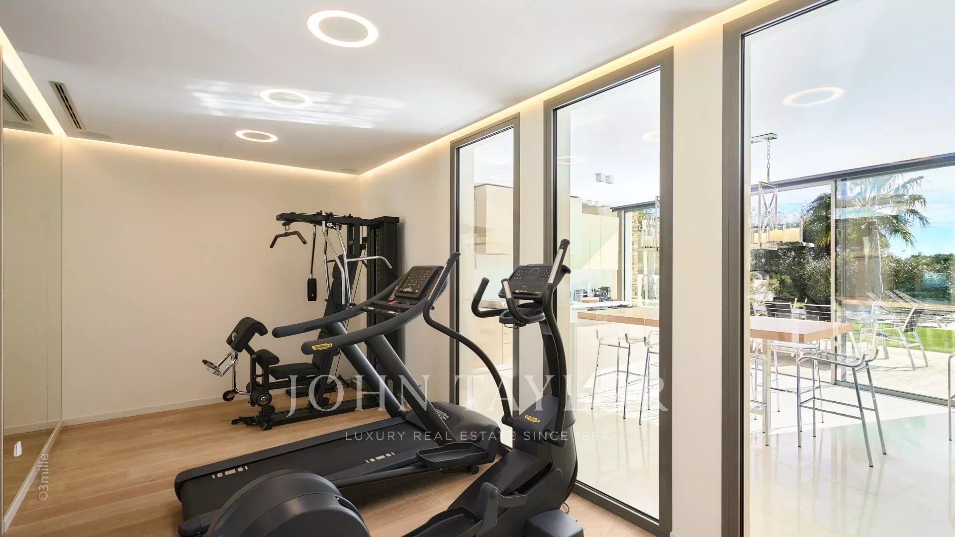 Na výšinách Cannes, v dominantní poloze s panoramatickým výhledem na moře, ostrovy Lérins, Cap d'Antibes a masiv Estérel, krásná nová klimatizovaná vila v moderním stylu s vysoce kvalitními prvky, která nabízí přibližně 630 m² obytné plochy na krásném pozemku o rozloze 2 000 m².