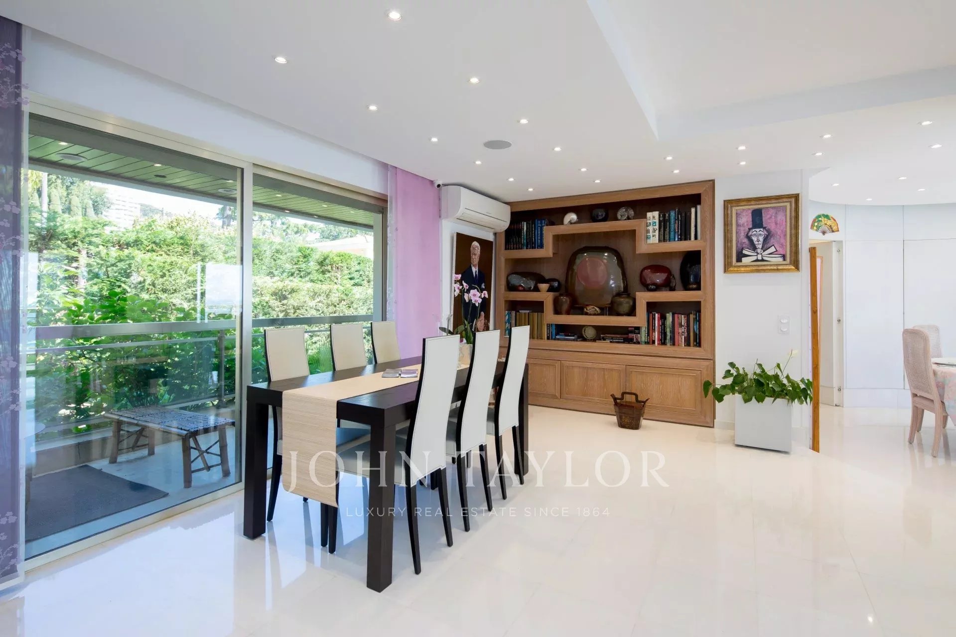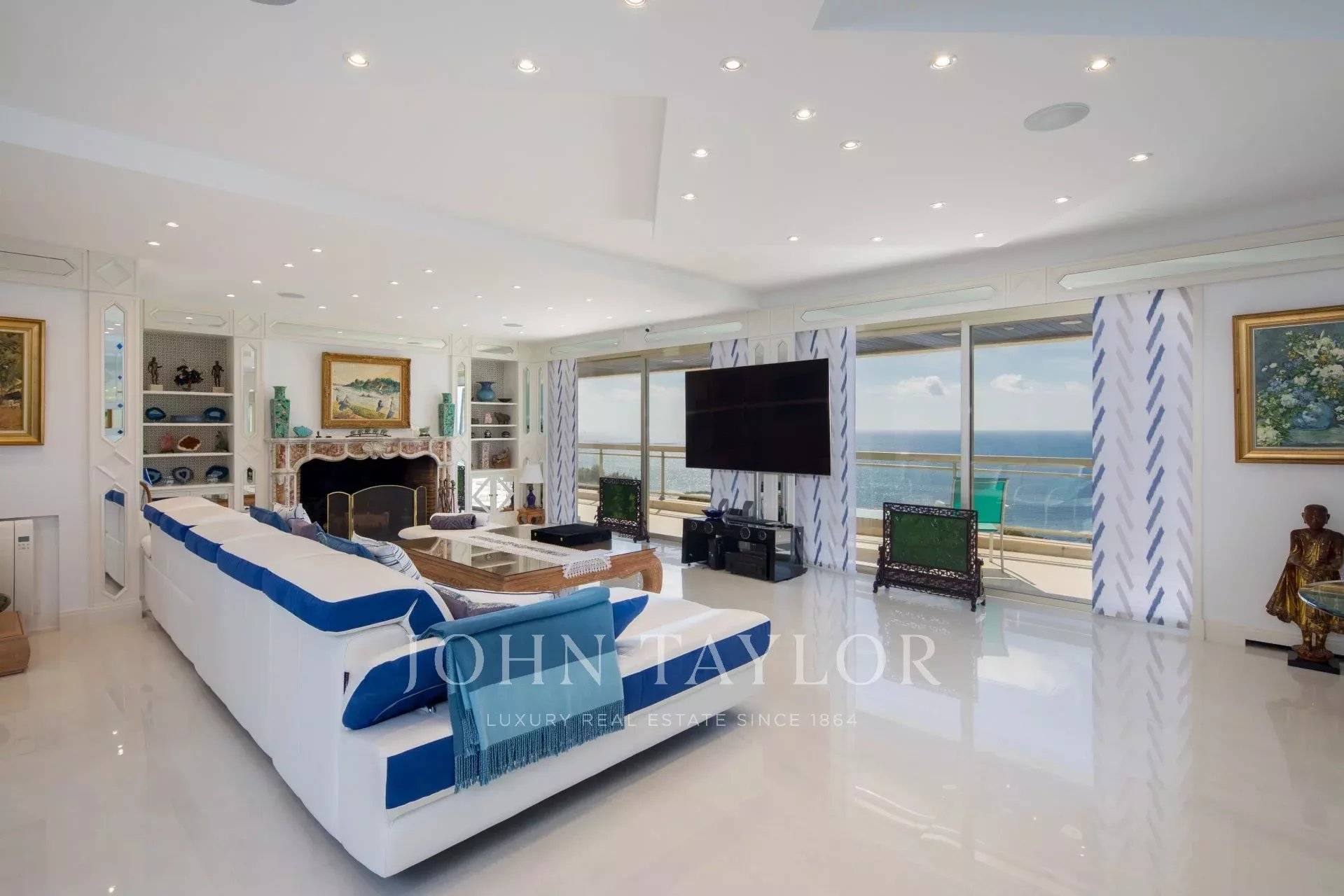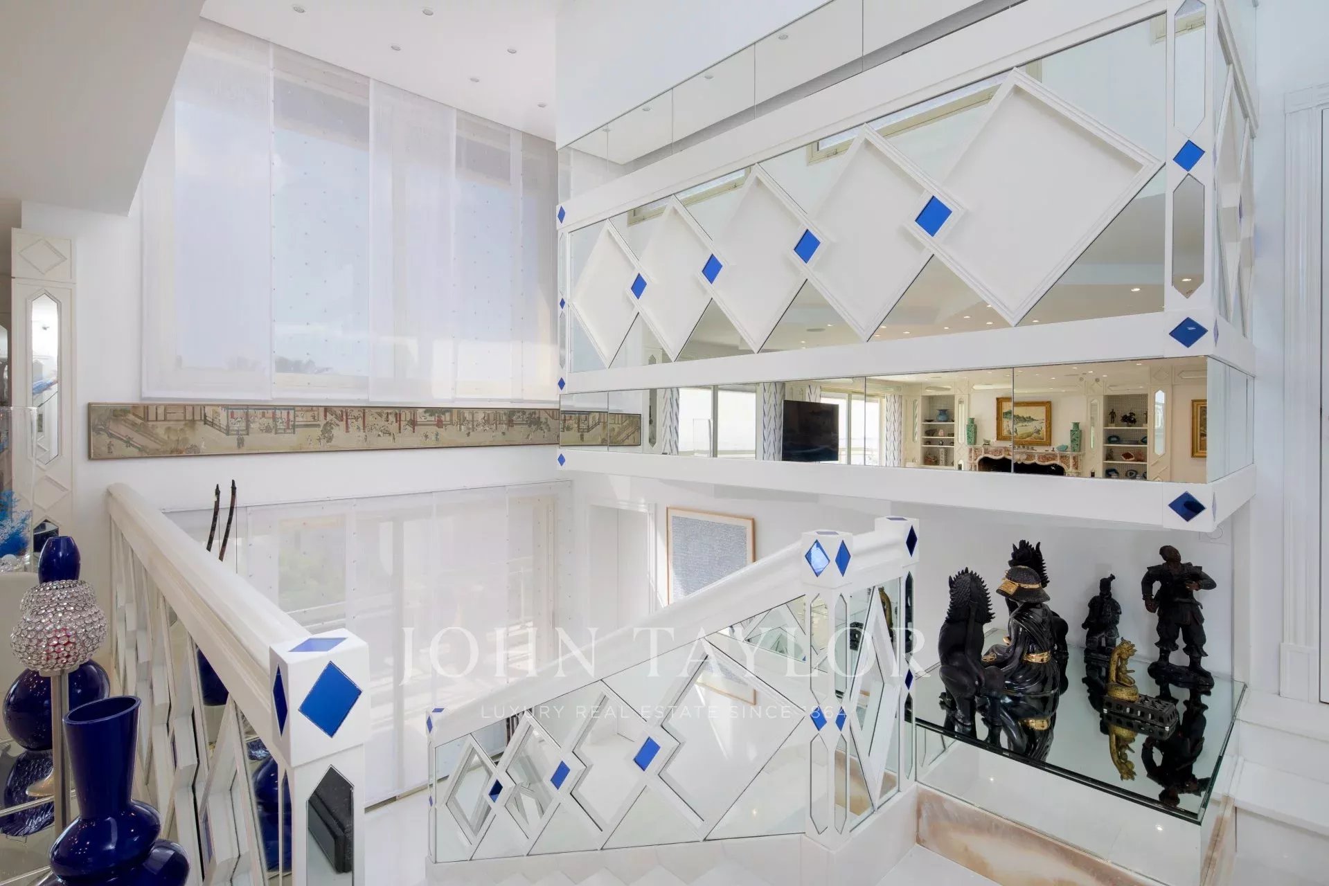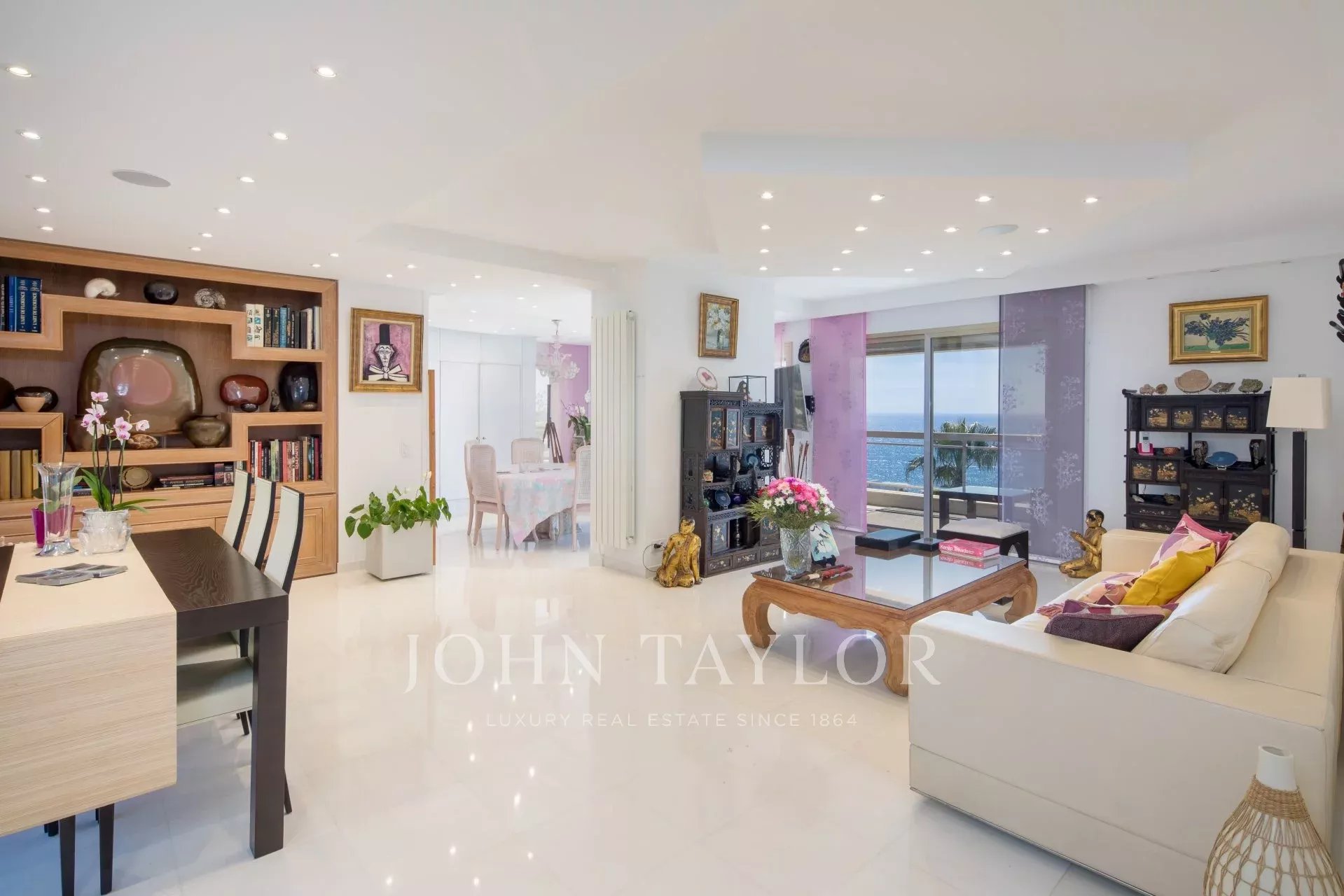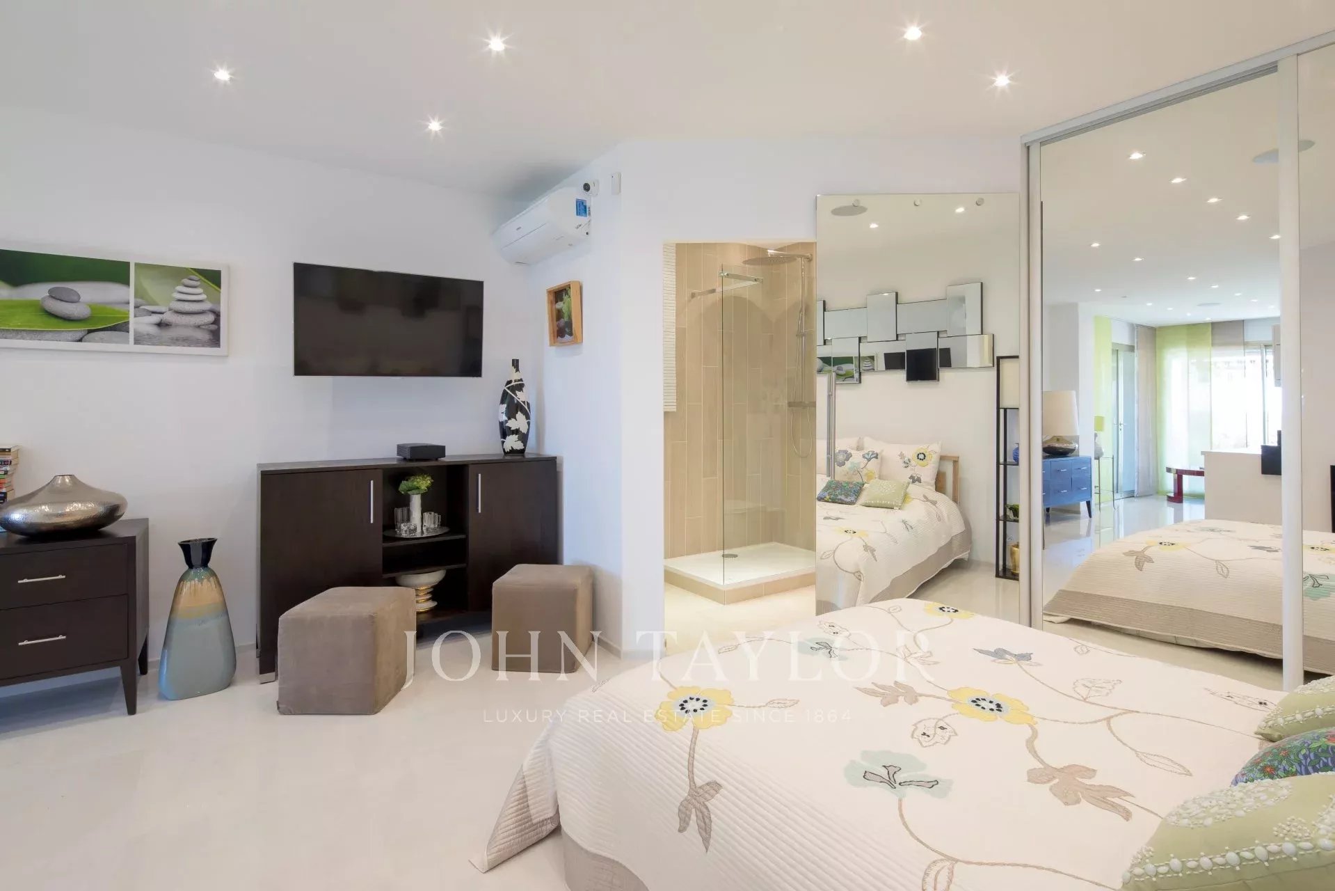 Vstupní hala vedoucí do dvoulůžkového obývacího pokoje/jídelny s výhledem na terasu s výhledem na záliv Cannes a ostrovy Iles de Lérins.