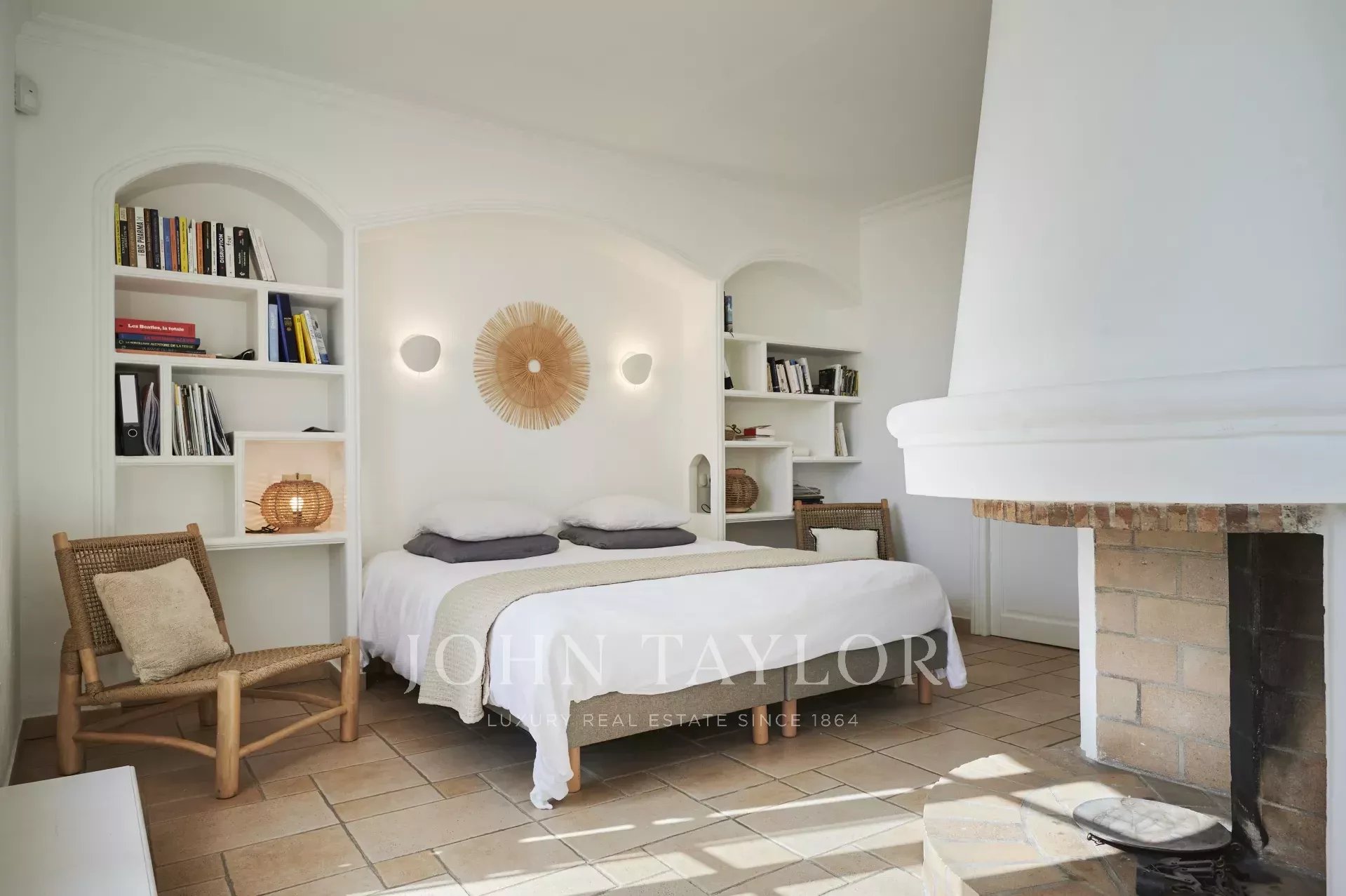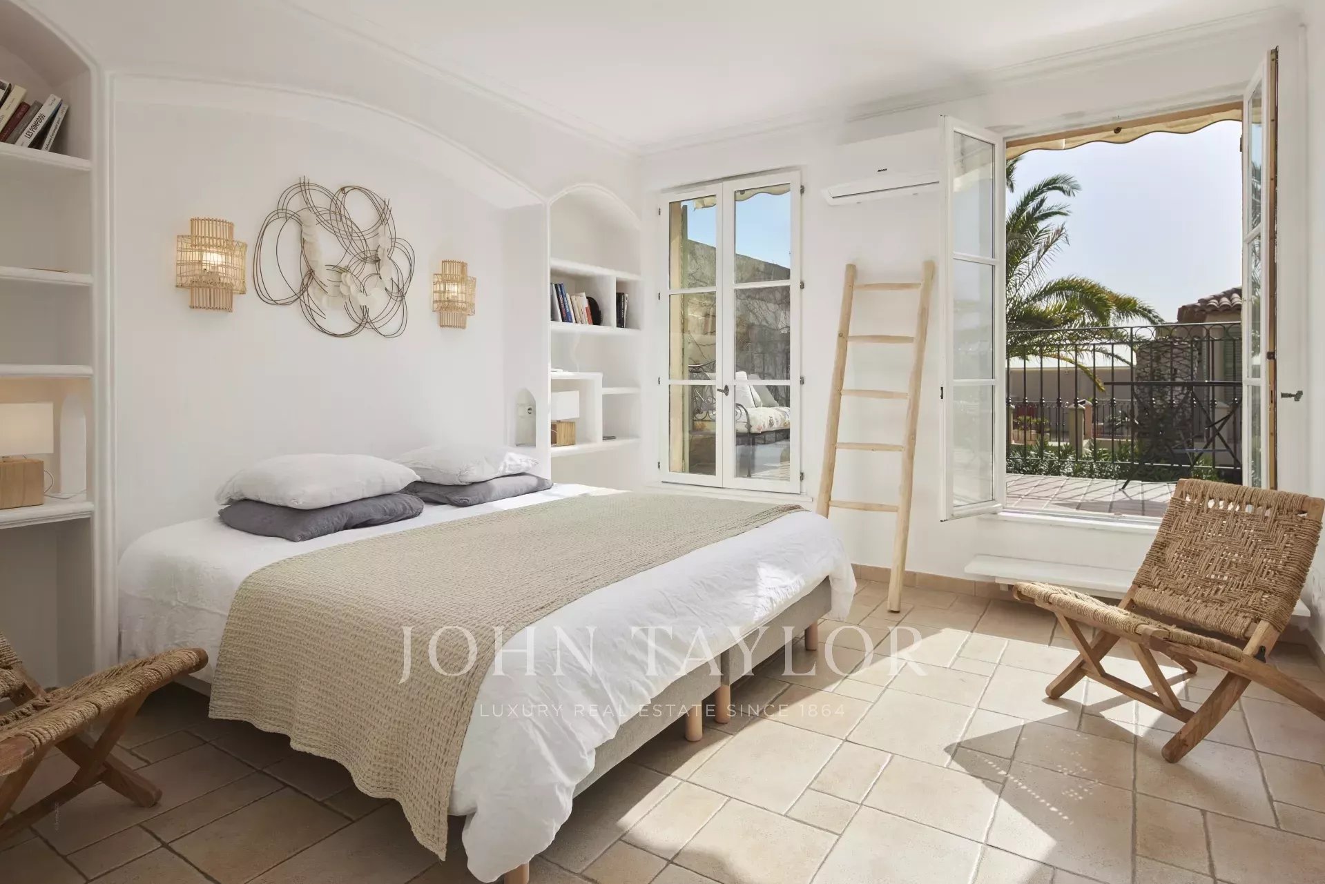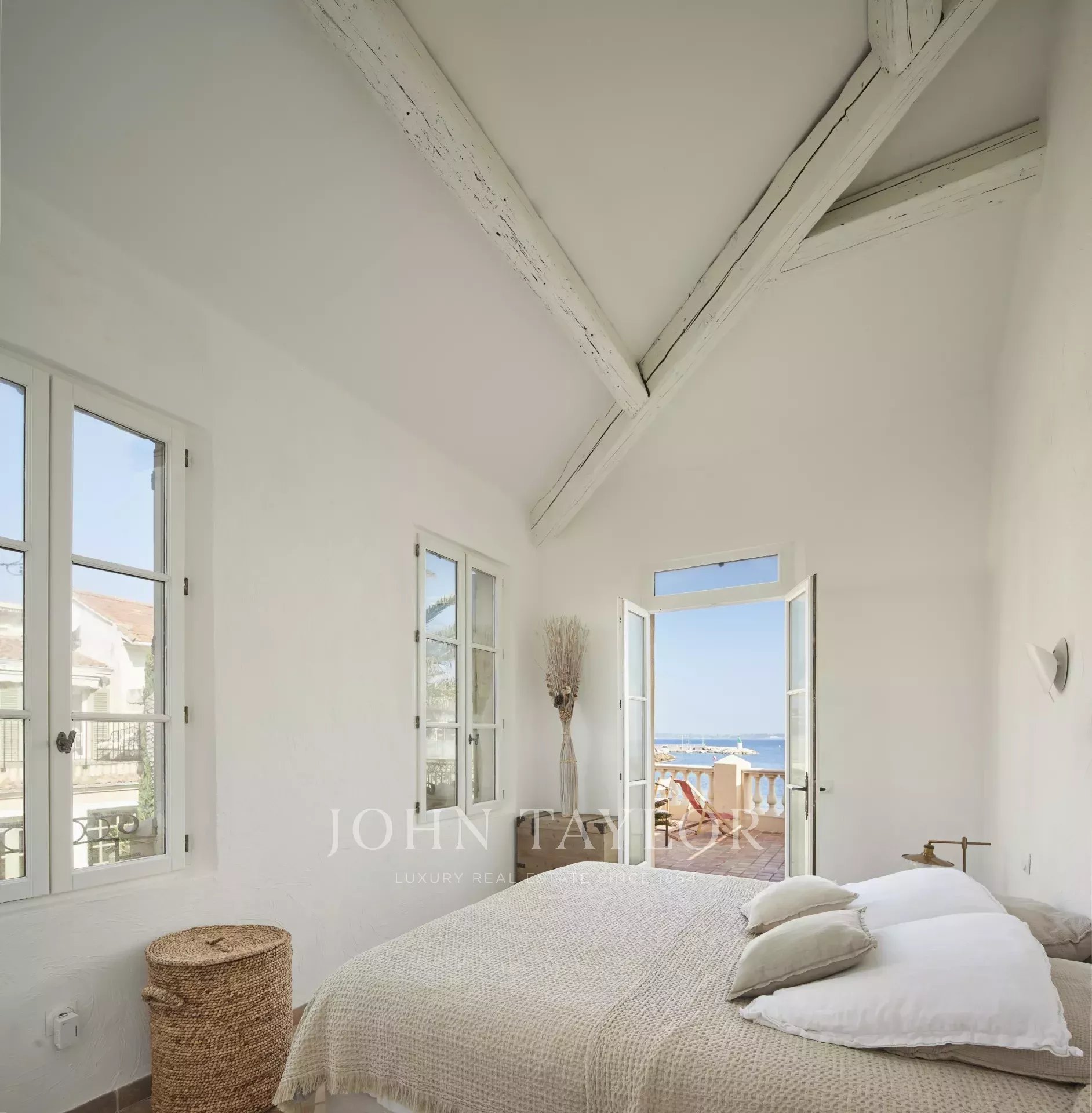 Dvě klimatizované ložnice, každá s vlastní sprchou, s výhledem na terasu s výhledem na moře.