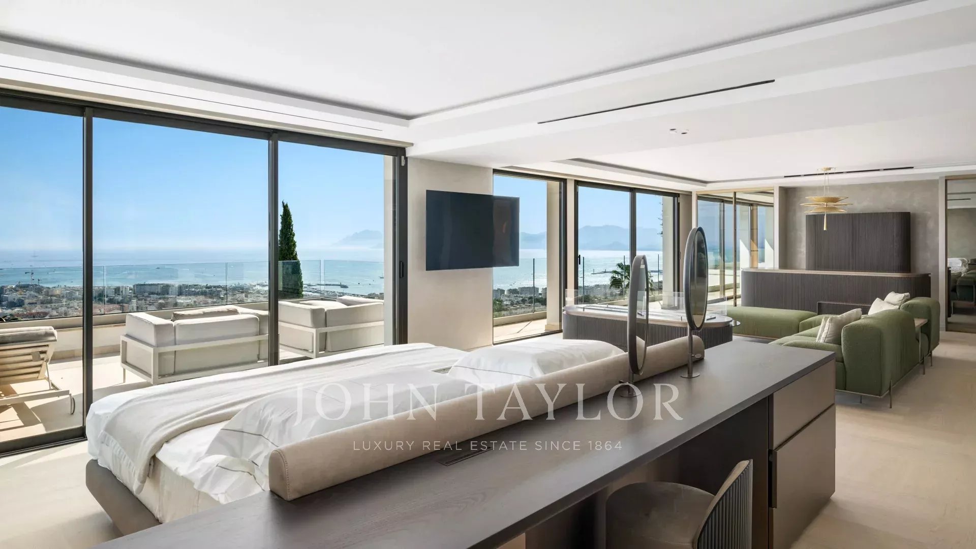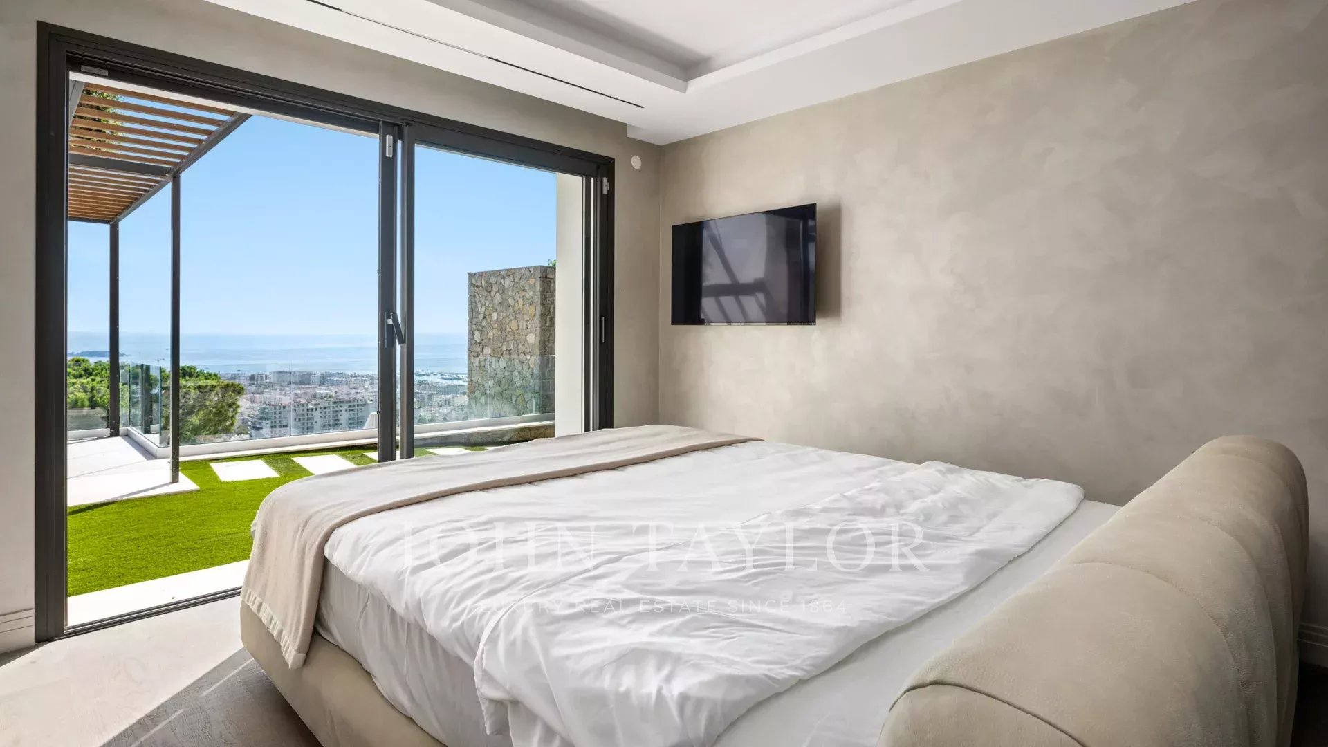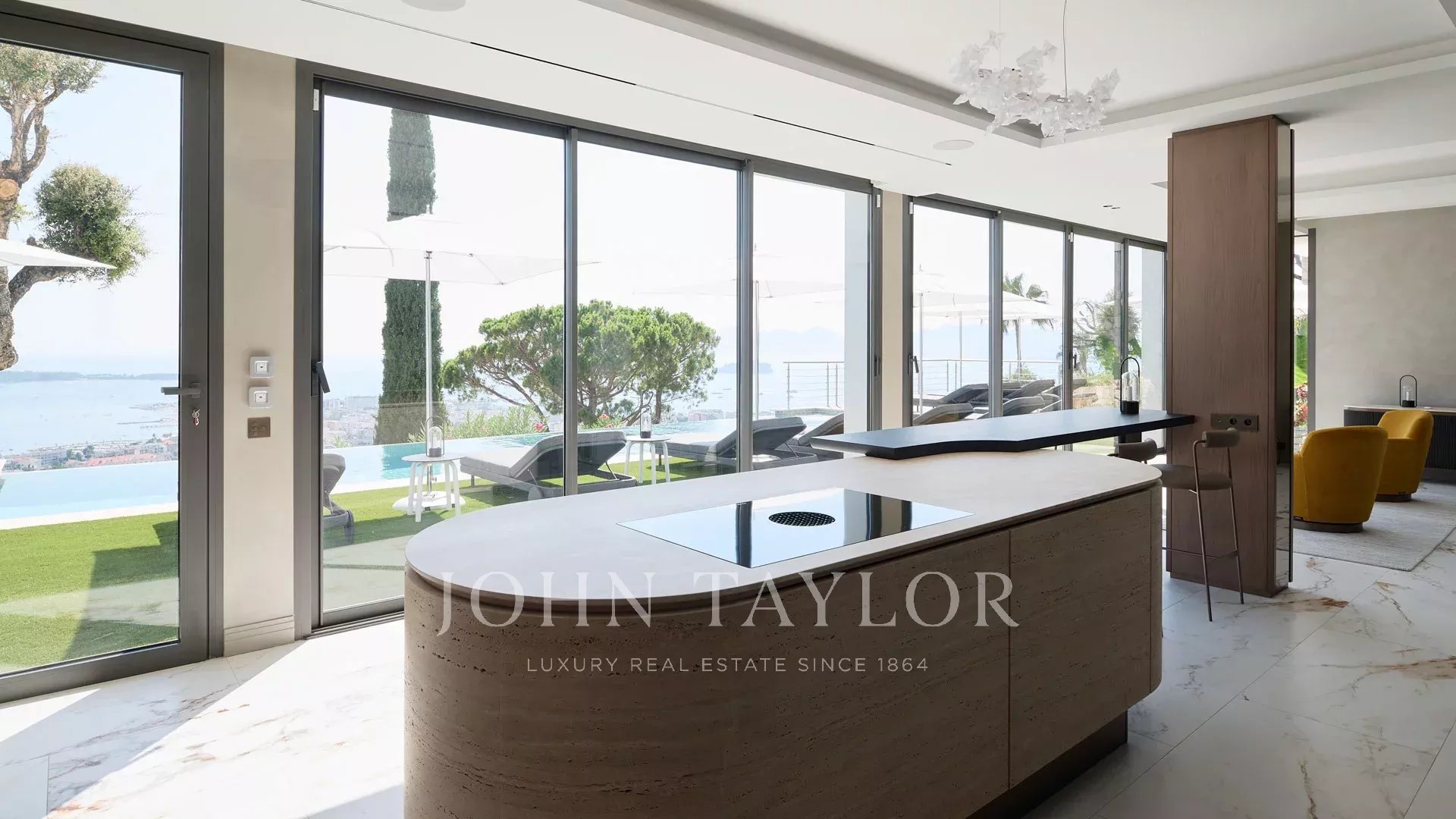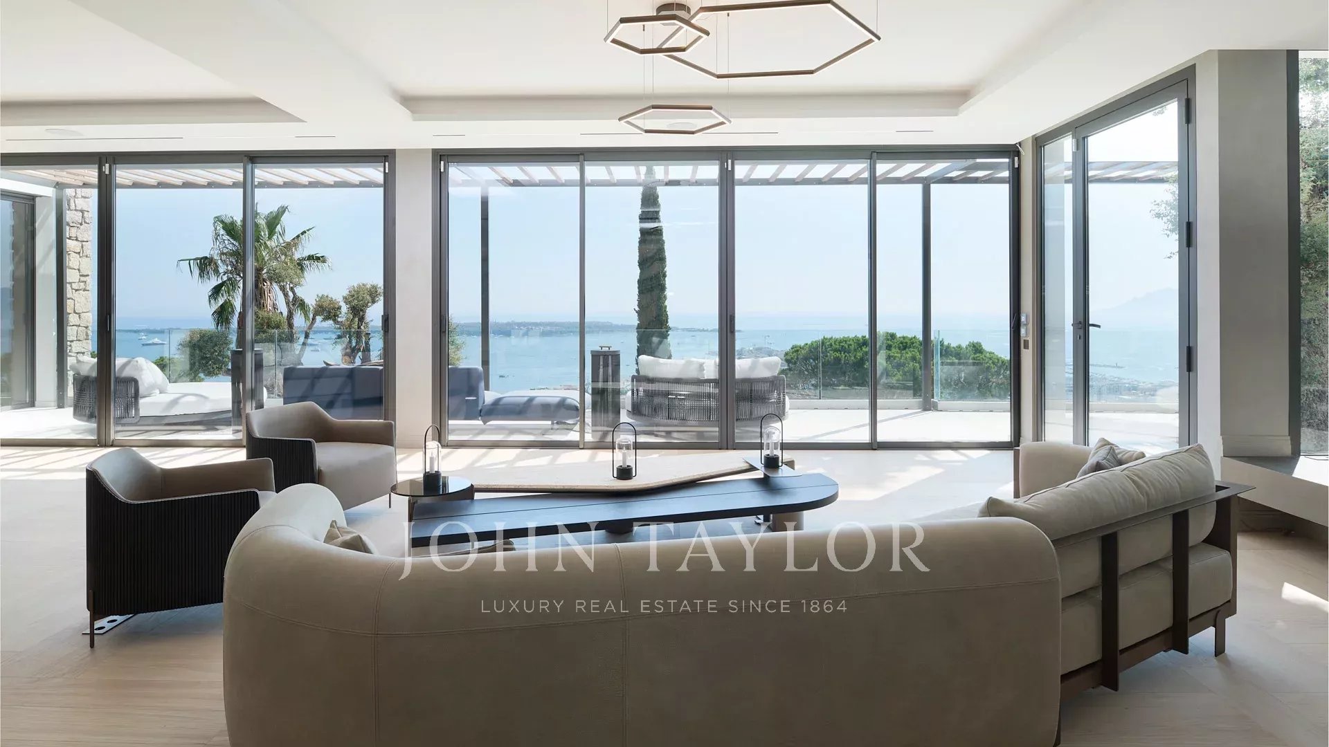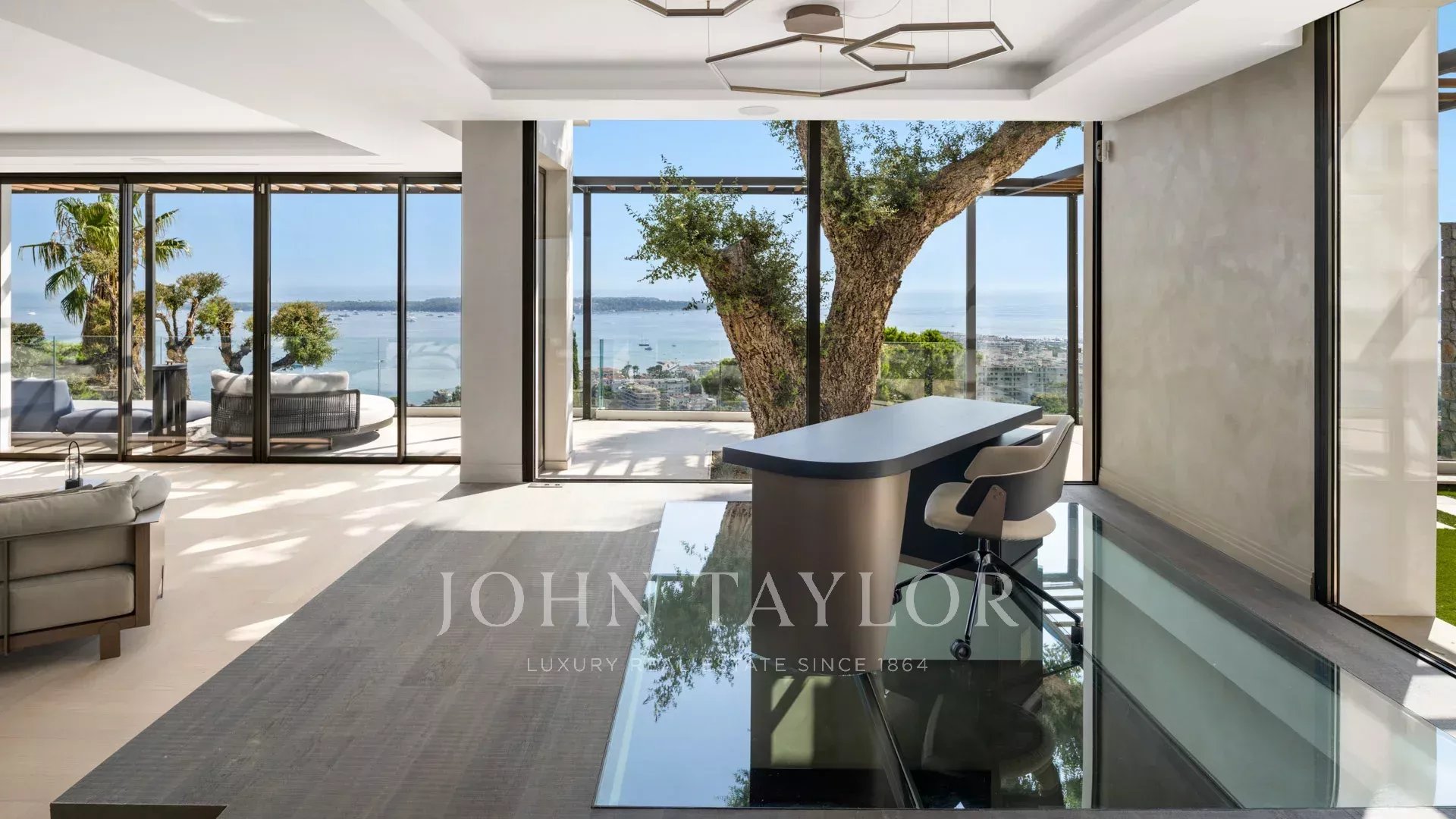Vila s obytnou plochou 550 m² se může pochlubit sofistikovaným interiérem a nerušeným výhledem na Canneský záliv a Lérinské ostrovy, který zaručuje úchvatná panoramata.