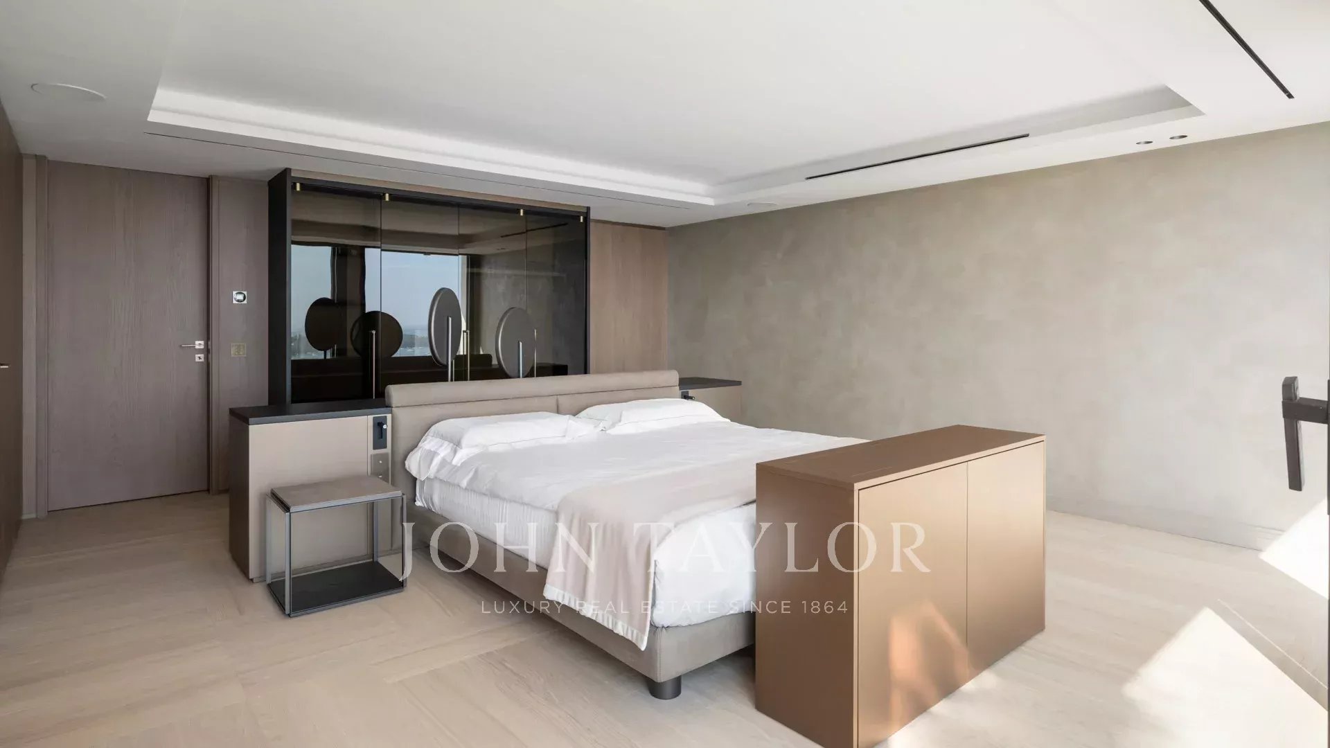 Hlavní apartmá o rozloze přibližně 85 m² (manželská postel 200 cm), které se skládá z obývacího pokoje, baru s výhledem na terasu, šatny a koupelny se sprchou.