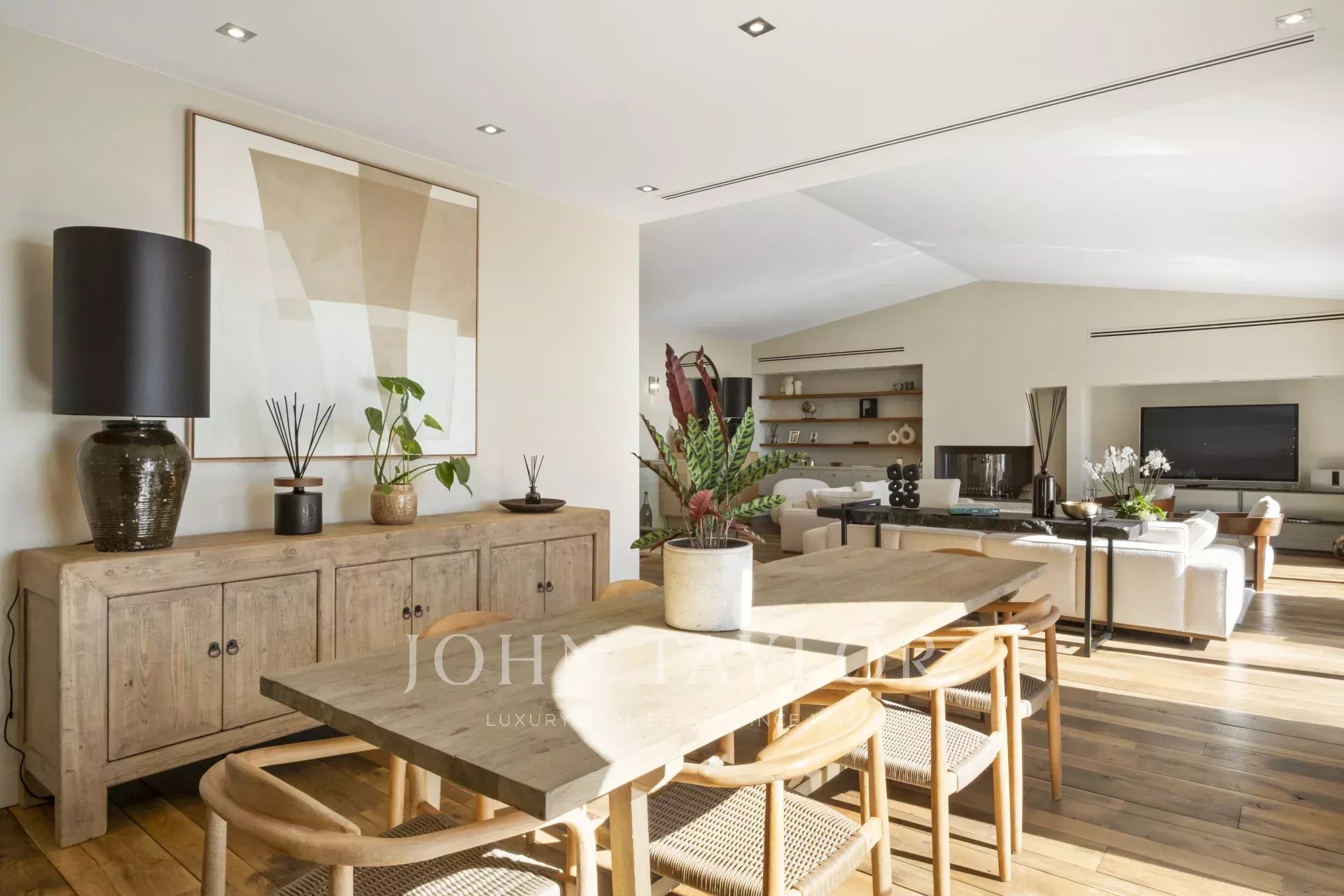 Obrovský obývací pokoj/jídelna 45 m2 s krbem, z něhož se vychází na velkou terasu, hlavní kuchyň.