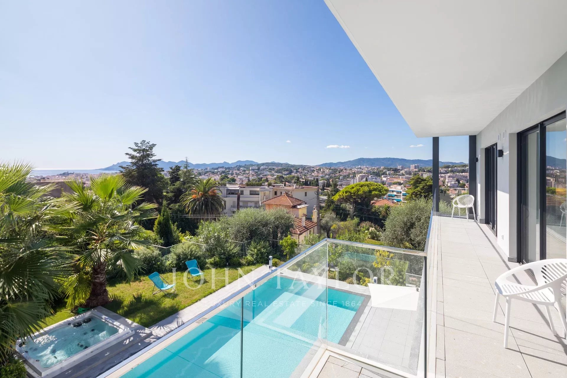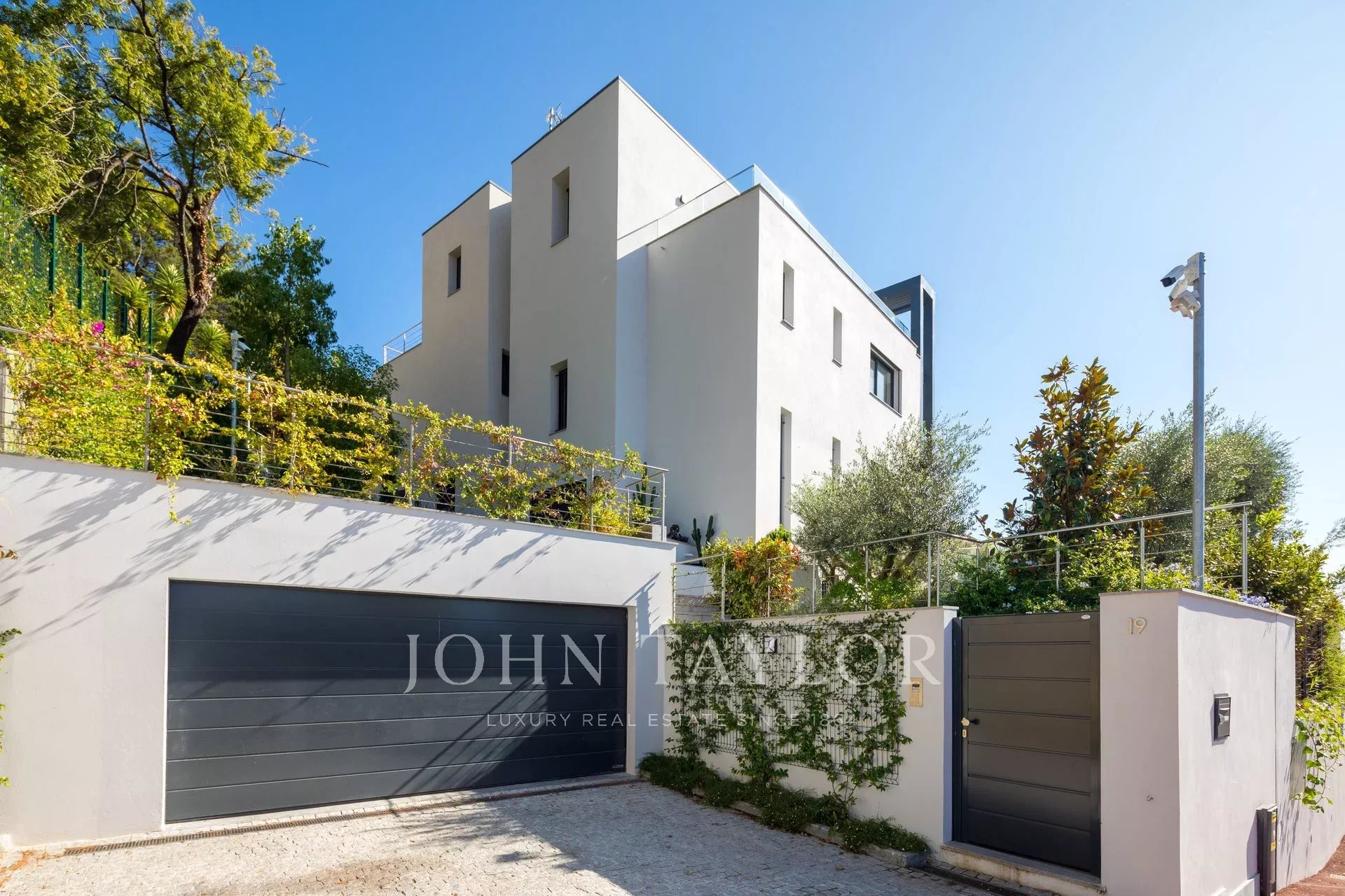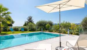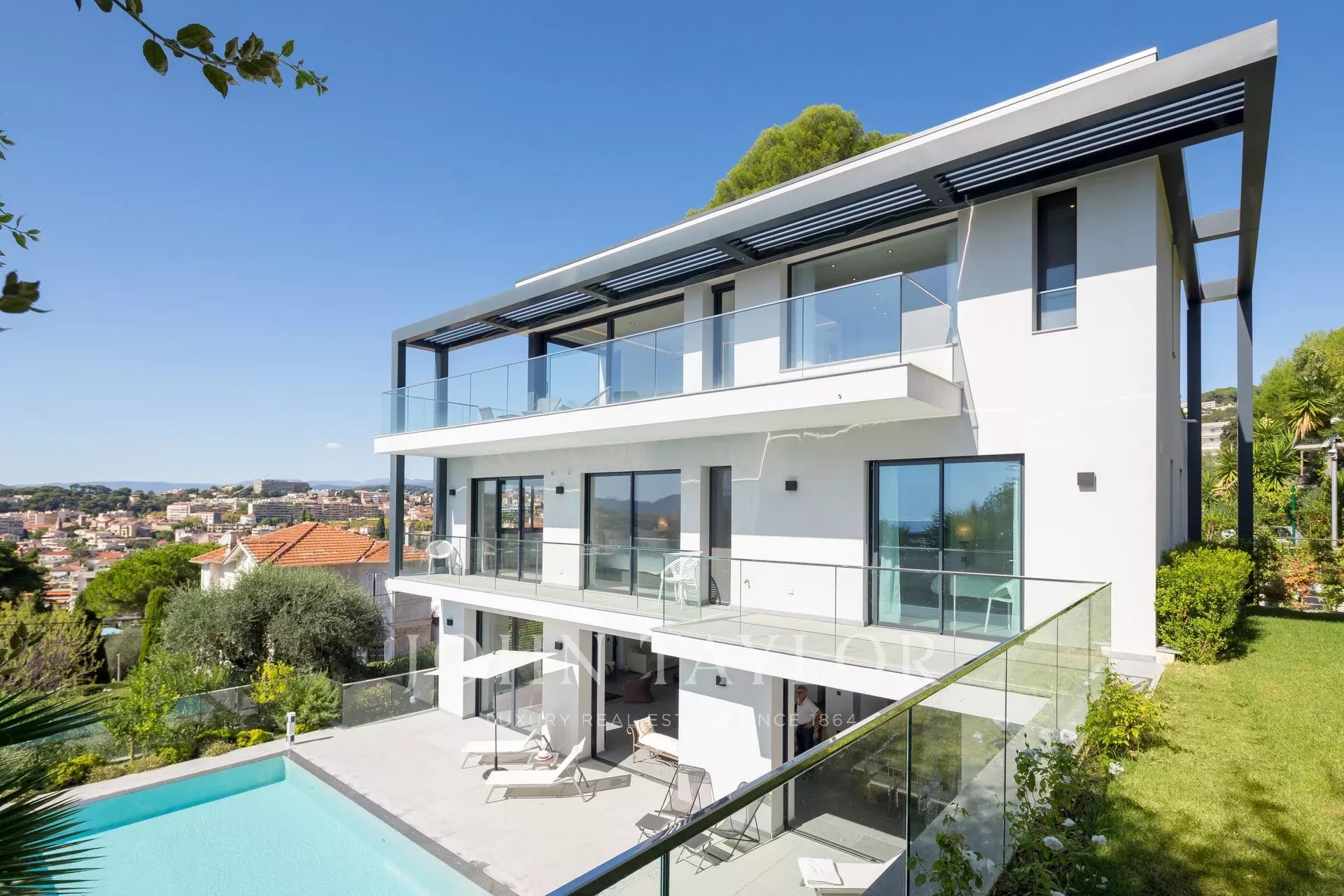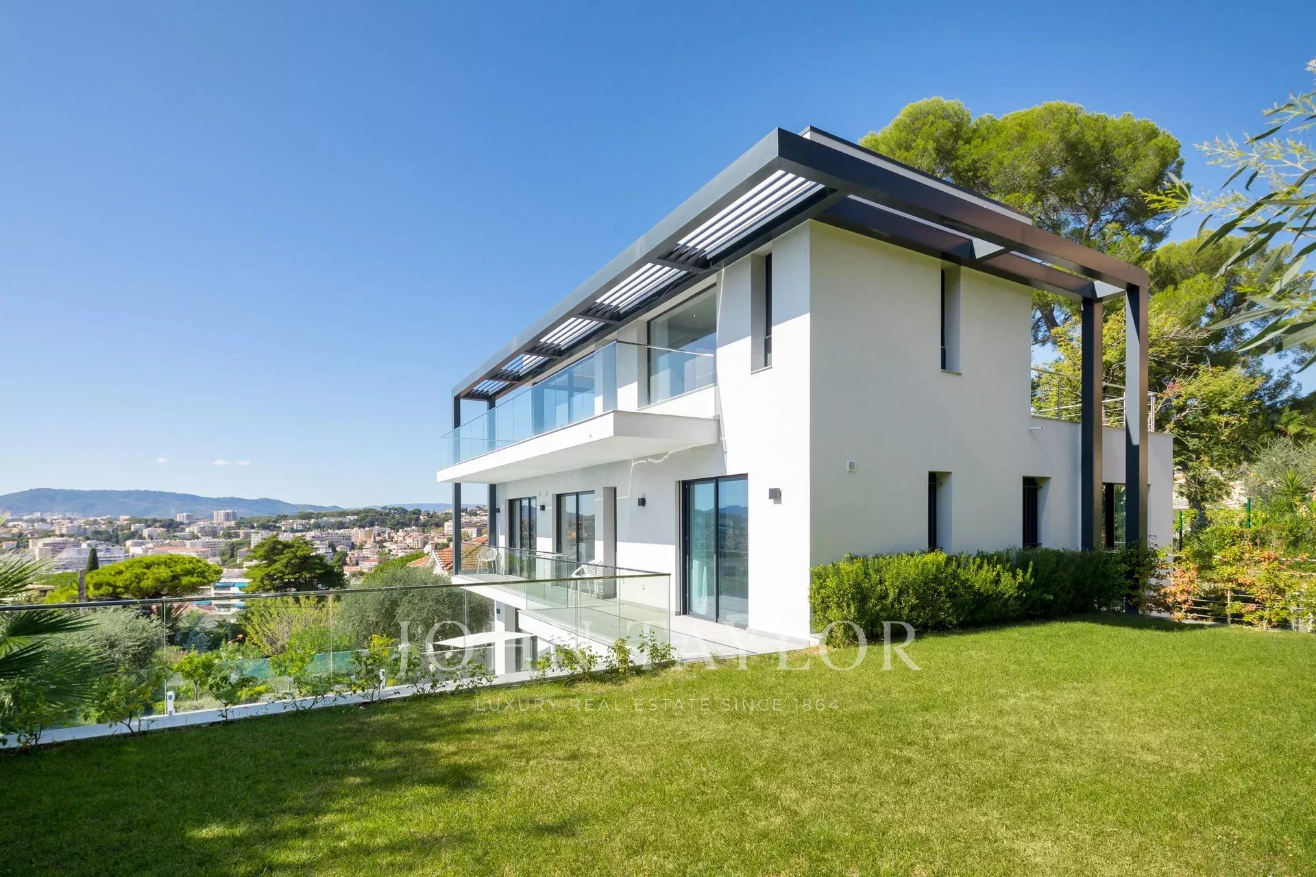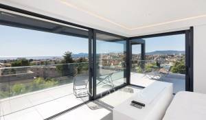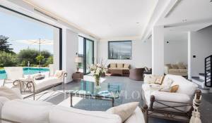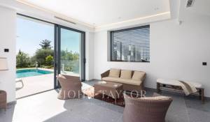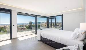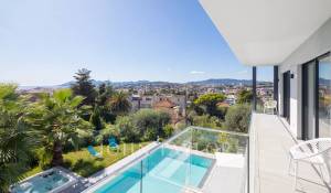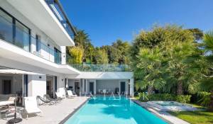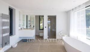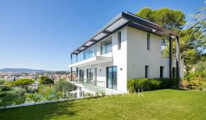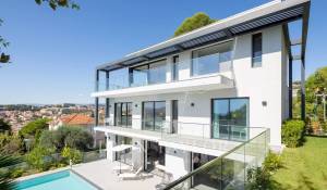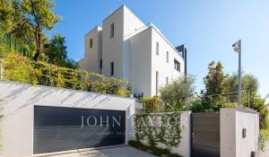 Tento vynikající nový, moderní, klimatizovaný dům o rozloze přibližně 450 m2 se nachází v kopcích nedaleko centra Cannes, na pozemku o rozloze 1 200 m2, a nabízí nerušený výhled na okolní kopce a město Le Suquet.