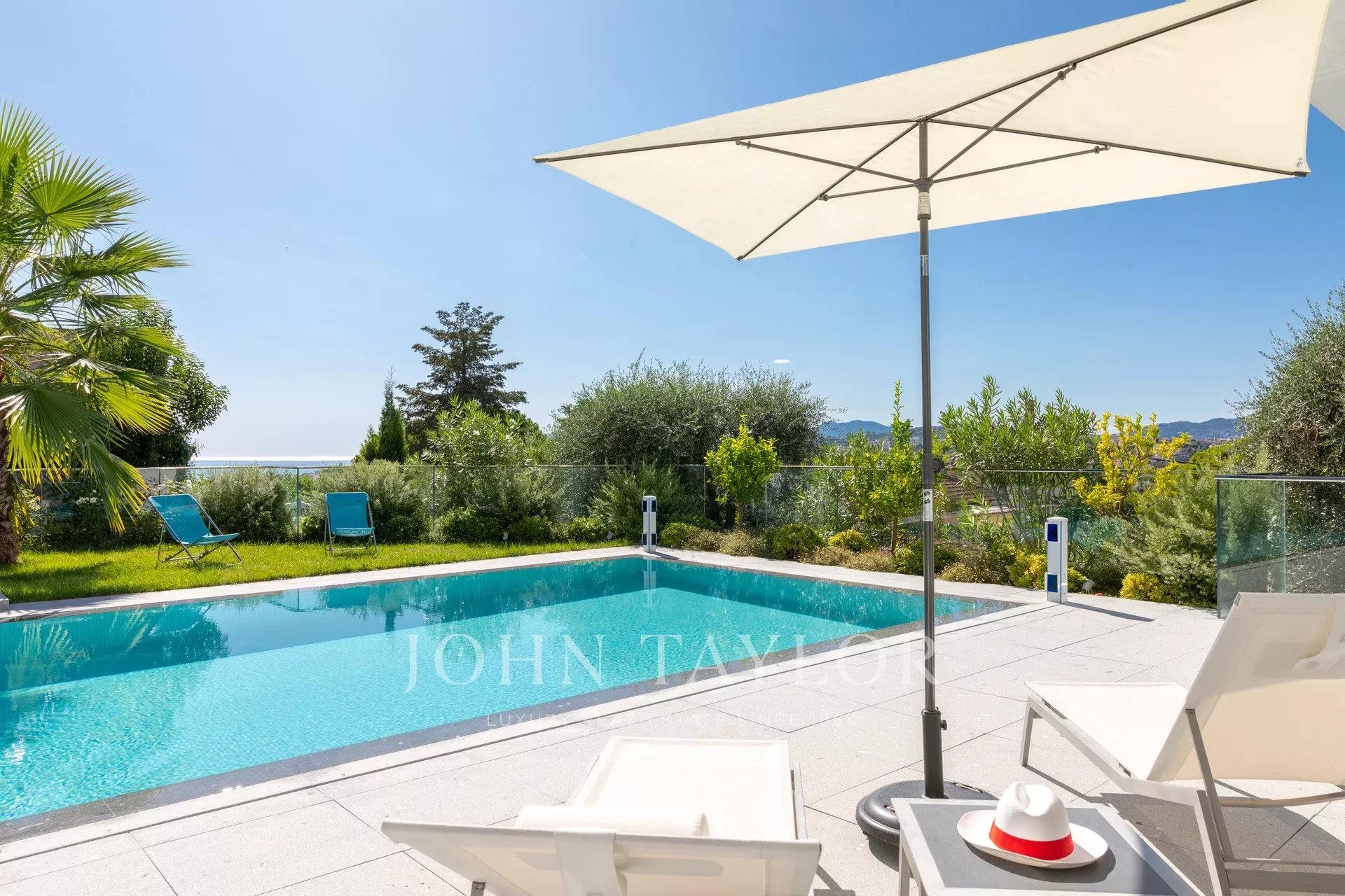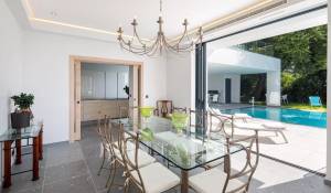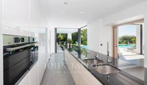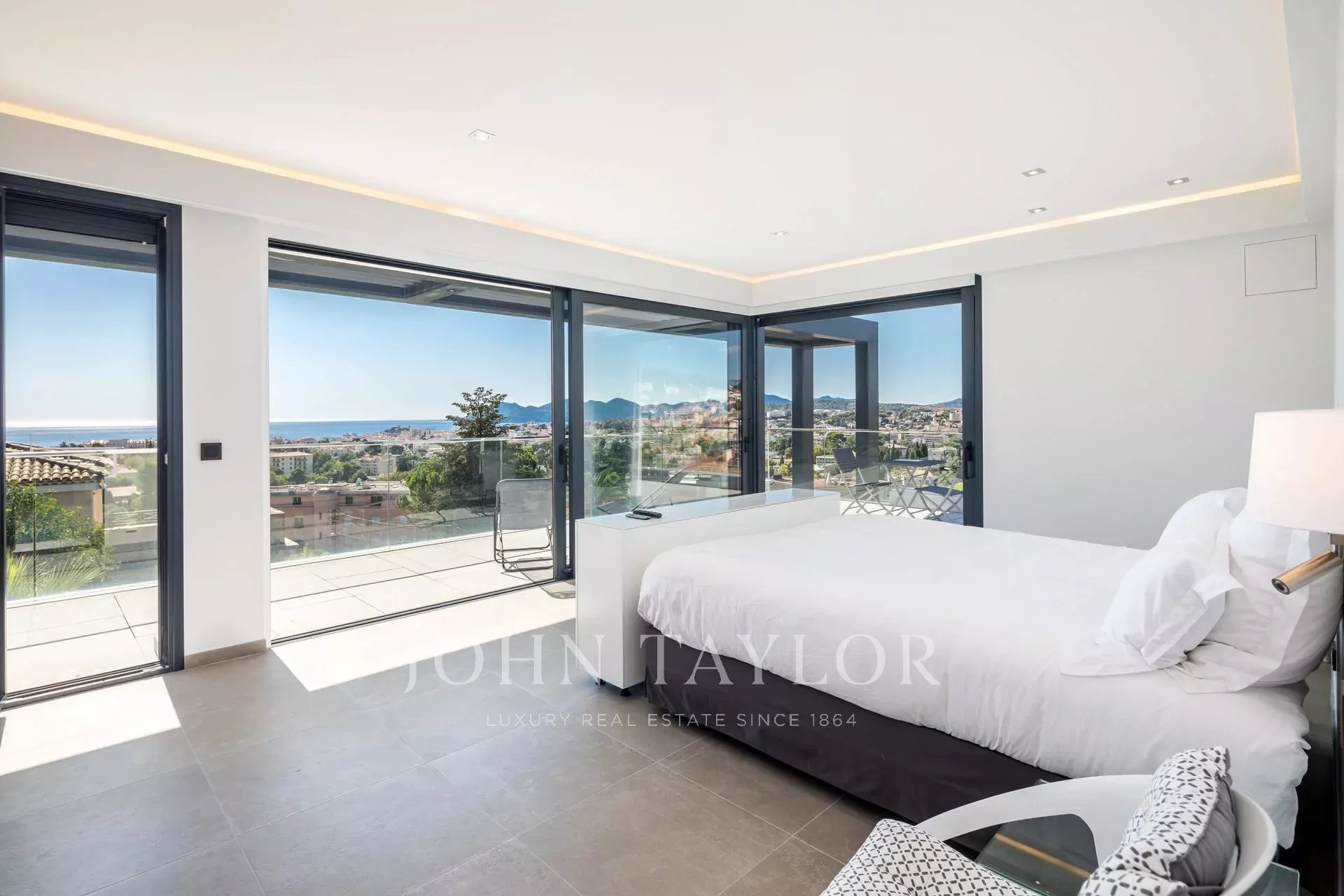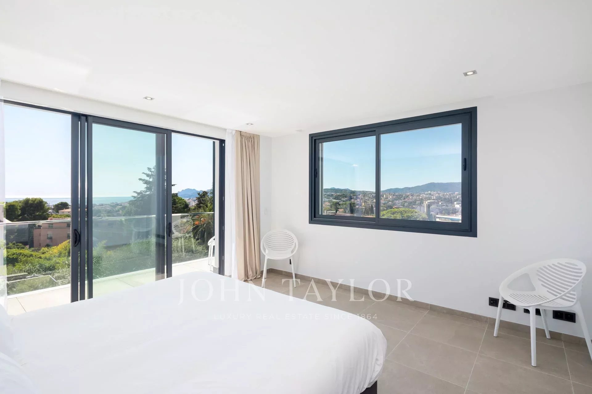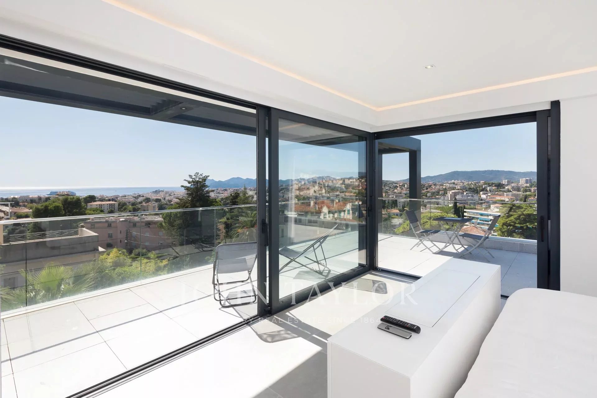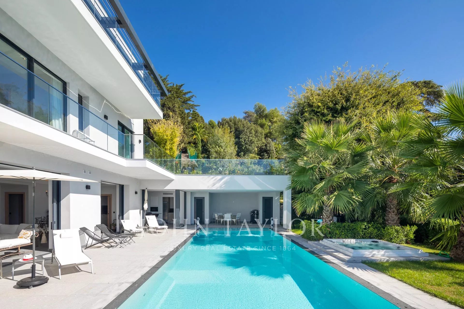 Tento vynikající nový, moderní, klimatizovaný dům o rozloze přibližně 450 m2 se nachází v kopcích nedaleko centra Cannes, na pozemku o rozloze 1 200 m2, a nabízí nerušený výhled na okolní kopce a město Le Suquet.