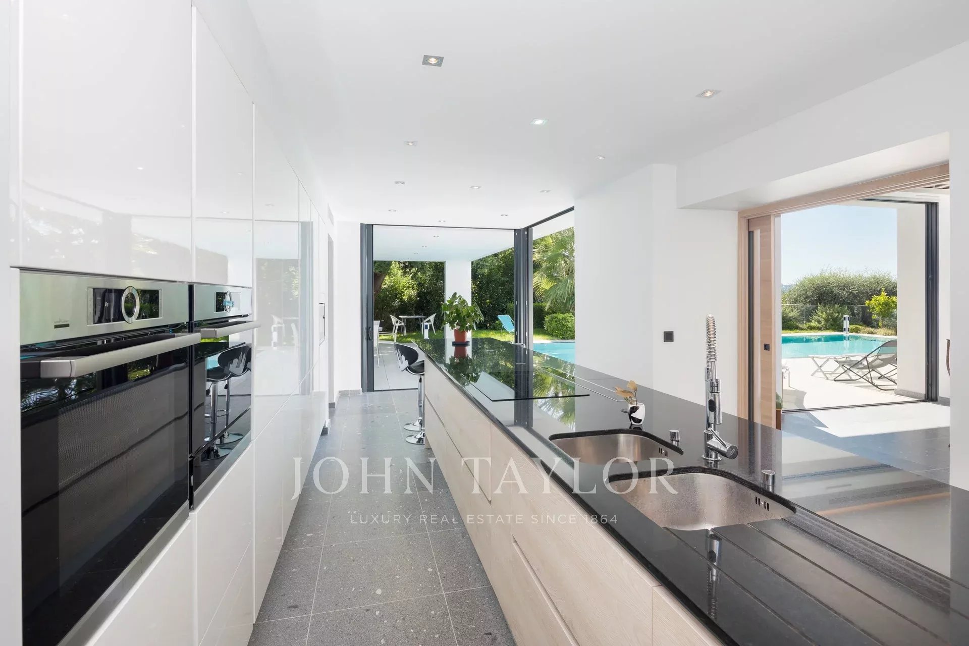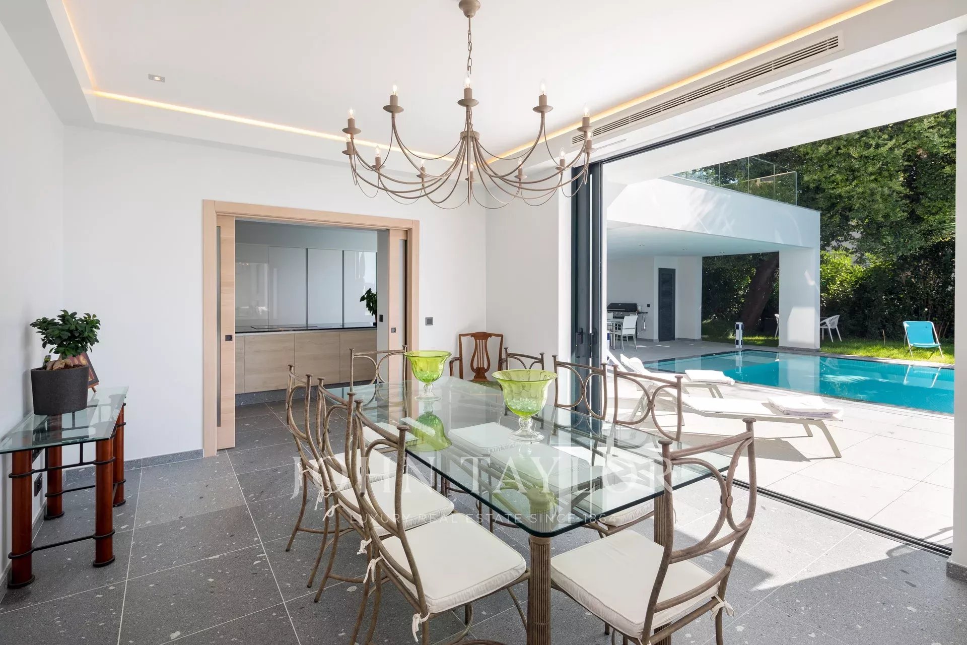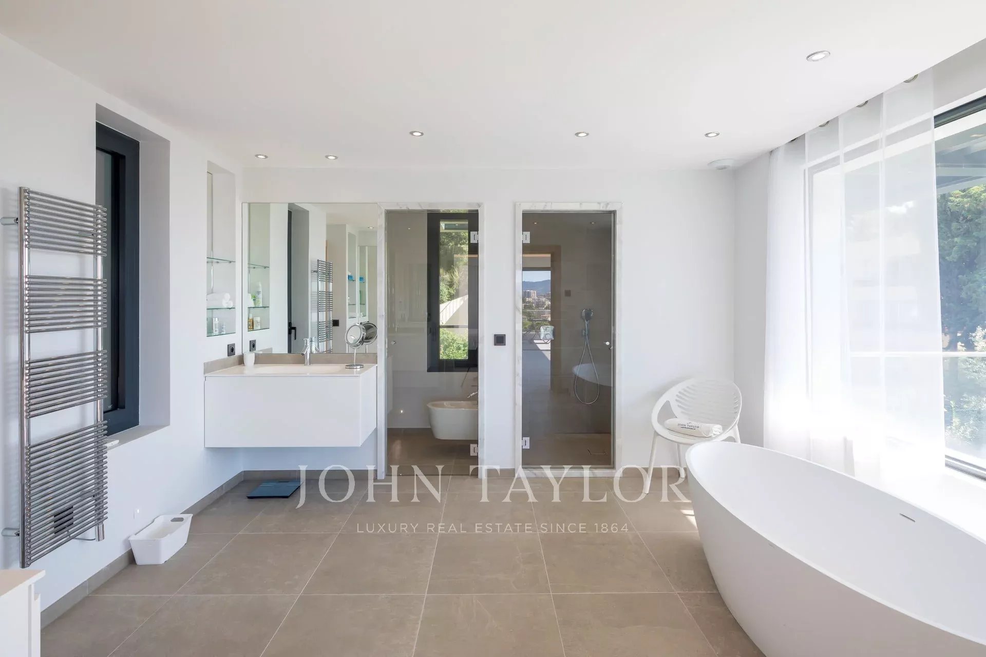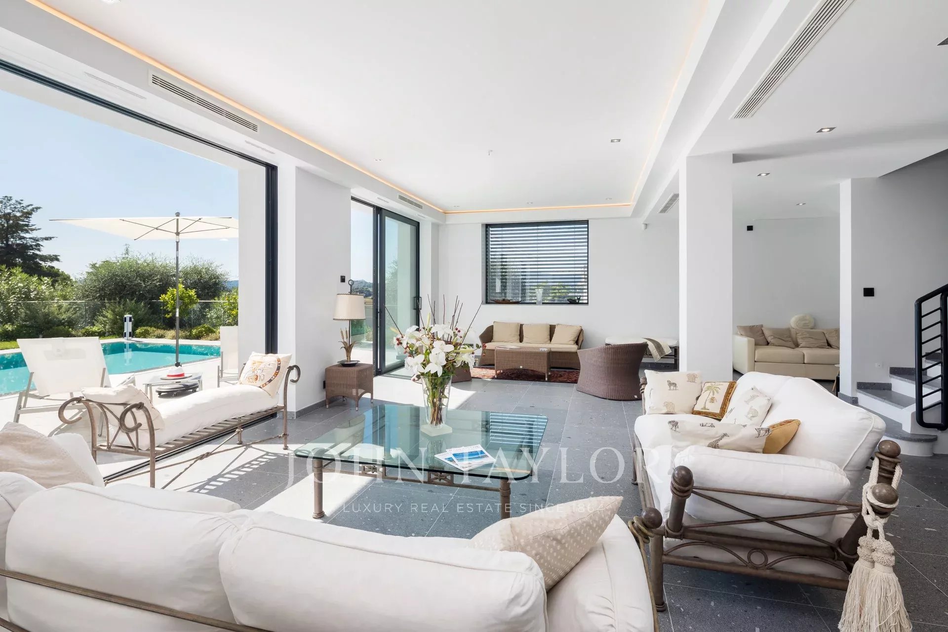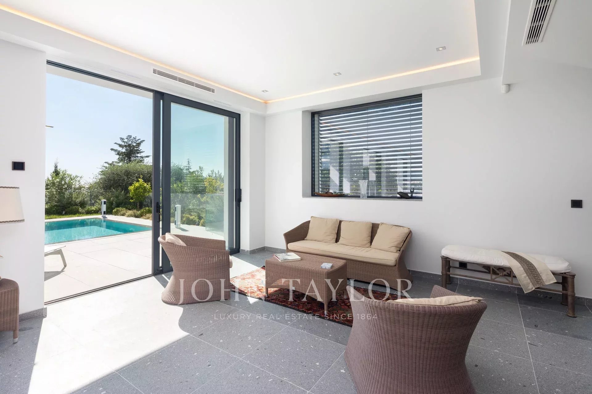 Tento vynikající nový, moderní, klimatizovaný dům o rozloze přibližně 450 m2 se nachází v kopcích nedaleko centra Cannes, na pozemku o rozloze 1 200 m2, a nabízí nerušený výhled na okolní kopce a město Le Suquet.