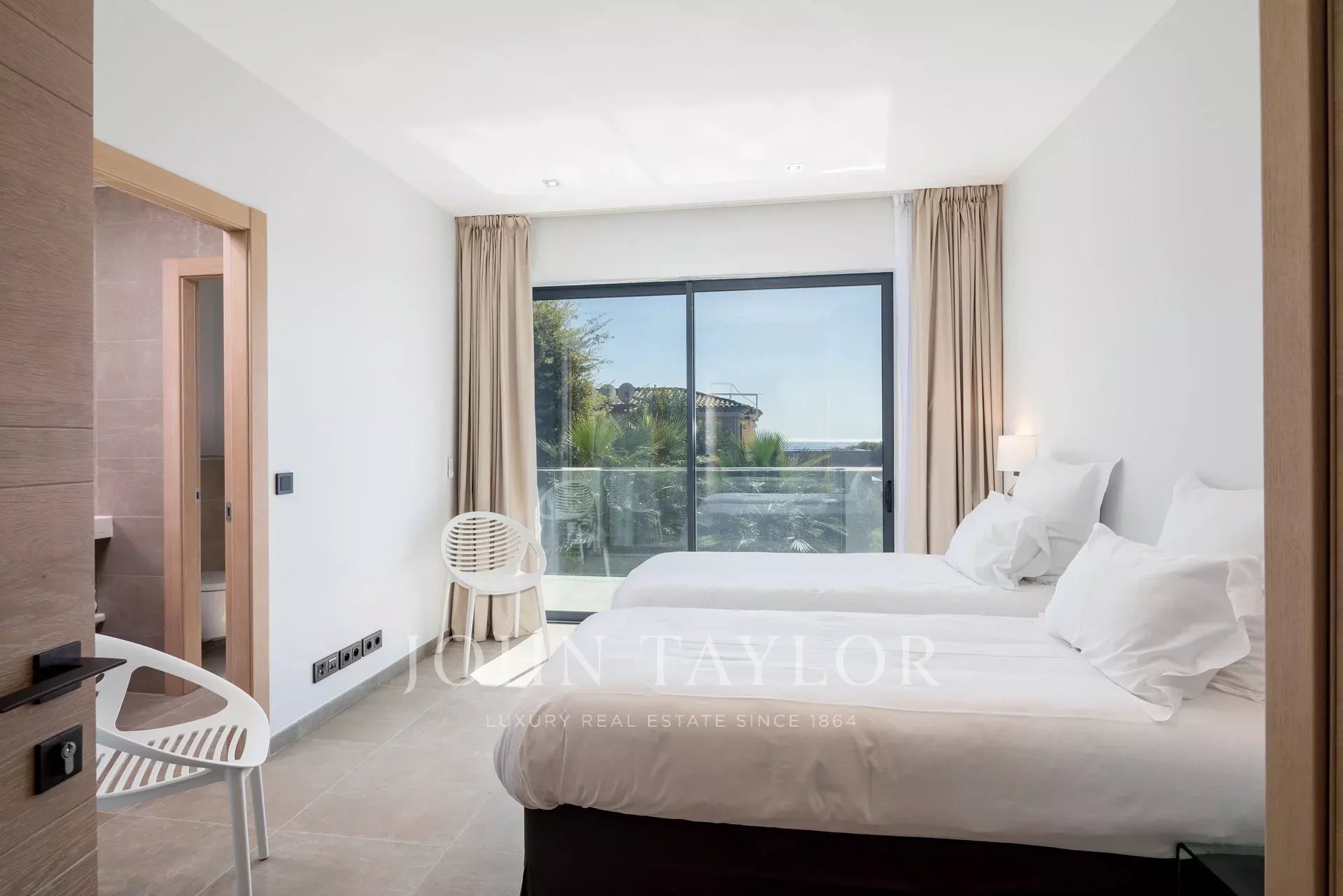 Dvě ložnice (2 x 90 cm lůžka nebo 180 cm lůžko), každá s vlastní koupelnou se sprchou/WC, výhled na moře.