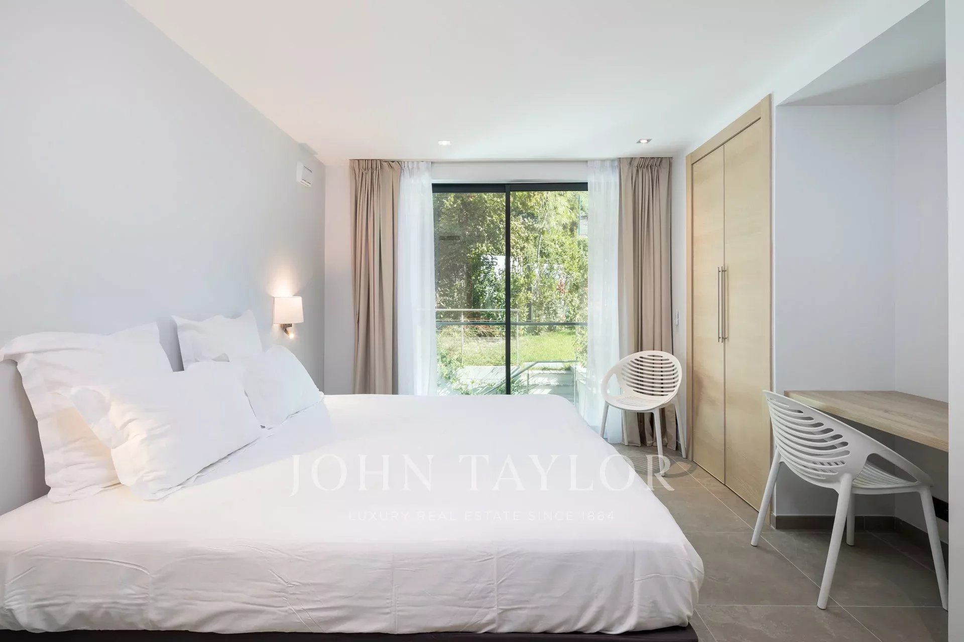 ložnice (manželská postel) s výhledem na terasu, výhled na Canneský záliv a Estérel - šatna - koupelna, sprcha/WC - kuchyňský kout - knihovna