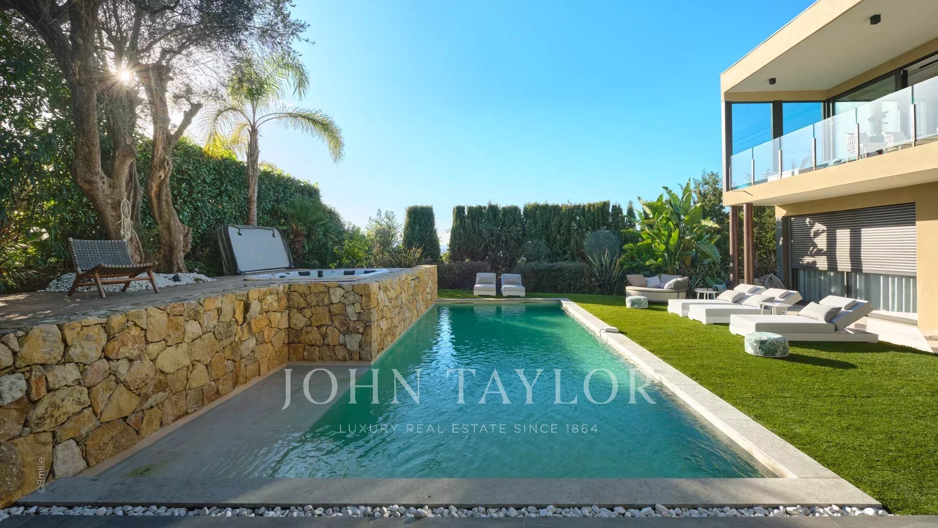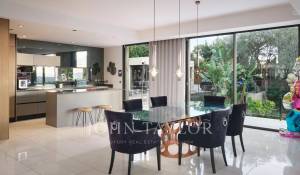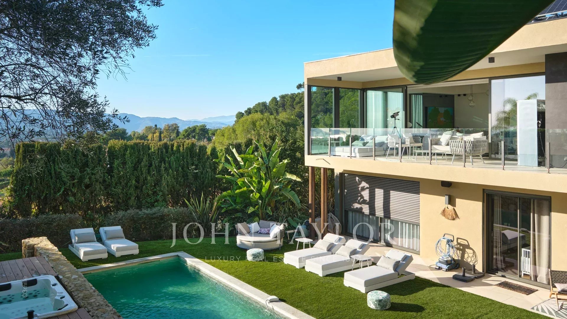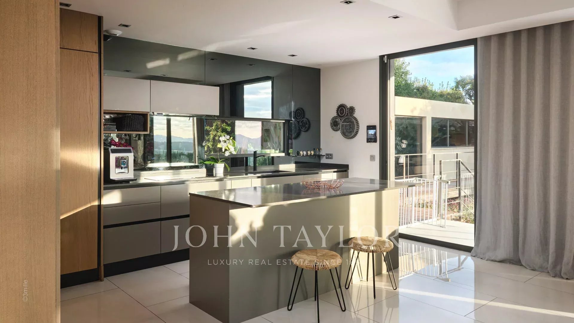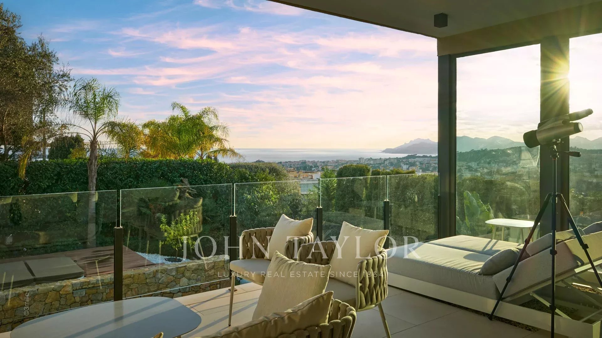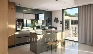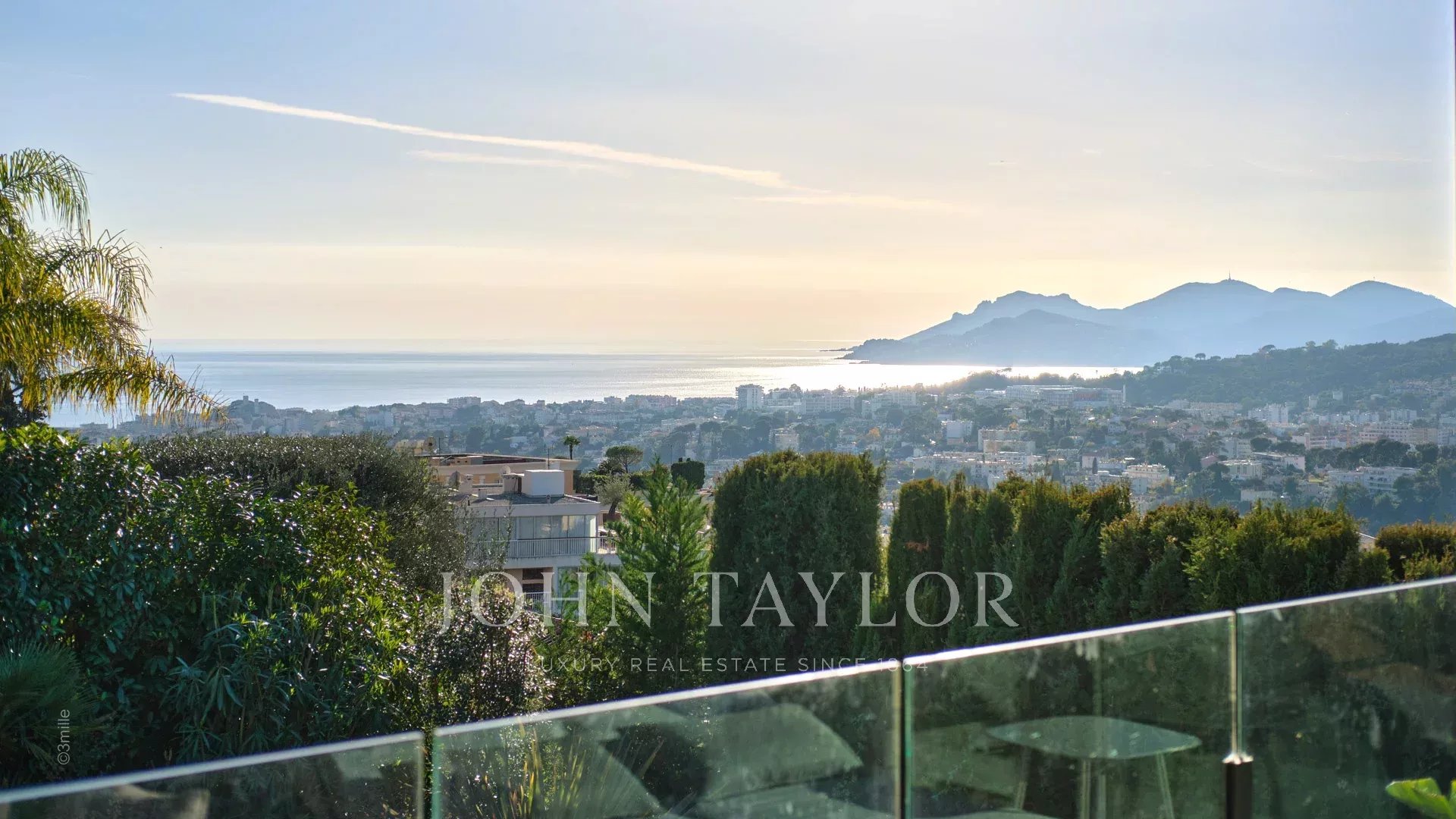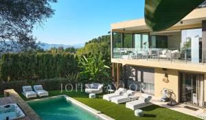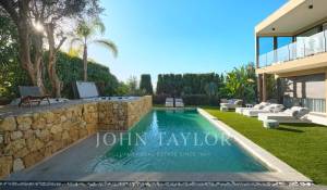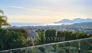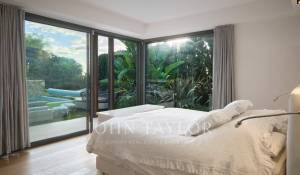 Tato vynikající moderní vila se nachází v kopcích nad Cannes, uprostřed pozemku o rozloze 1 200 m2, a nabízí krásný výhled na moře a ostrovy Lérins.