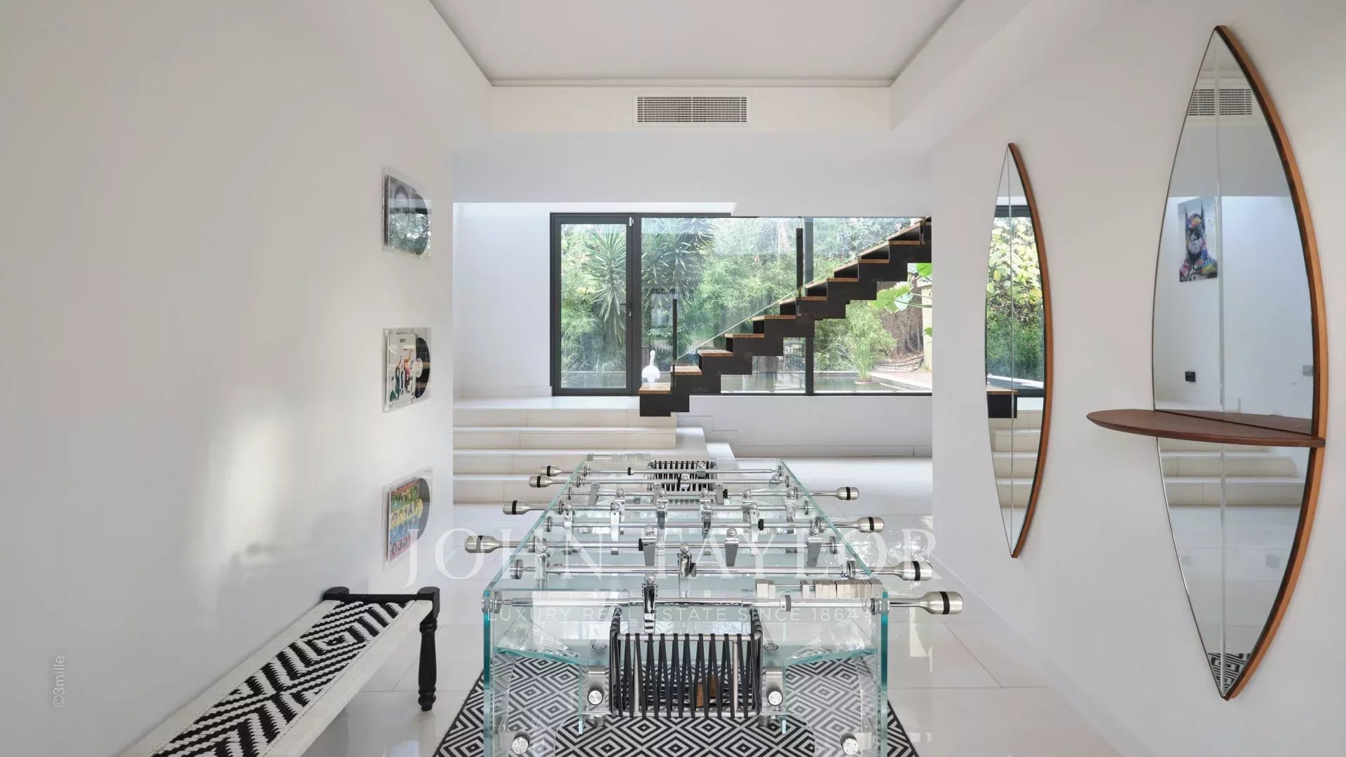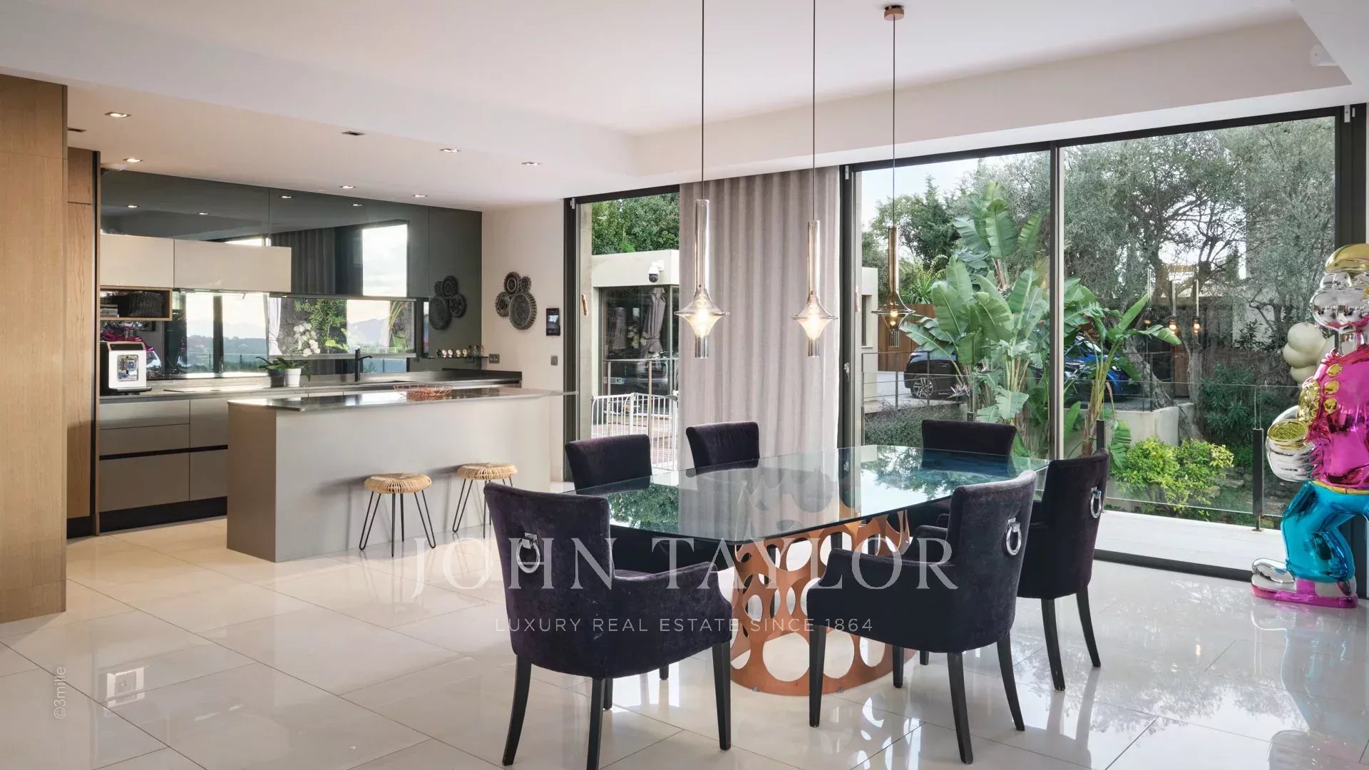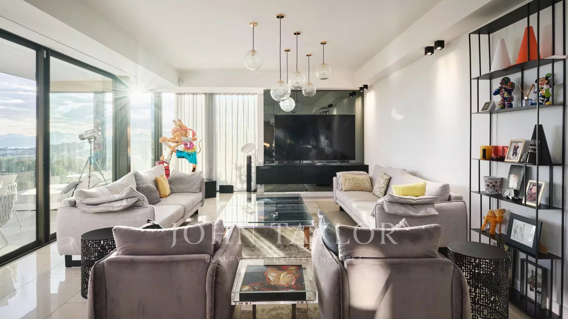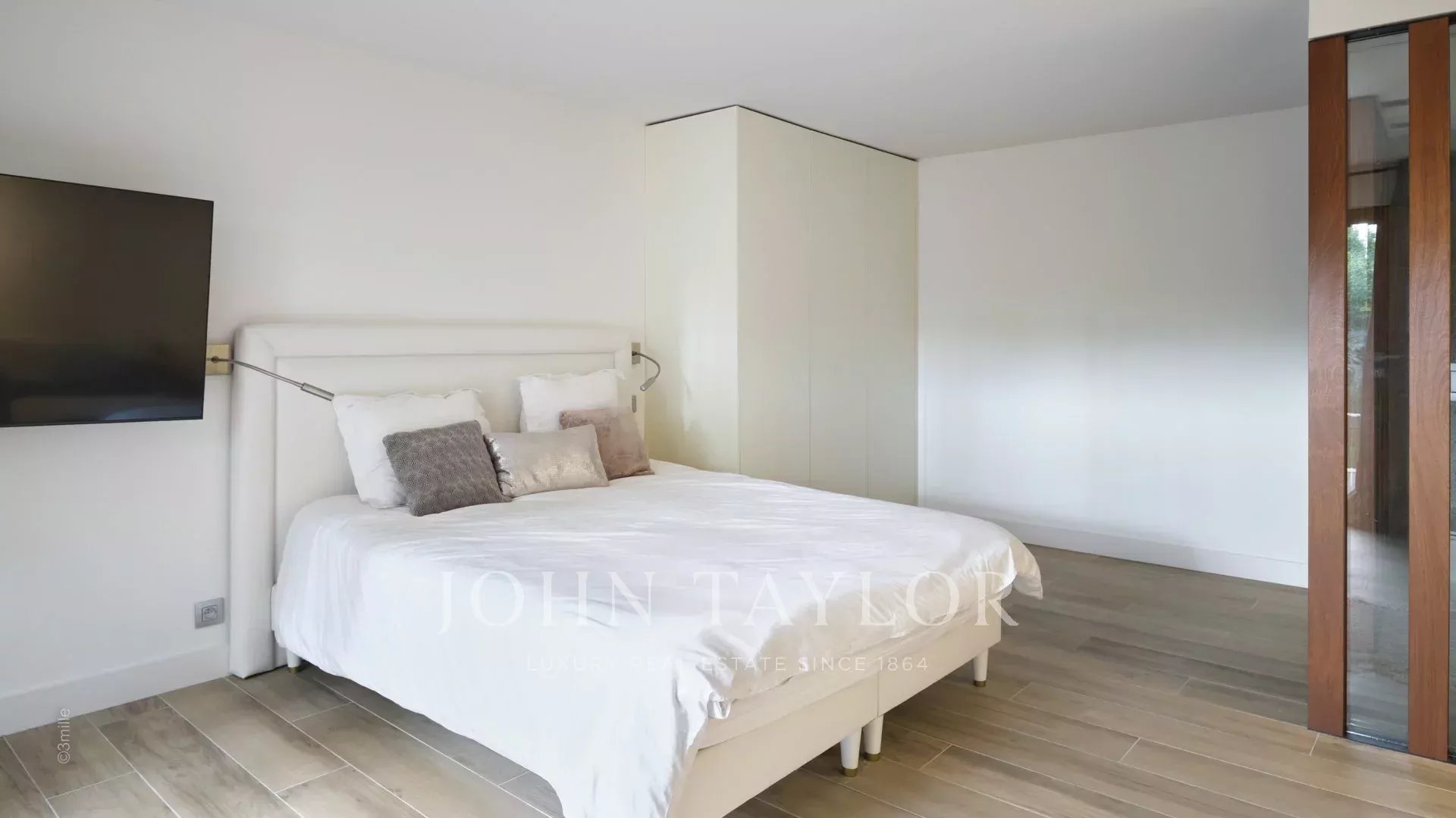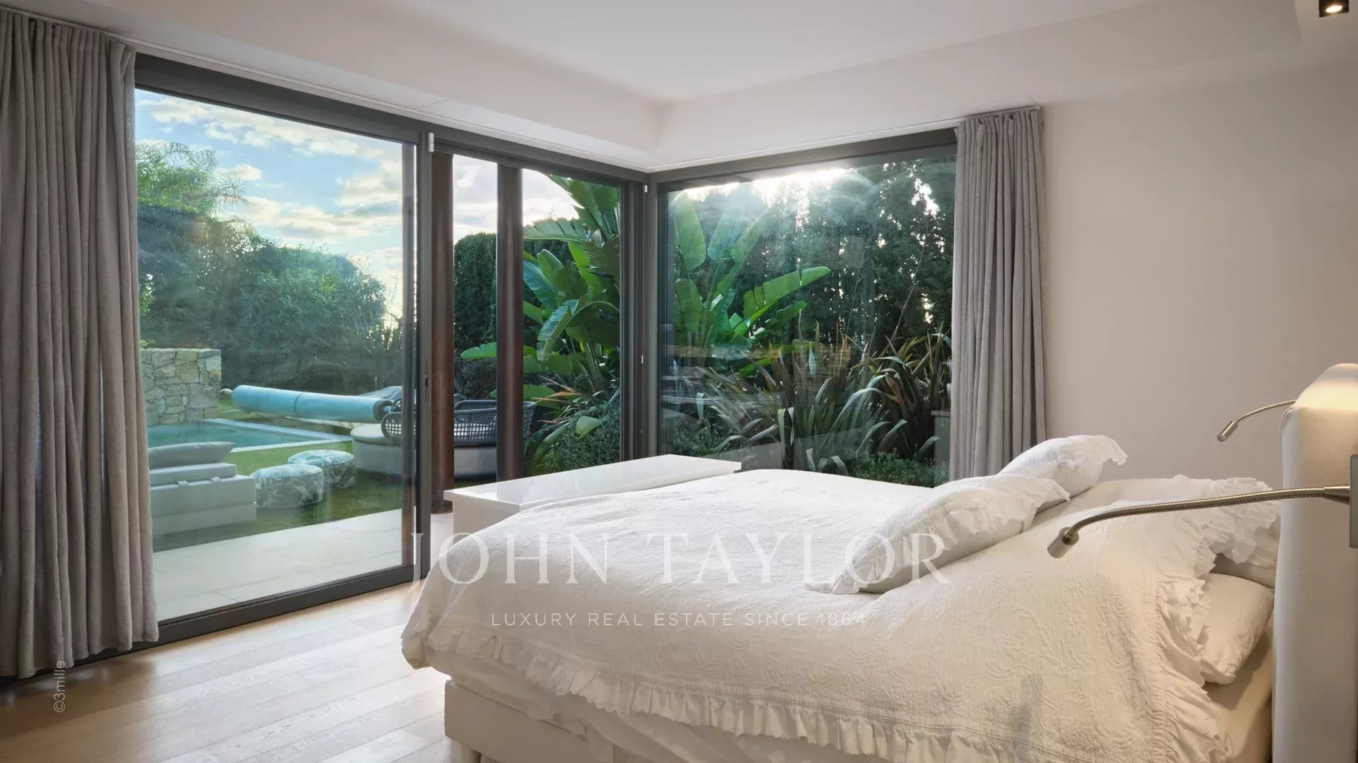 Tato vynikající moderní vila se nachází v kopcích nad Cannes, uprostřed pozemku o rozloze 1 200 m2, a nabízí krásný výhled na moře a ostrovy Lérins.