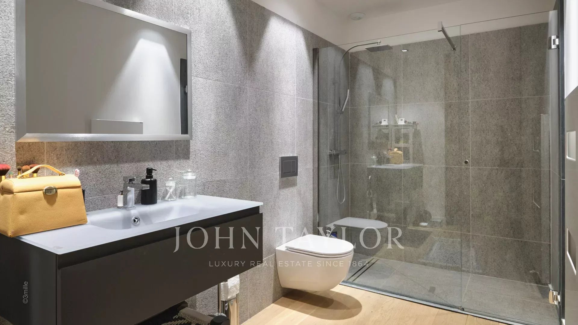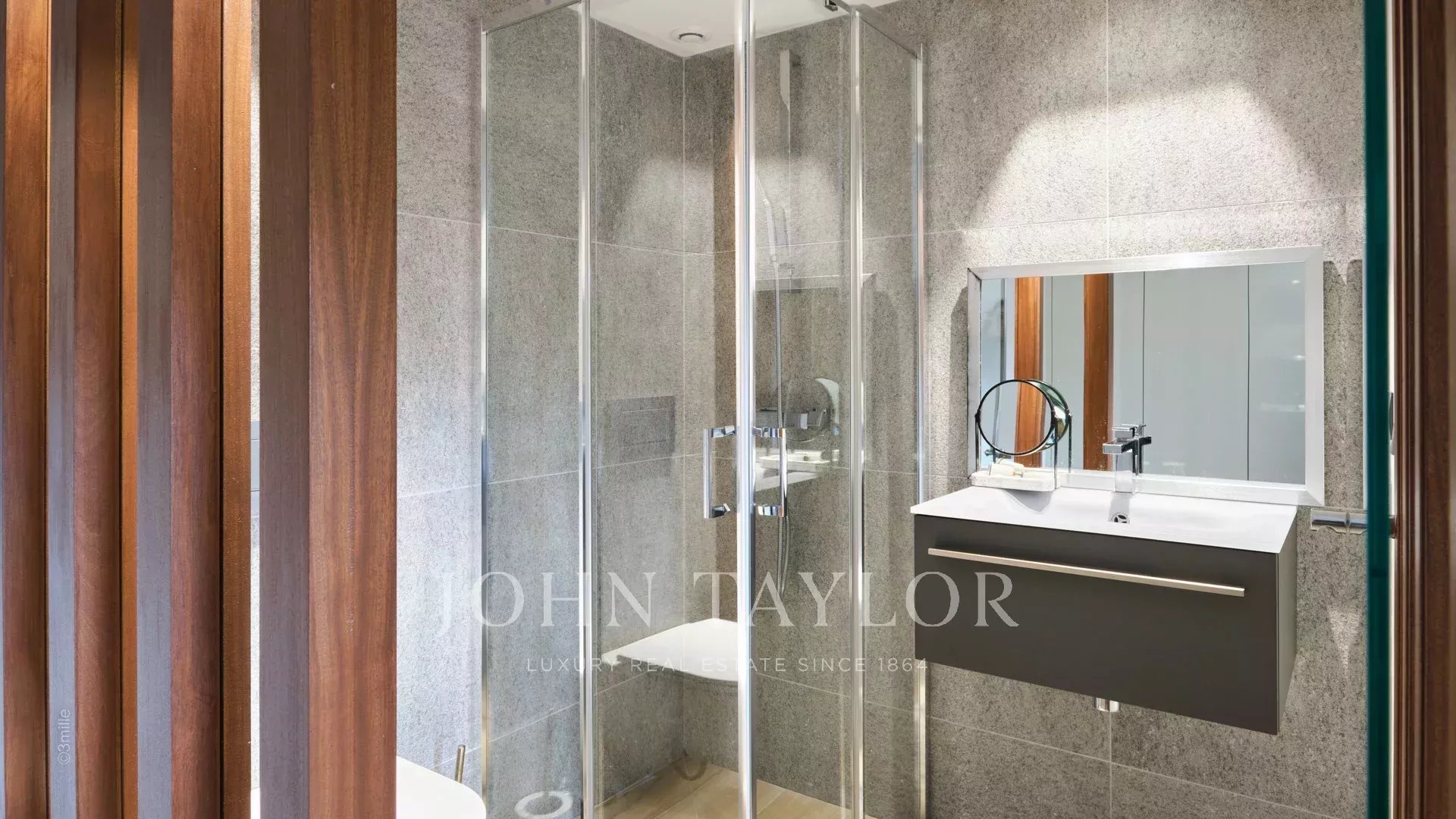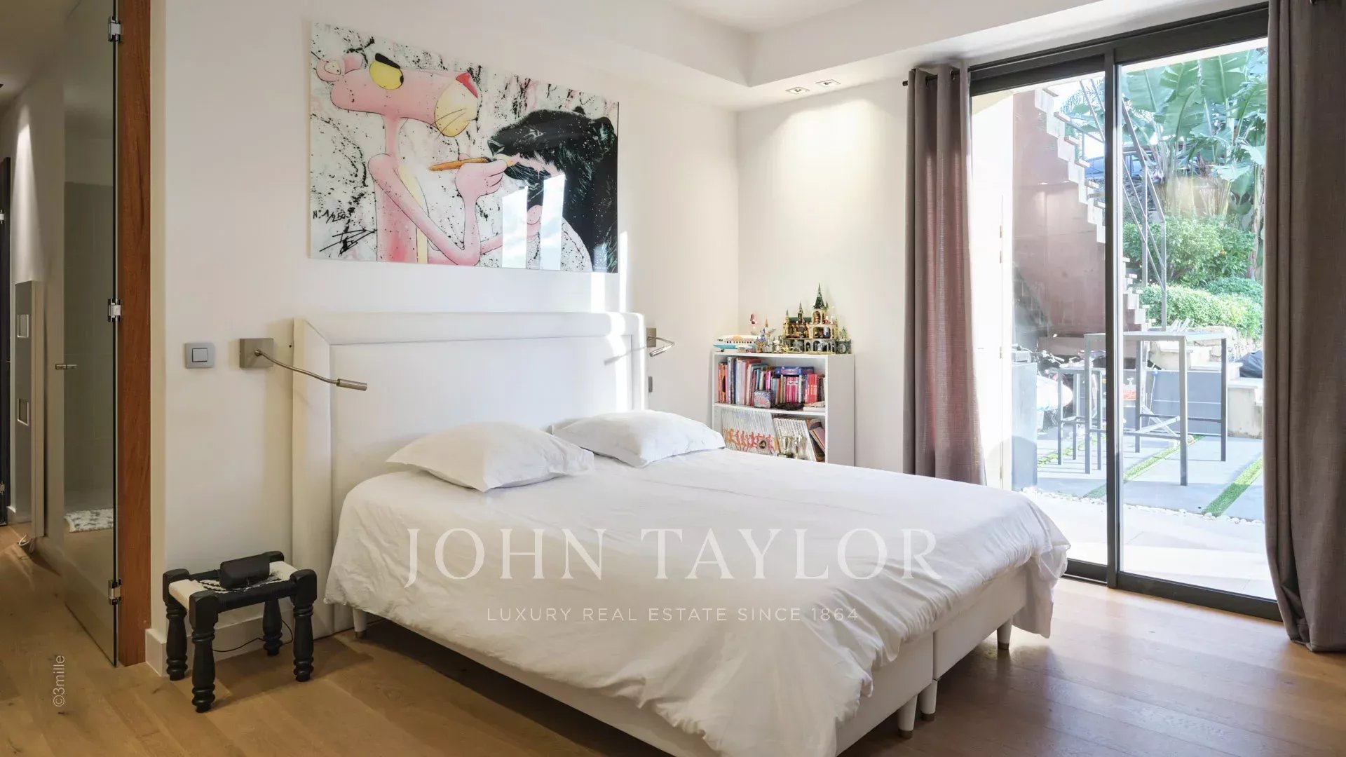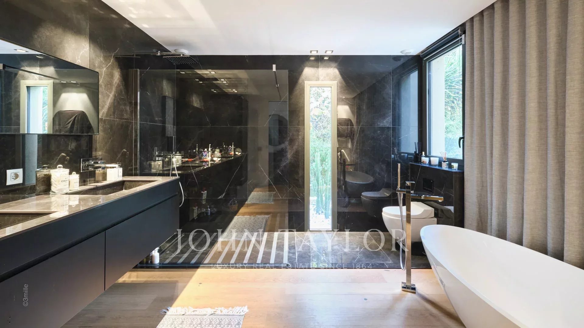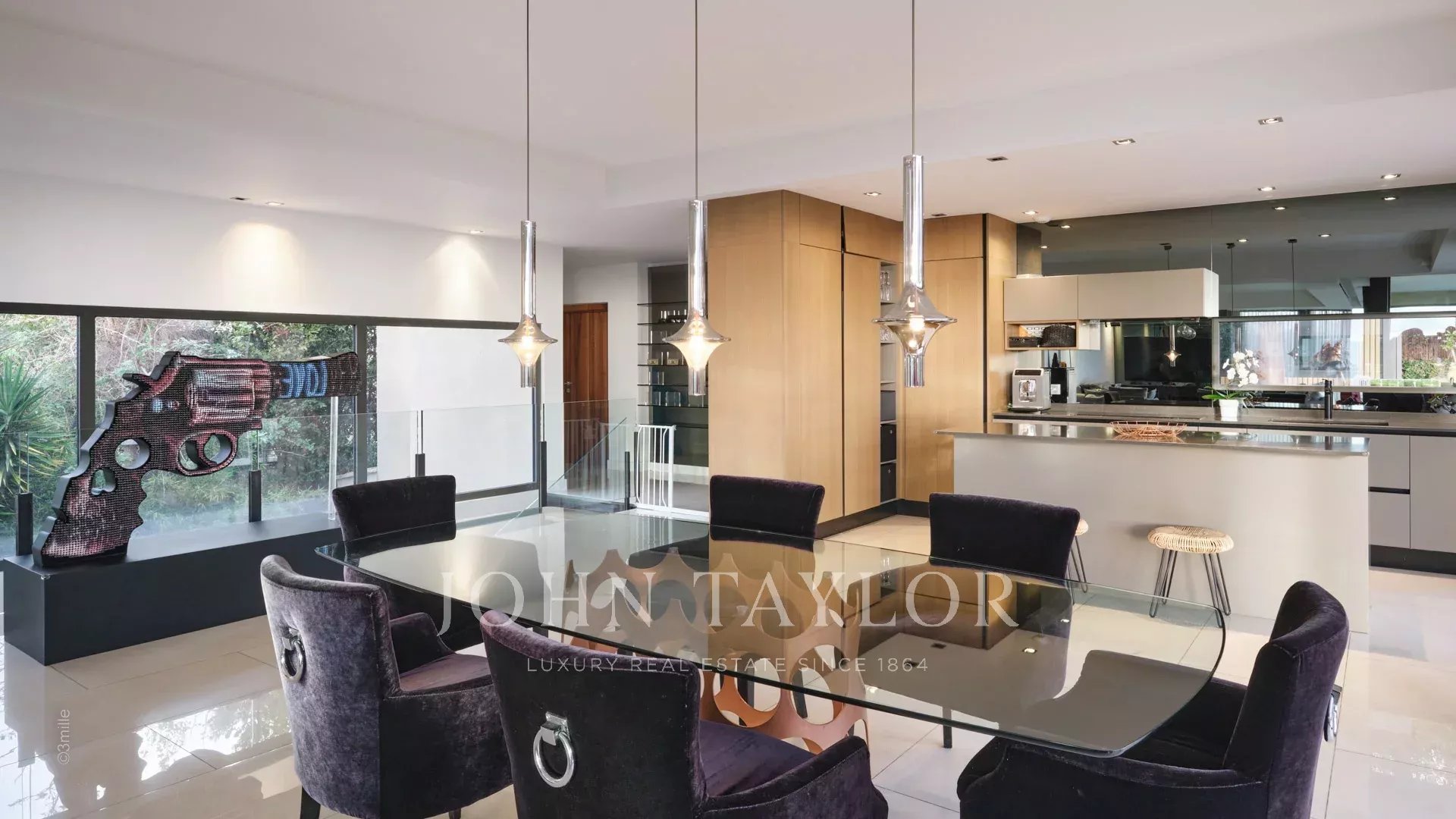 Tato vynikající moderní vila se nachází v kopcích nad Cannes, uprostřed pozemku o rozloze 1 200 m2, a nabízí krásný výhled na moře a ostrovy Lérins.