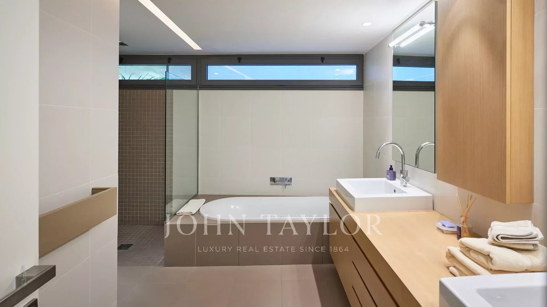 Sestupte do nižší úrovně a objevte dvě ložnice s postelemi o rozměrech 160 cm, z nichž každá má vstup na terasu s nádherným výhledem na moře. Tyto ložnice mají společnou koupelnu se sprchou/WC. Tuto úroveň doplňuje další ložnice s jedním lůžkem a vlastní sprchou/WC a přepychová hlavní ložnice s manželskou postelí velikosti King, šatnou, vlastní koupelnou a vlastní sprchou/WC, která se rovněž otevírá na terasu s výhledem na moře.