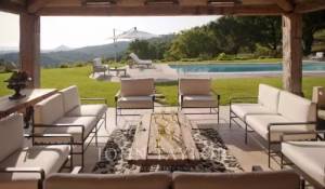 Obývací pokoj s krbem a TV (obrazovka integrovaná za zrcadlem), ze kterého se vychází na krytou terasu, letní salonek a bazén (výhled na Canneský záliv).