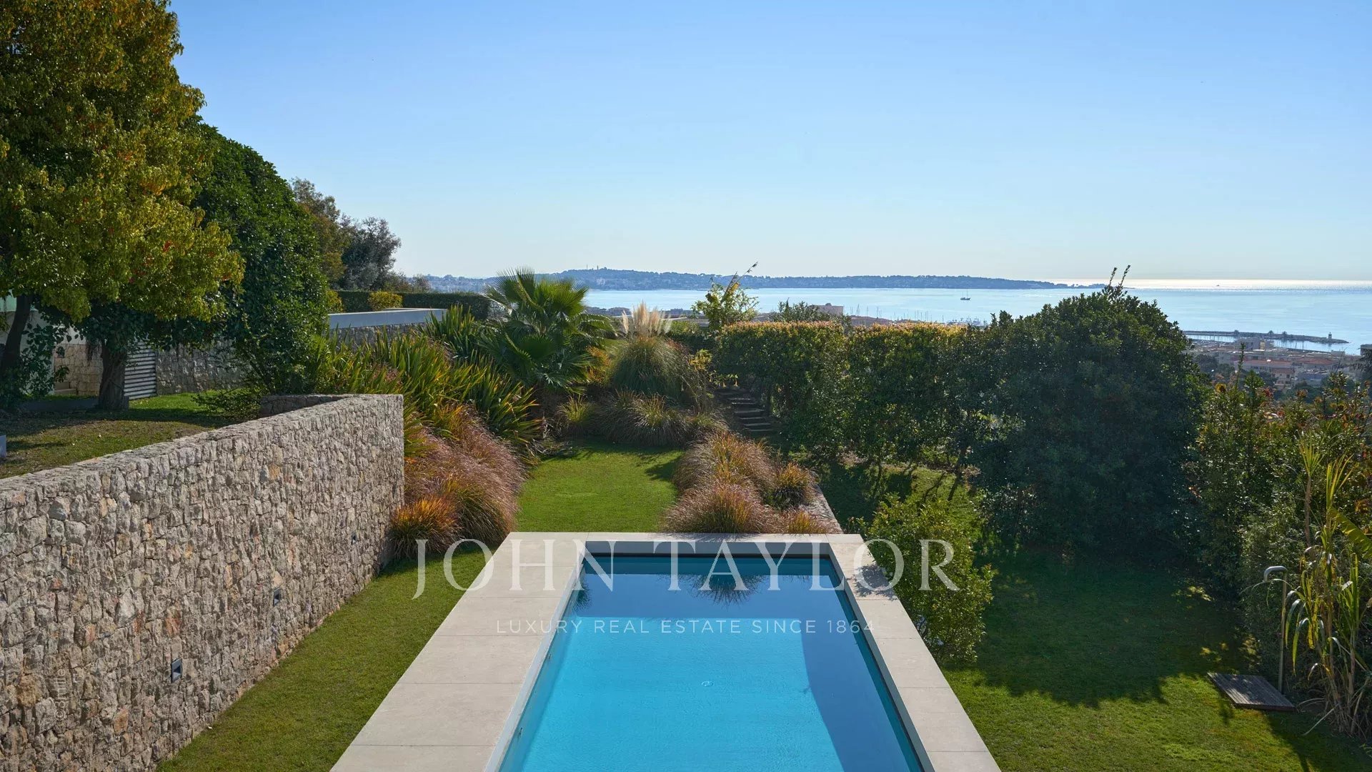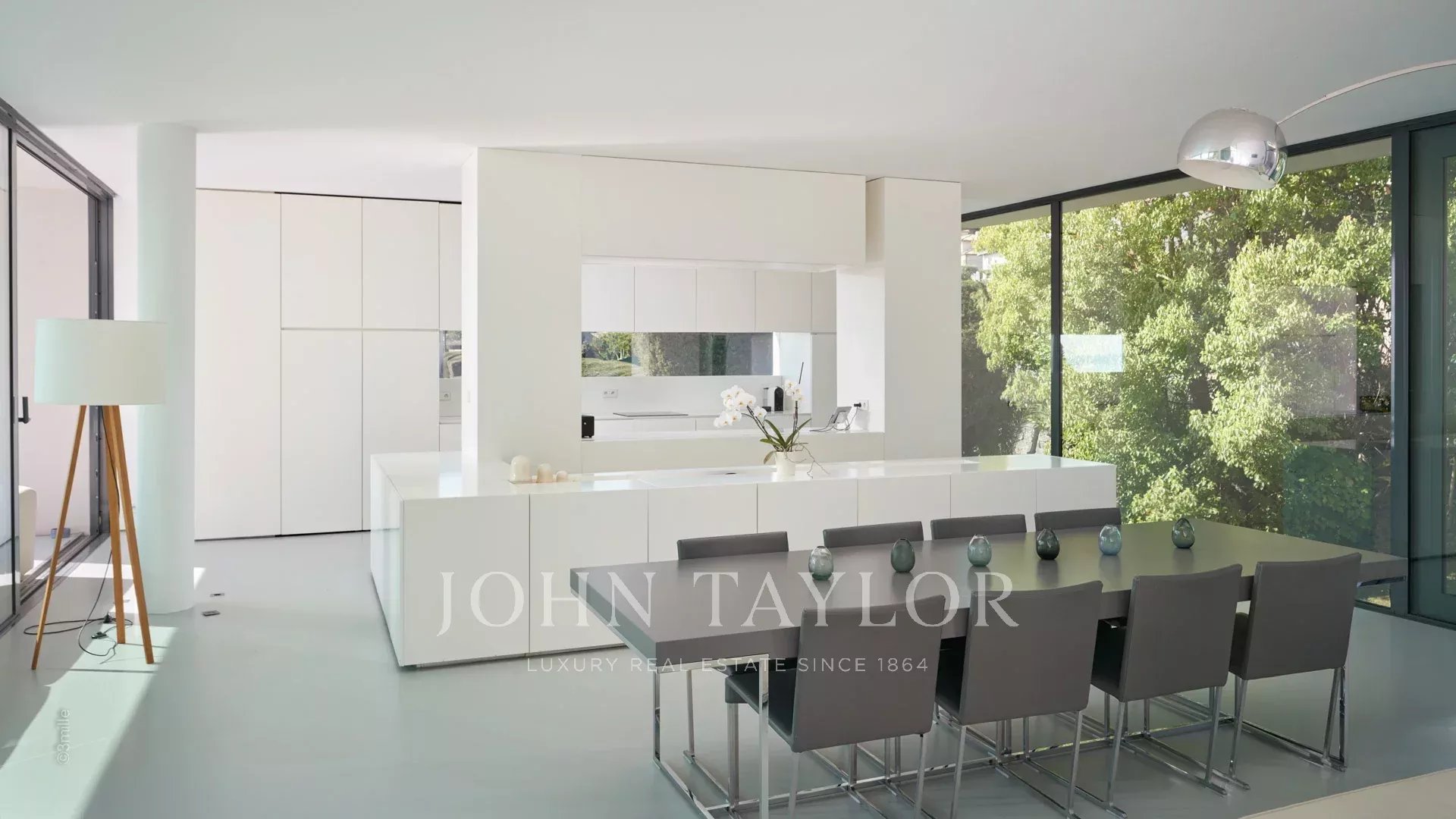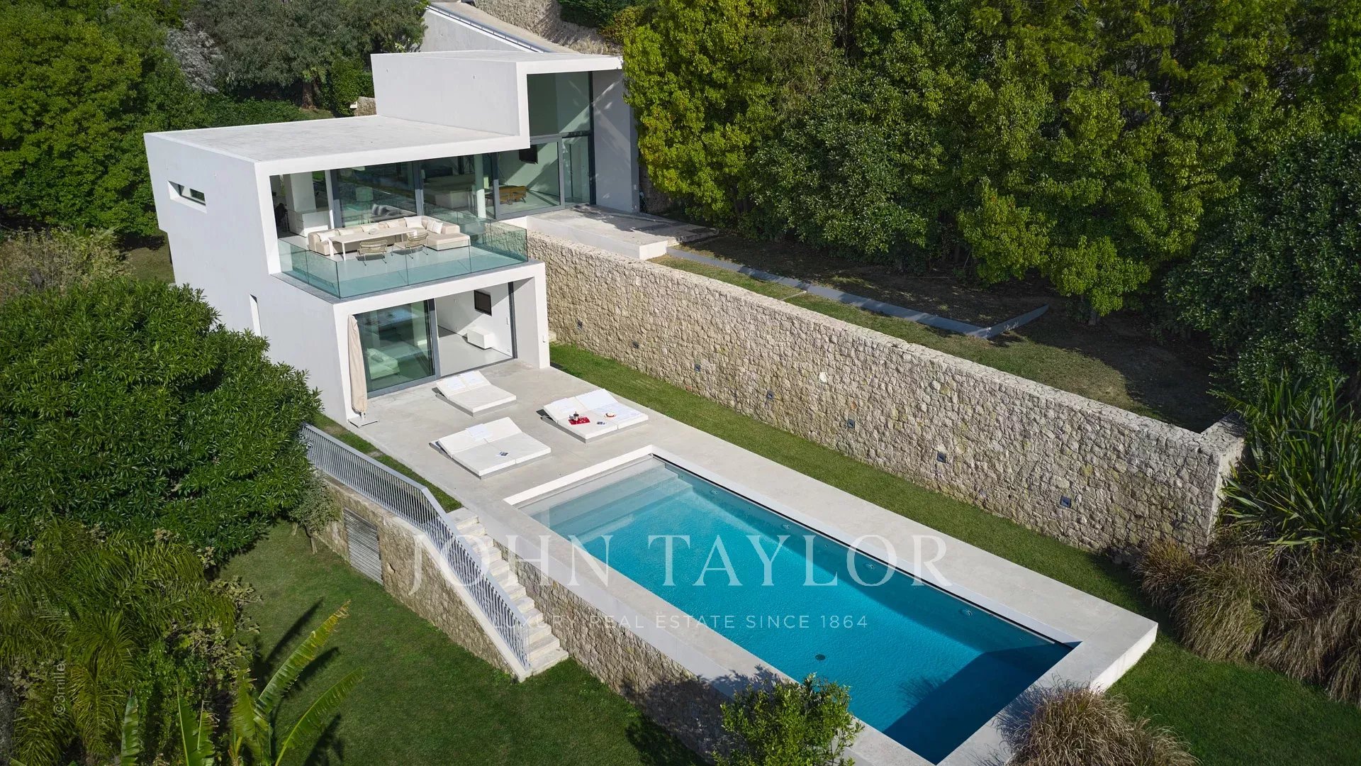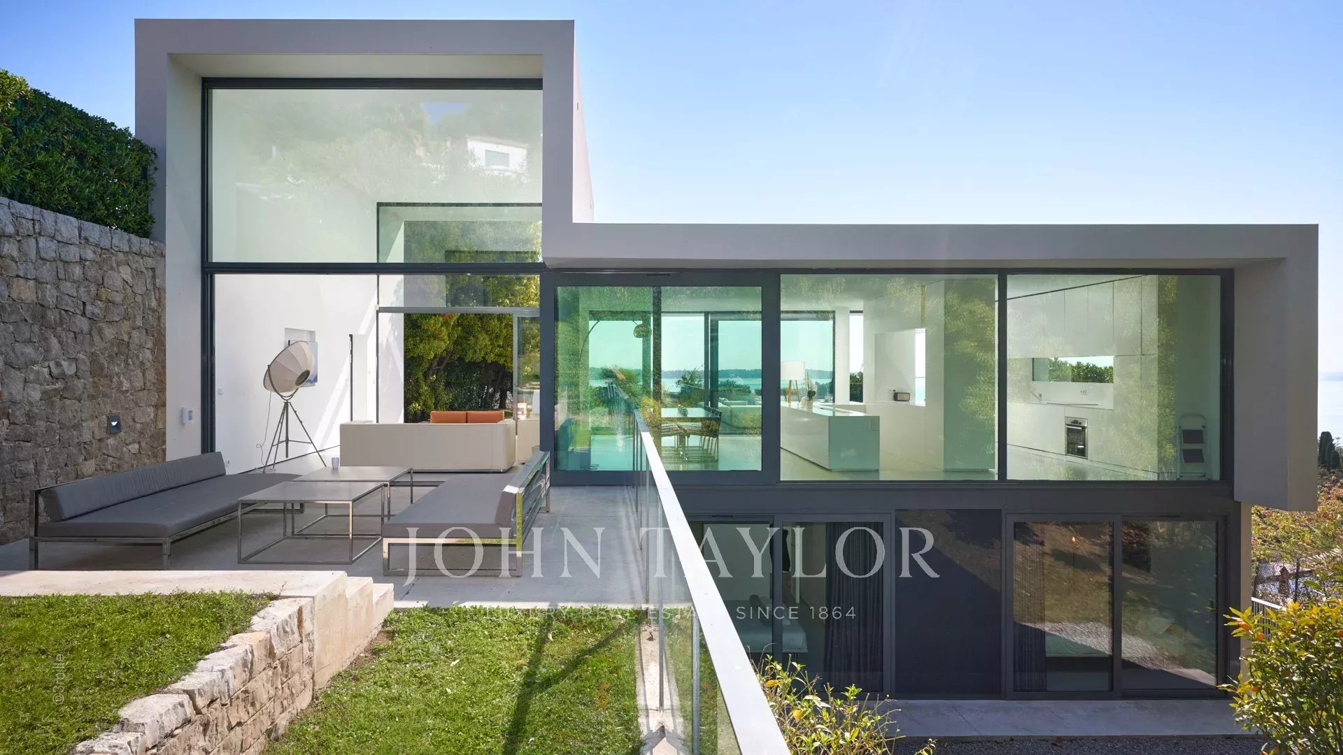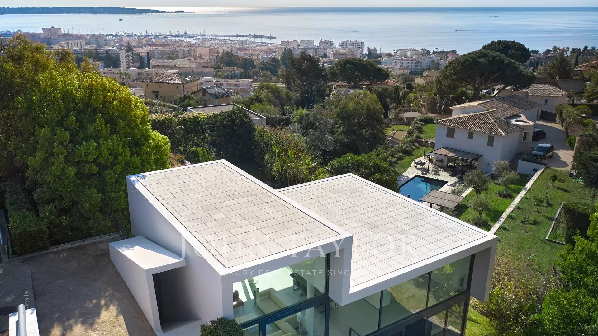 Tato krásná nemovitost moderní architektury postavená na 2 úrovních se nachází na výšinách Golfe-Juan a je plně klimatizovaná: