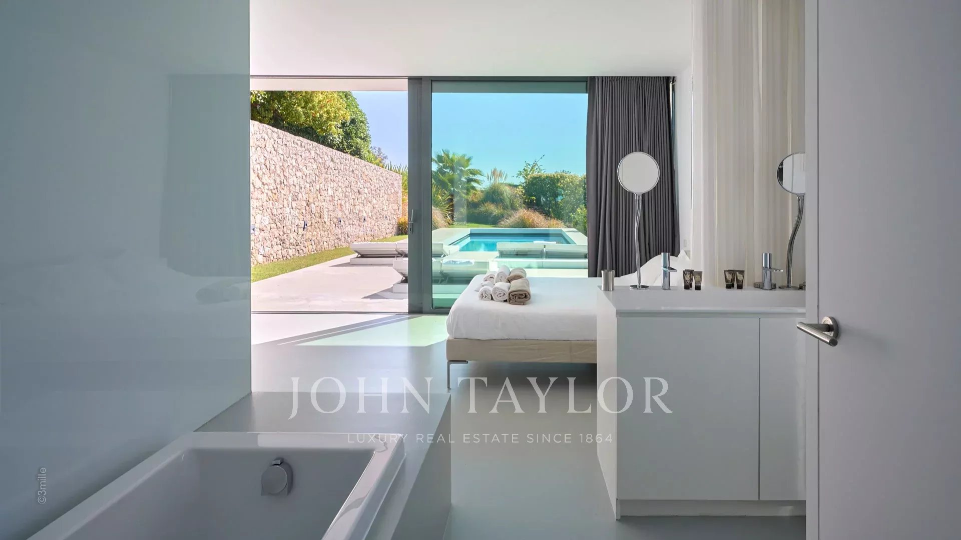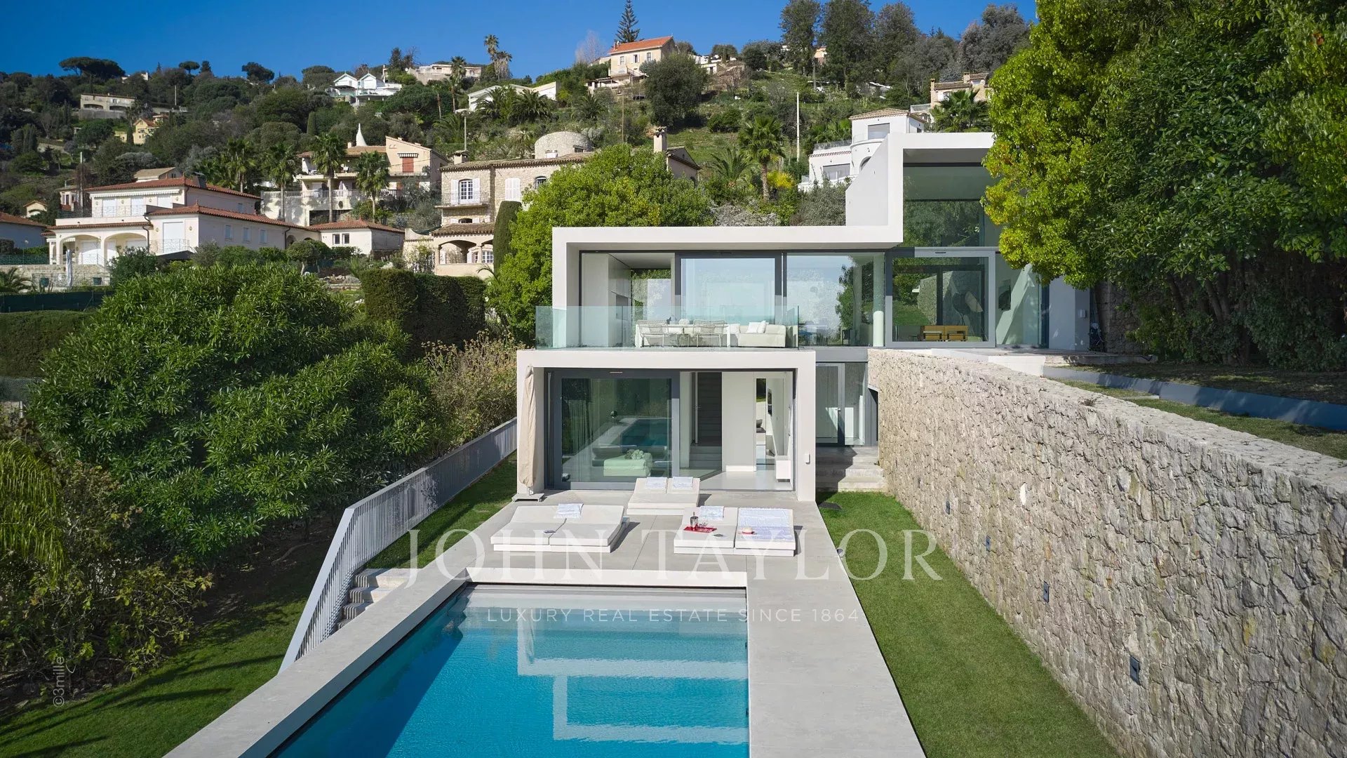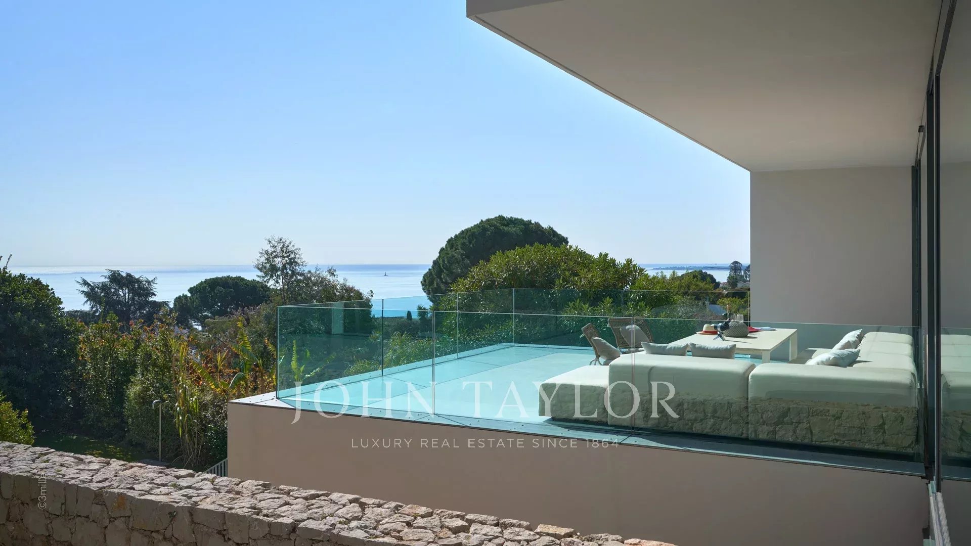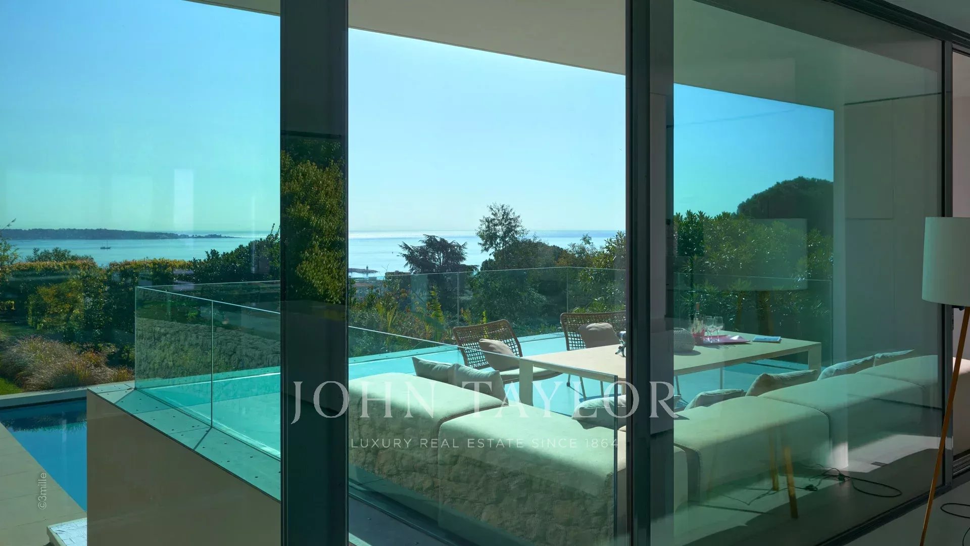 Tato krásná nemovitost moderní architektury postavená na 2 úrovních se nachází na výšinách Golfe-Juan a je plně klimatizovaná: