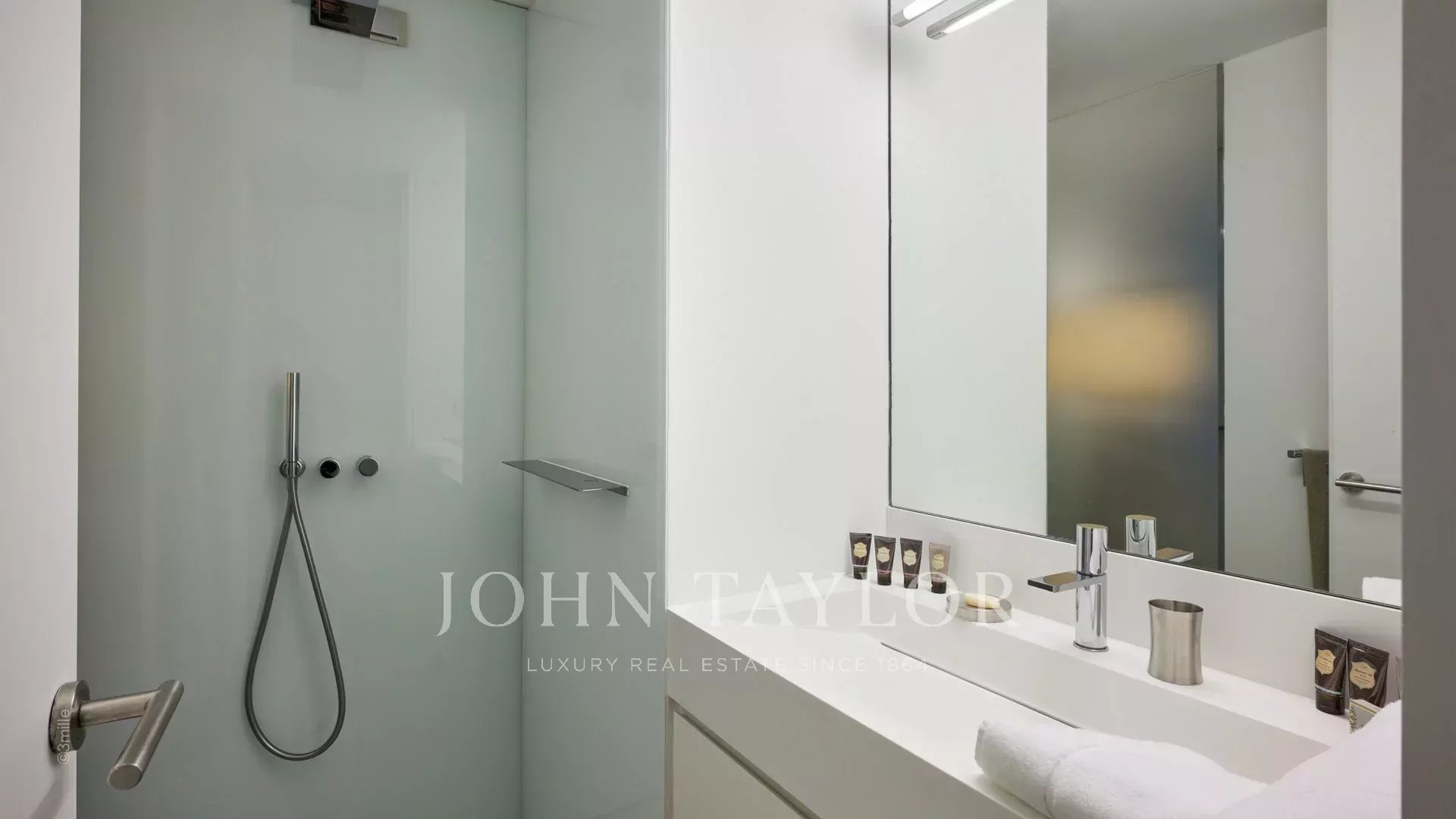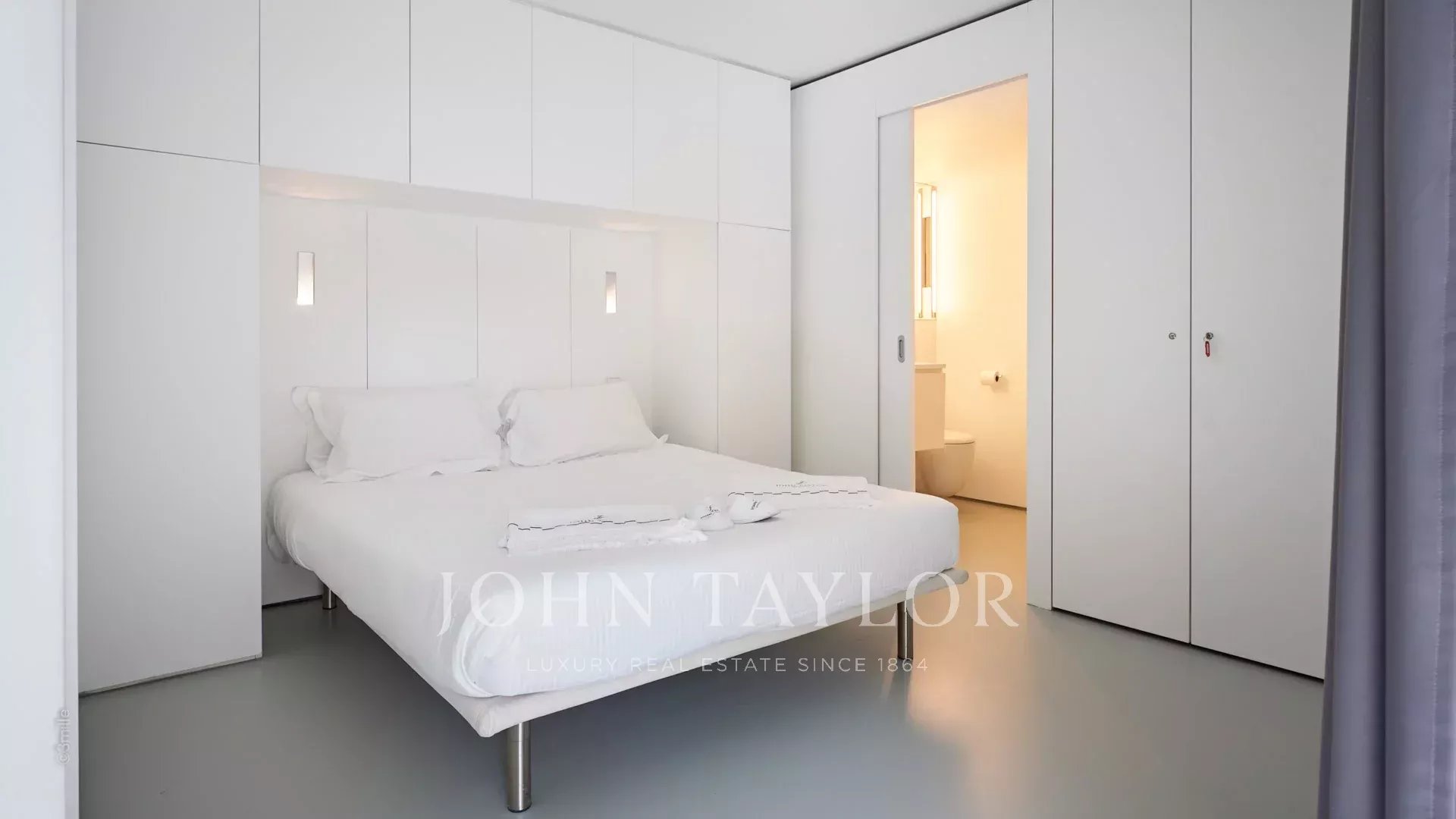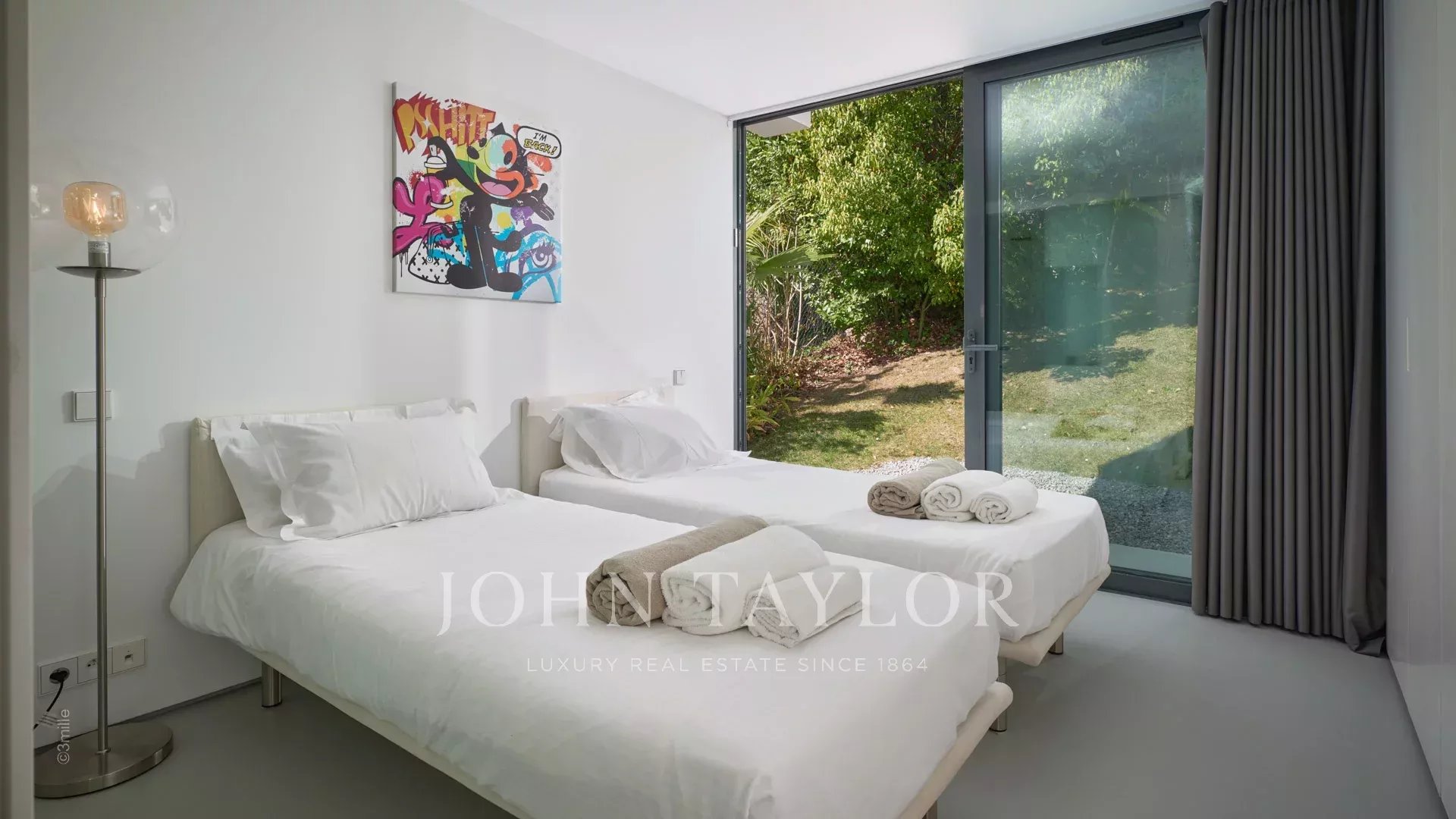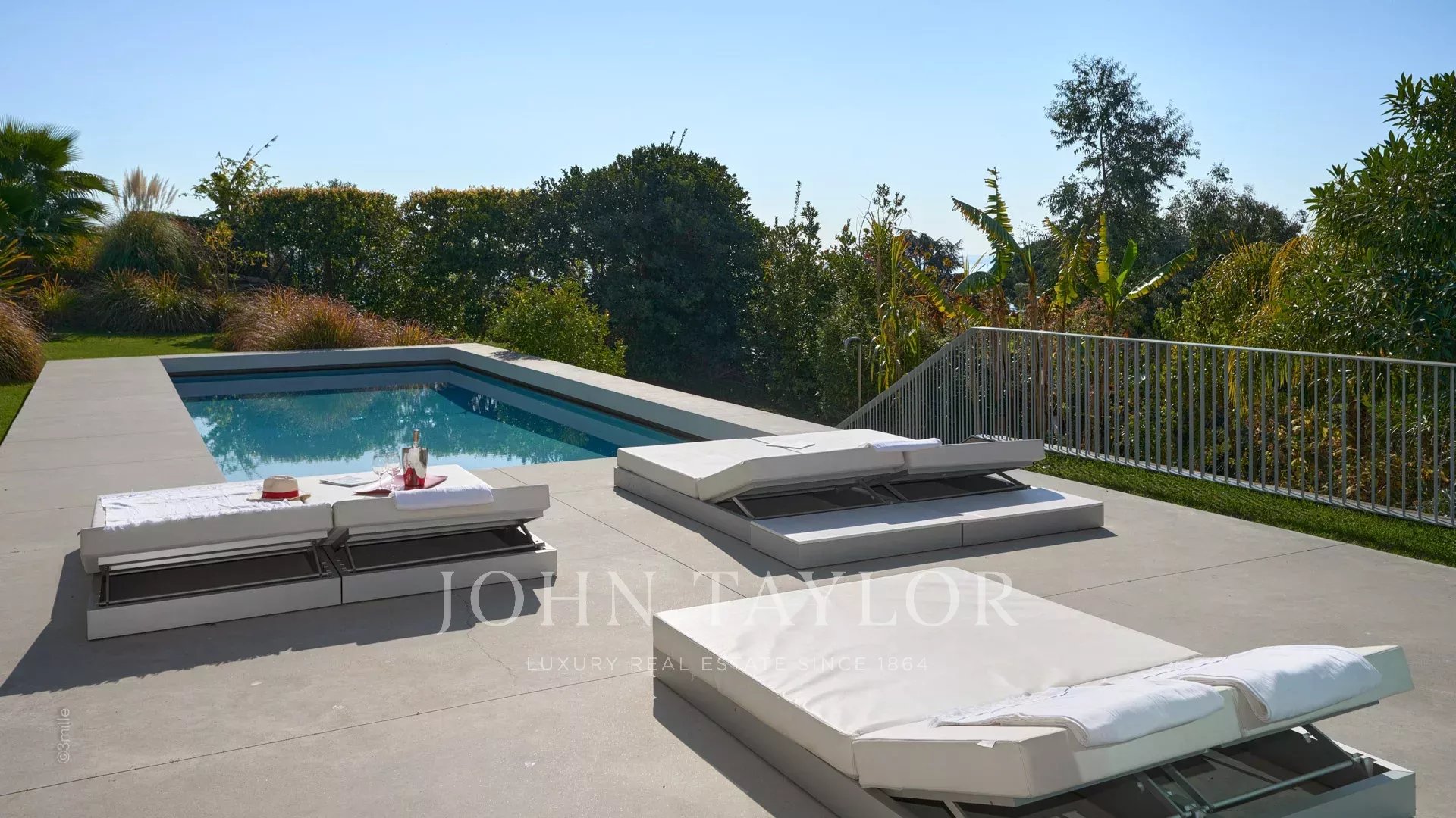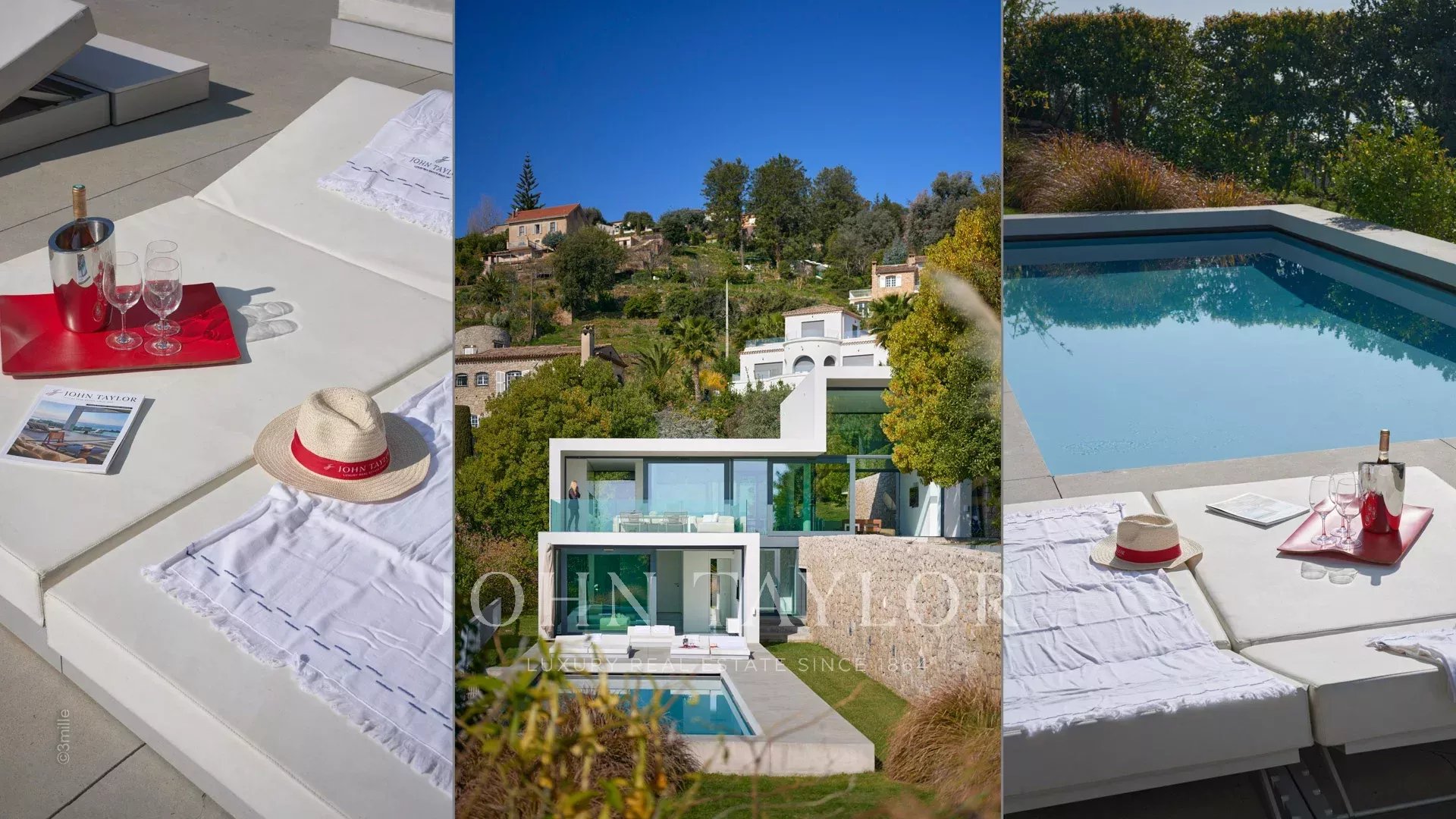 Tato krásná nemovitost moderní architektury postavená na 2 úrovních se nachází na výšinách Golfe-Juan a je plně klimatizovaná: