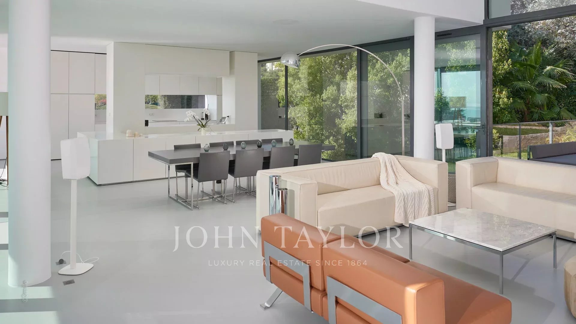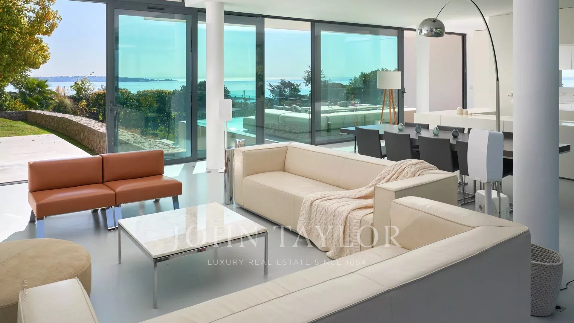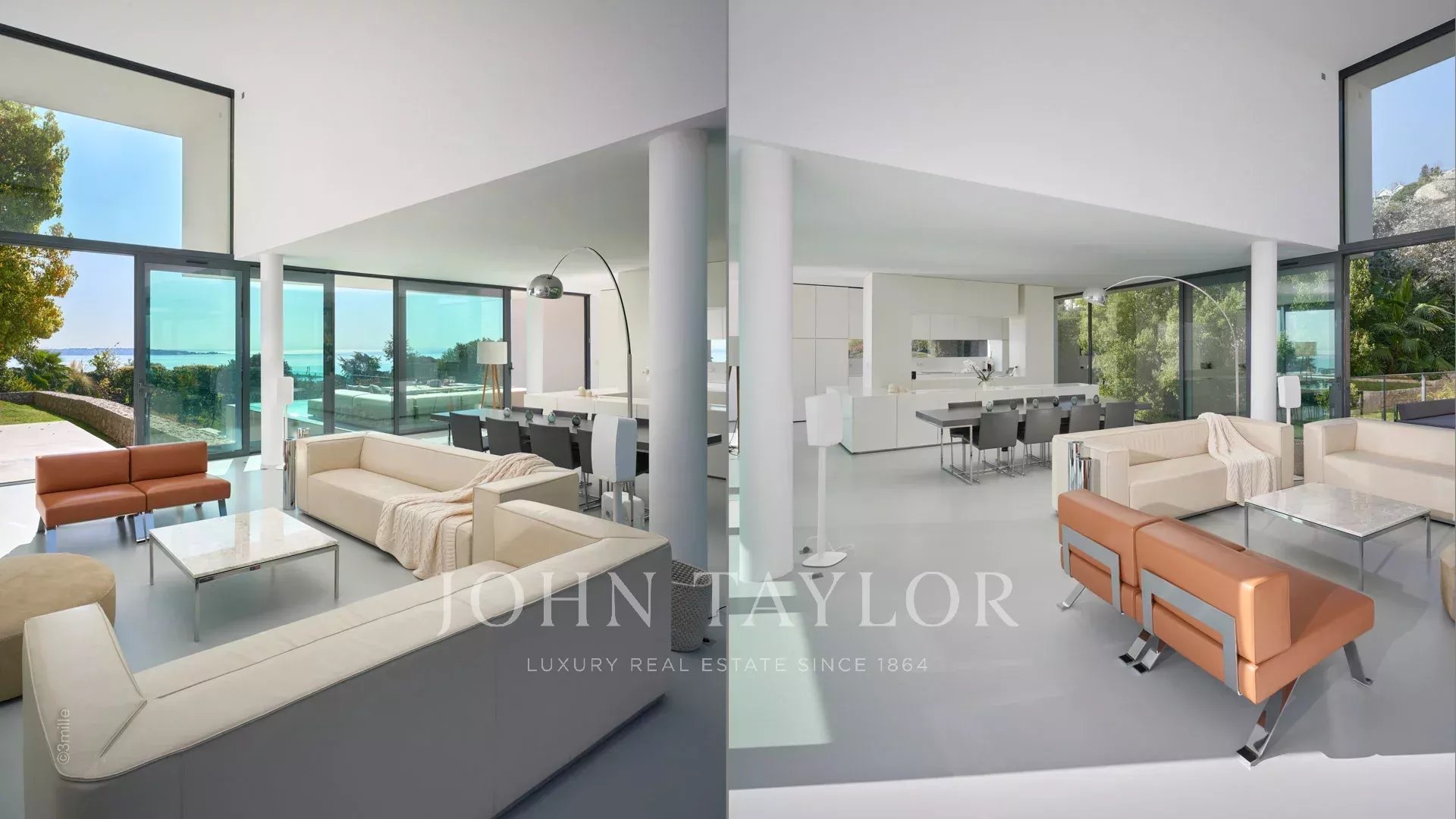 Velká přijímací místnost s obývacím pokojem, jídelnou a otevřenou kuchyní. Vše se otevírá na terasu s výhledem na moře, bazén a zahradu.