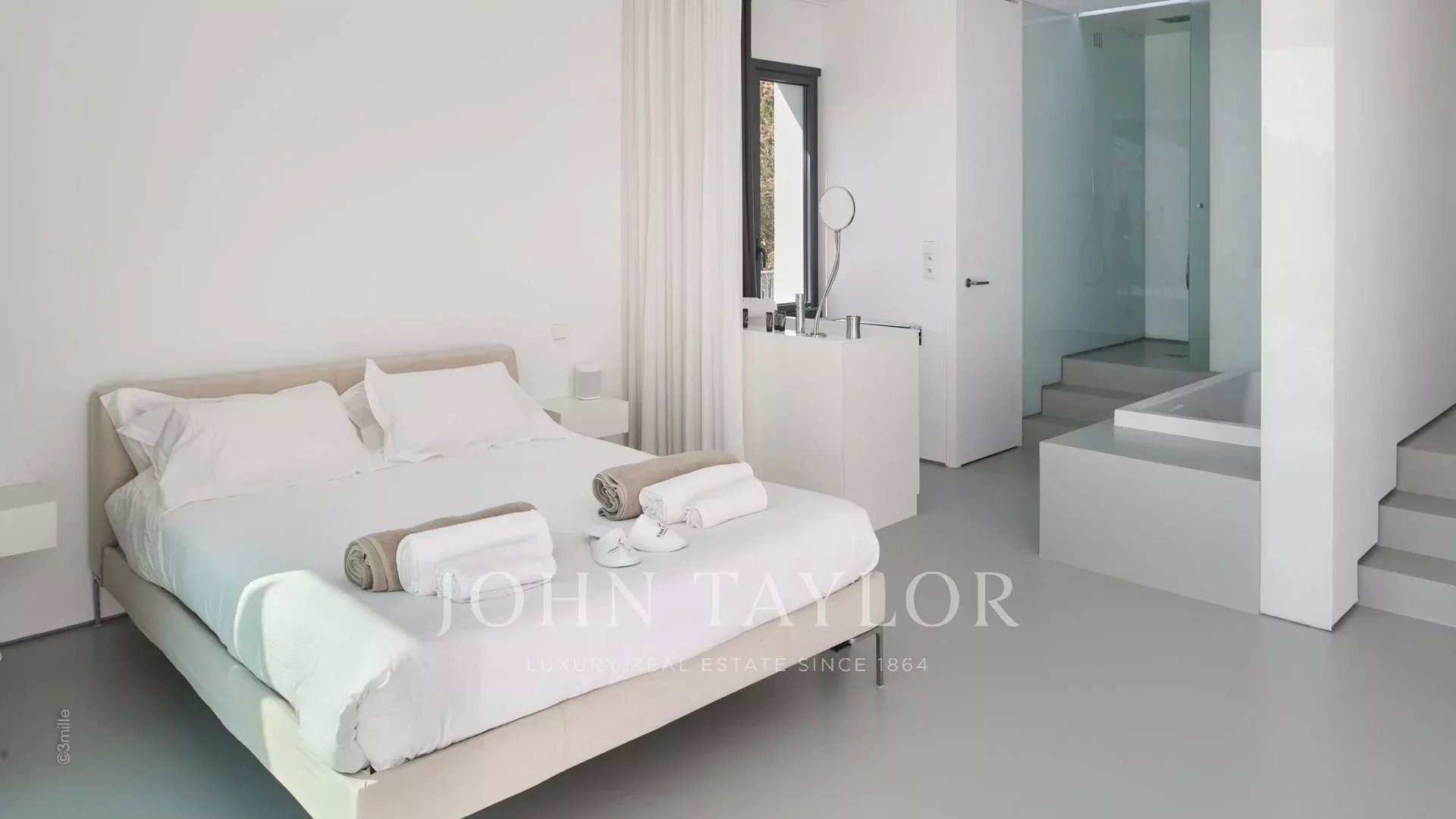 Hlavní ložnice (manželská postel) s výhledem na terasu, výhled na moře - plně otevřená koupelna / WC