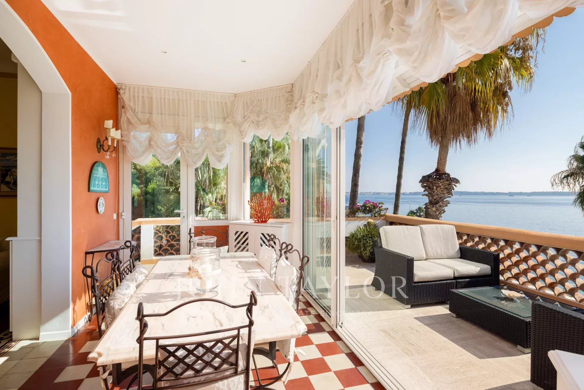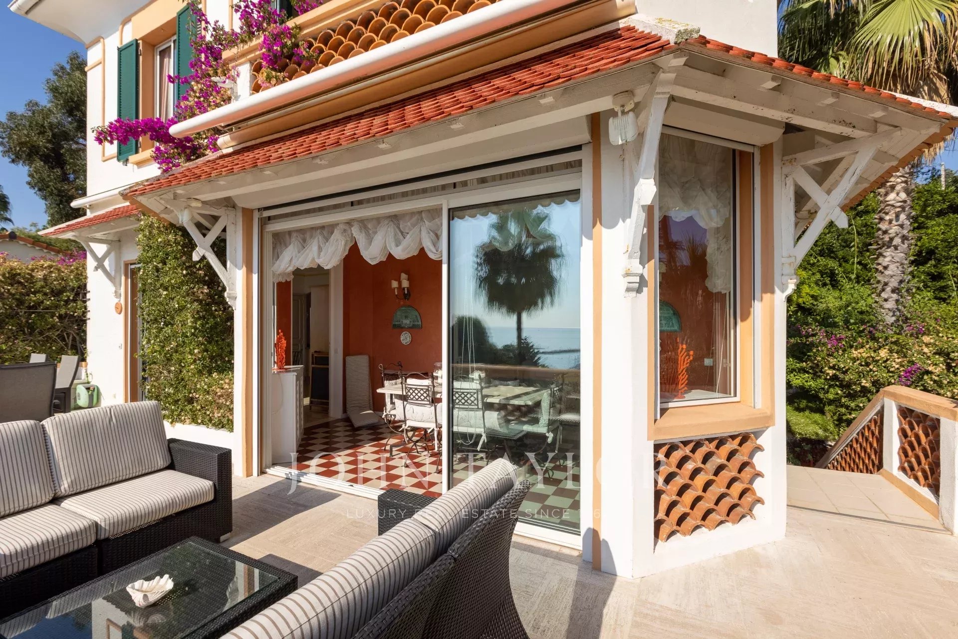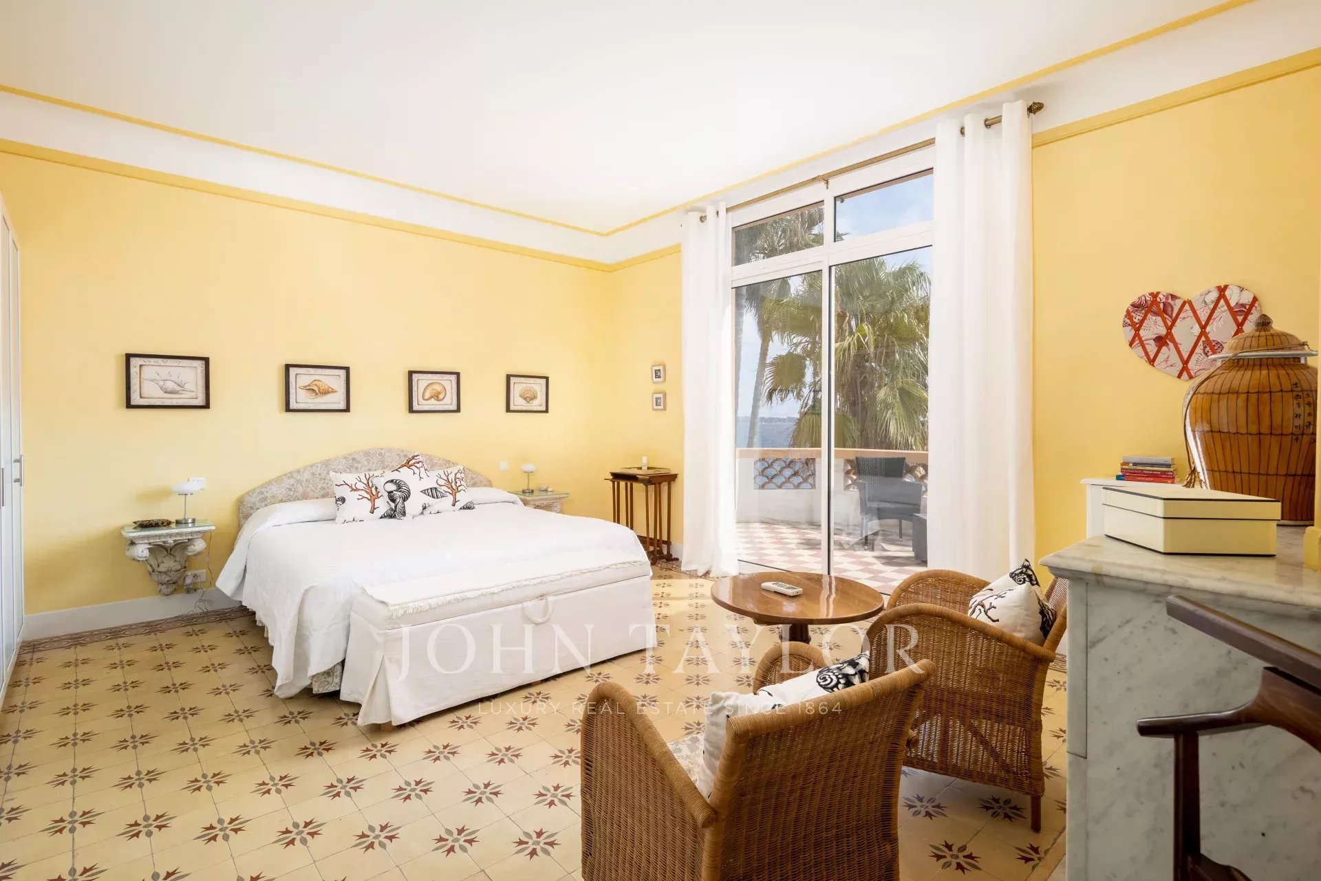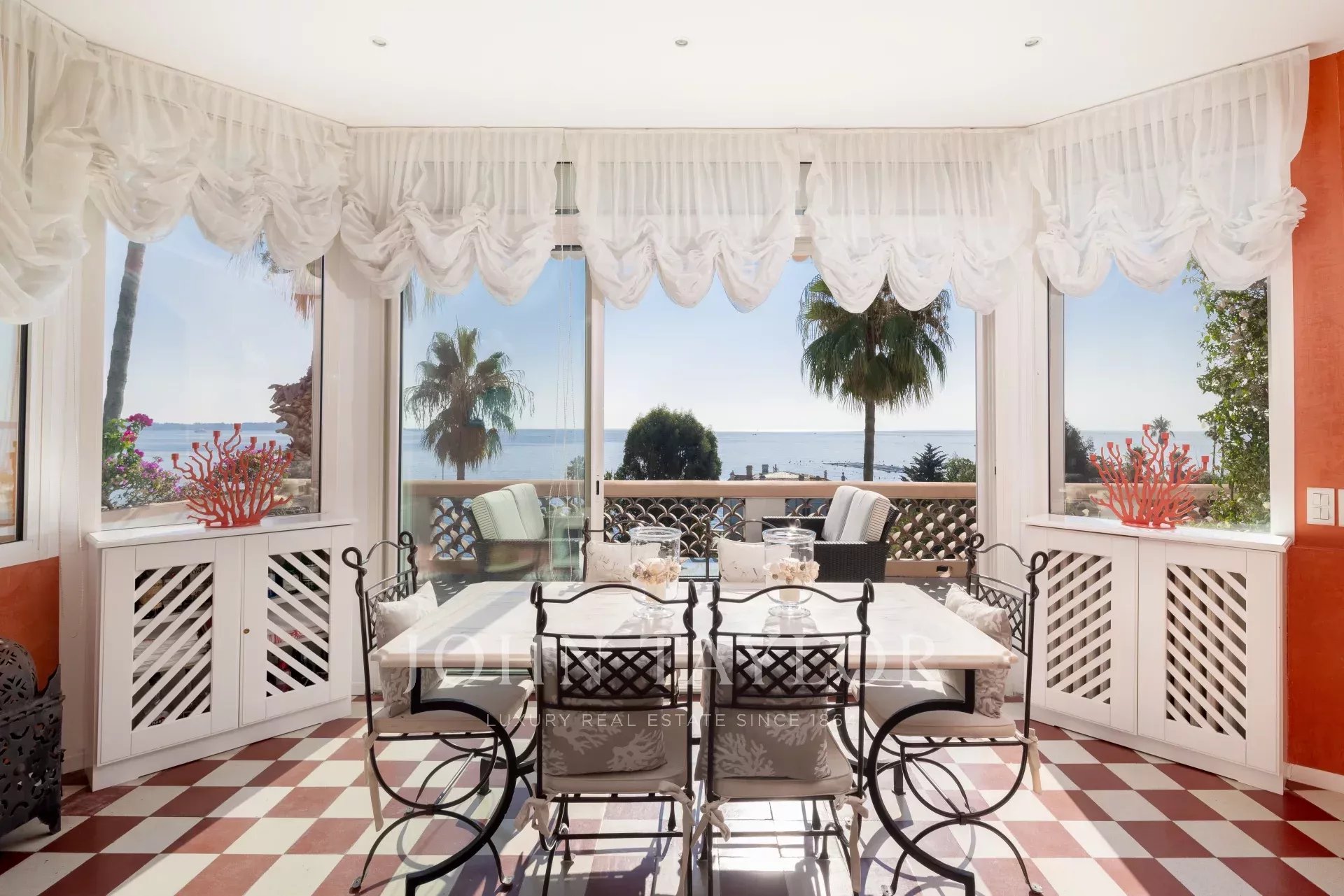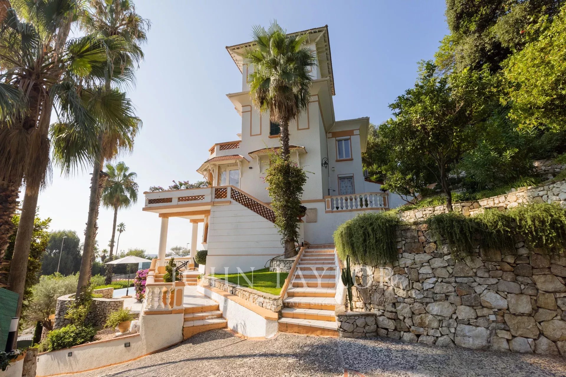 Vila z období Belle Epoque v blízkosti Cannes a na ideálním místě na nábřeží, na upraveném pozemku o rozloze cca 1 000 m². Vynikající výhled na moře a Cap d'Antibes.