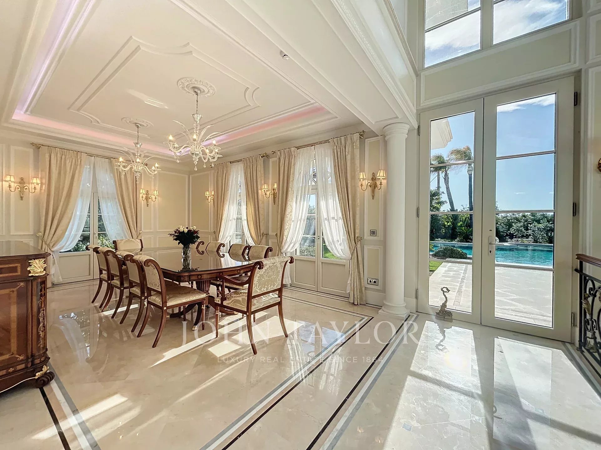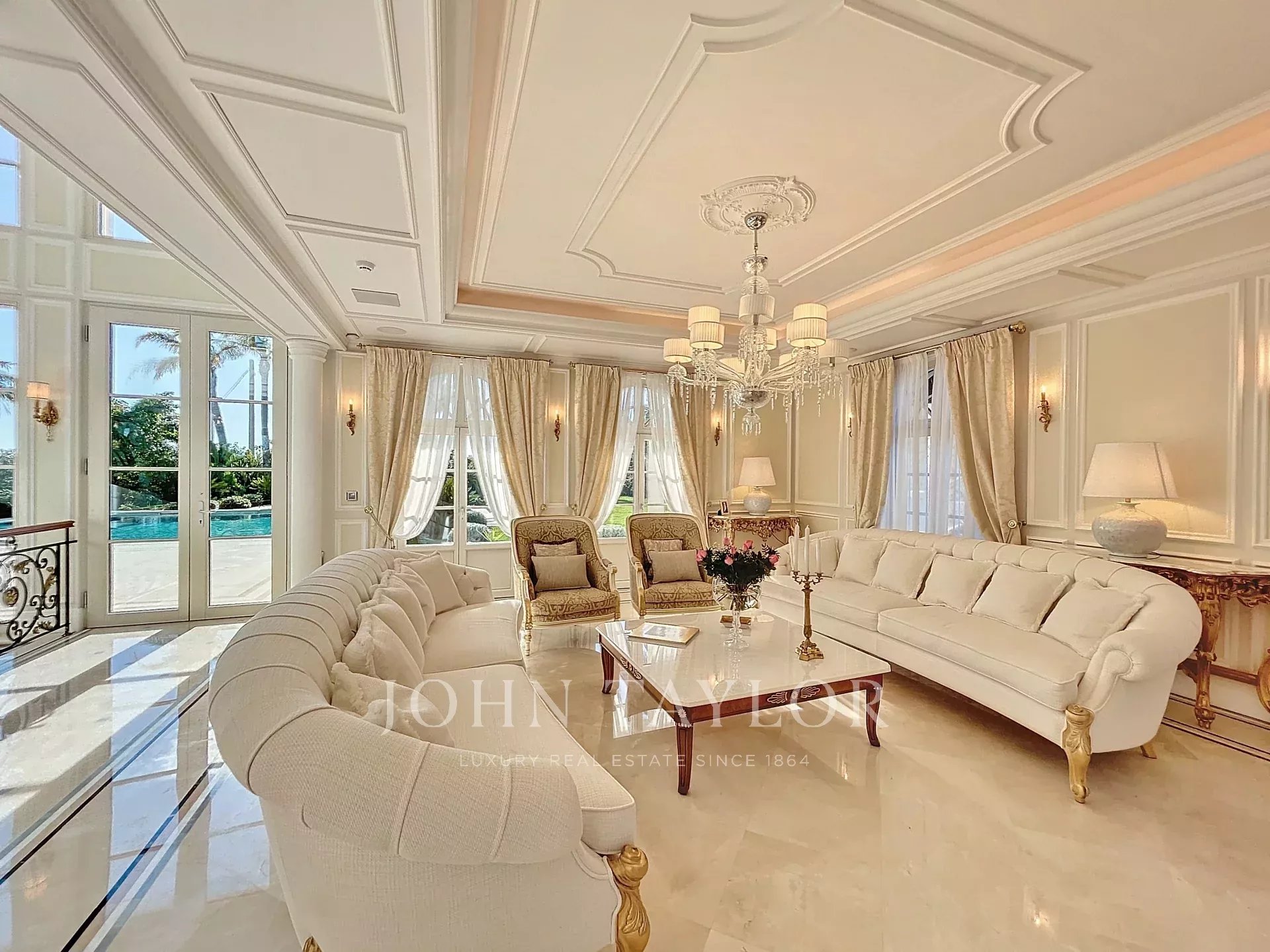 Obývací pokoj s nádherným výhledem na bazén.