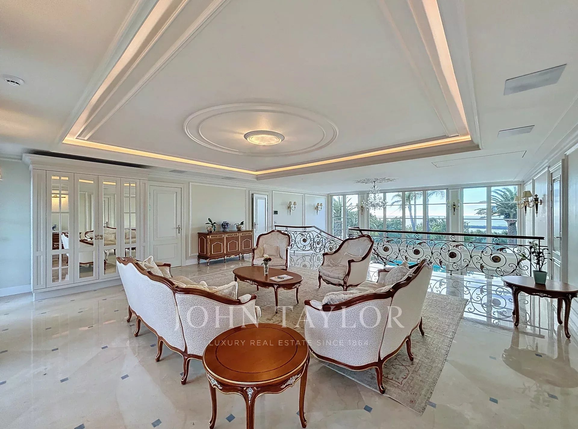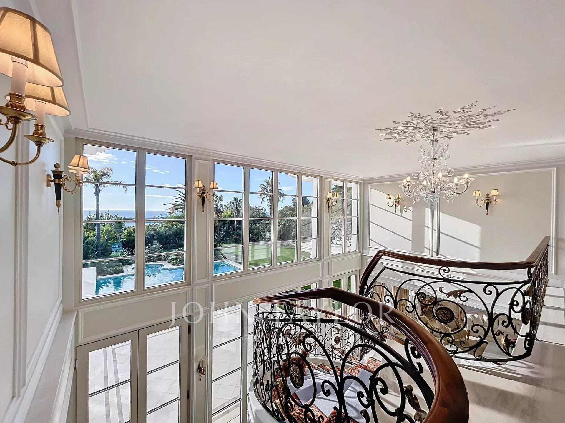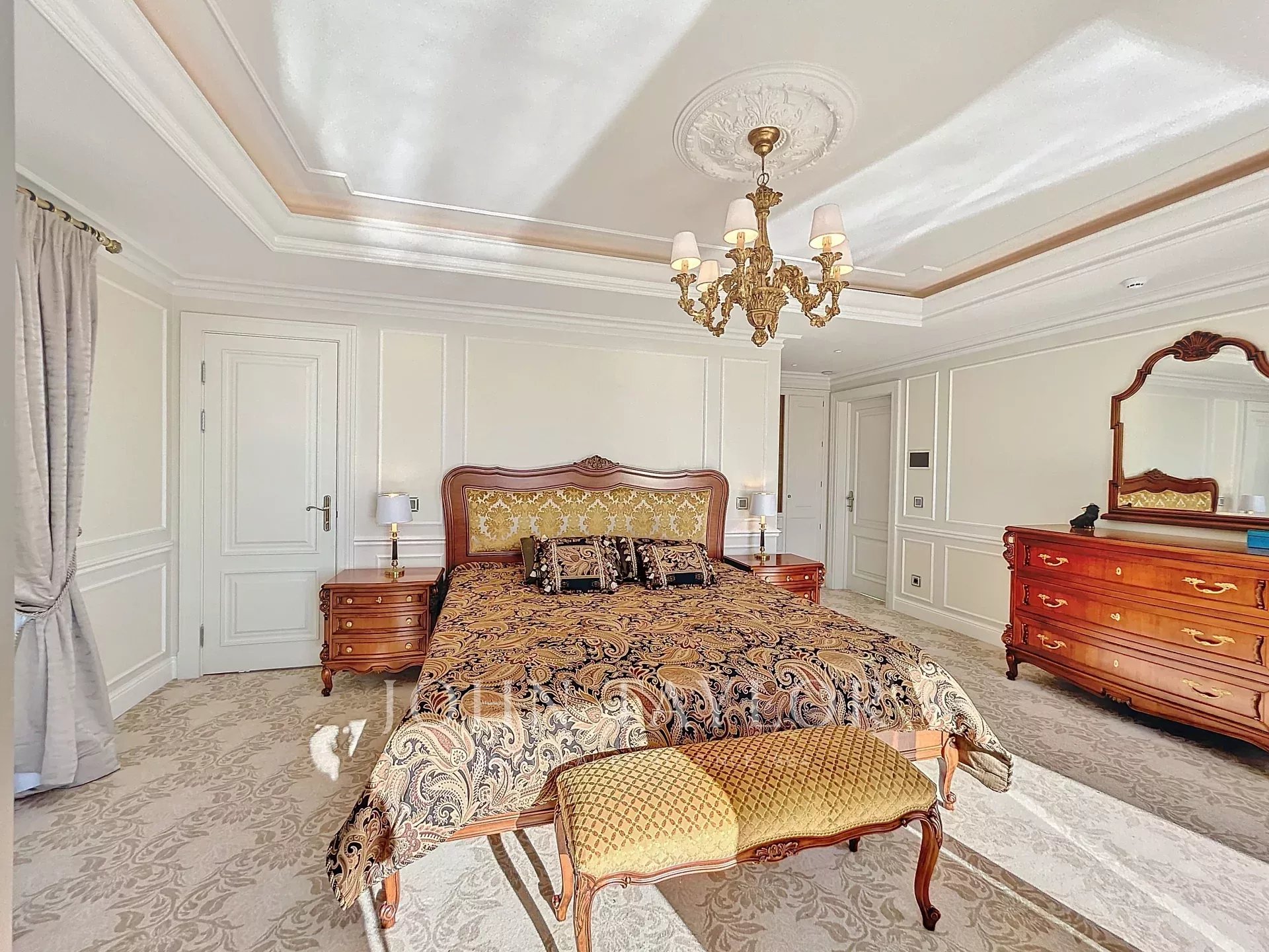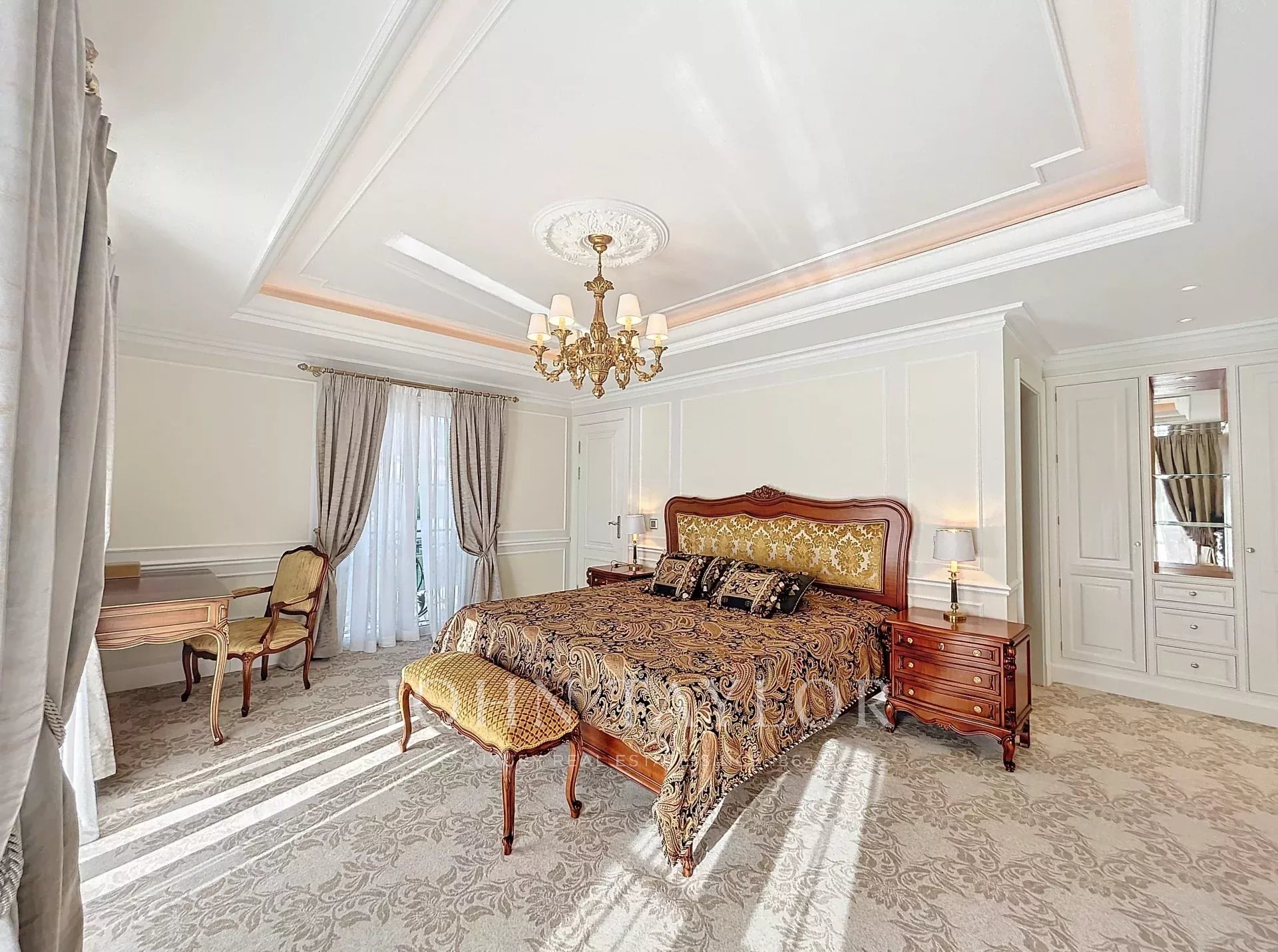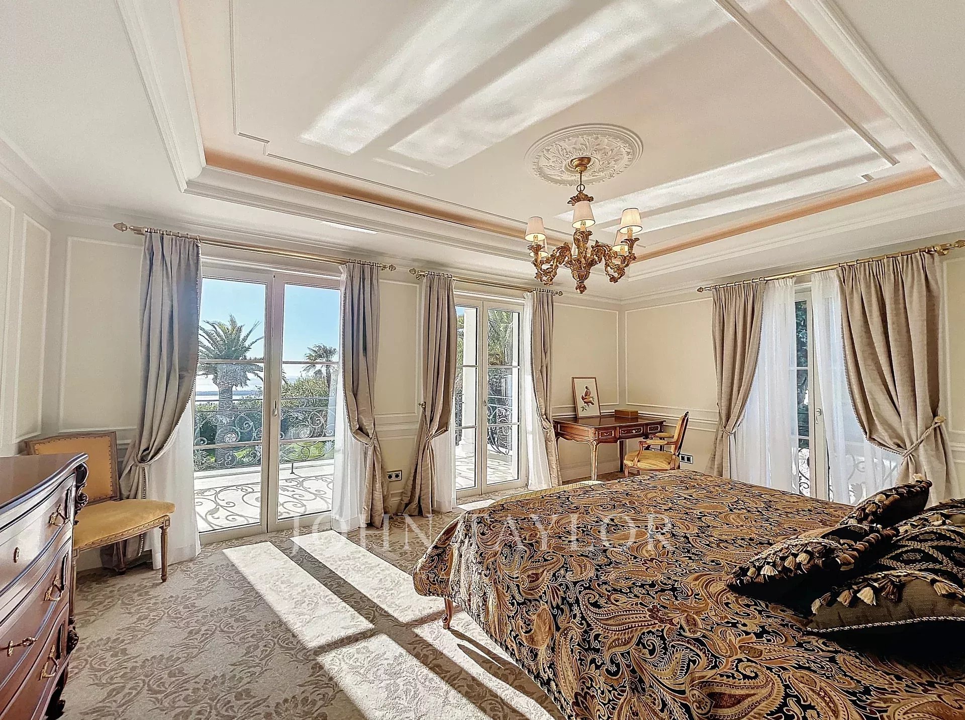 Hlavní ložnice s výhledem na terasu s výhledem na moře a ostrovy Lérins, se šatnou a koupelnou se sprchou.