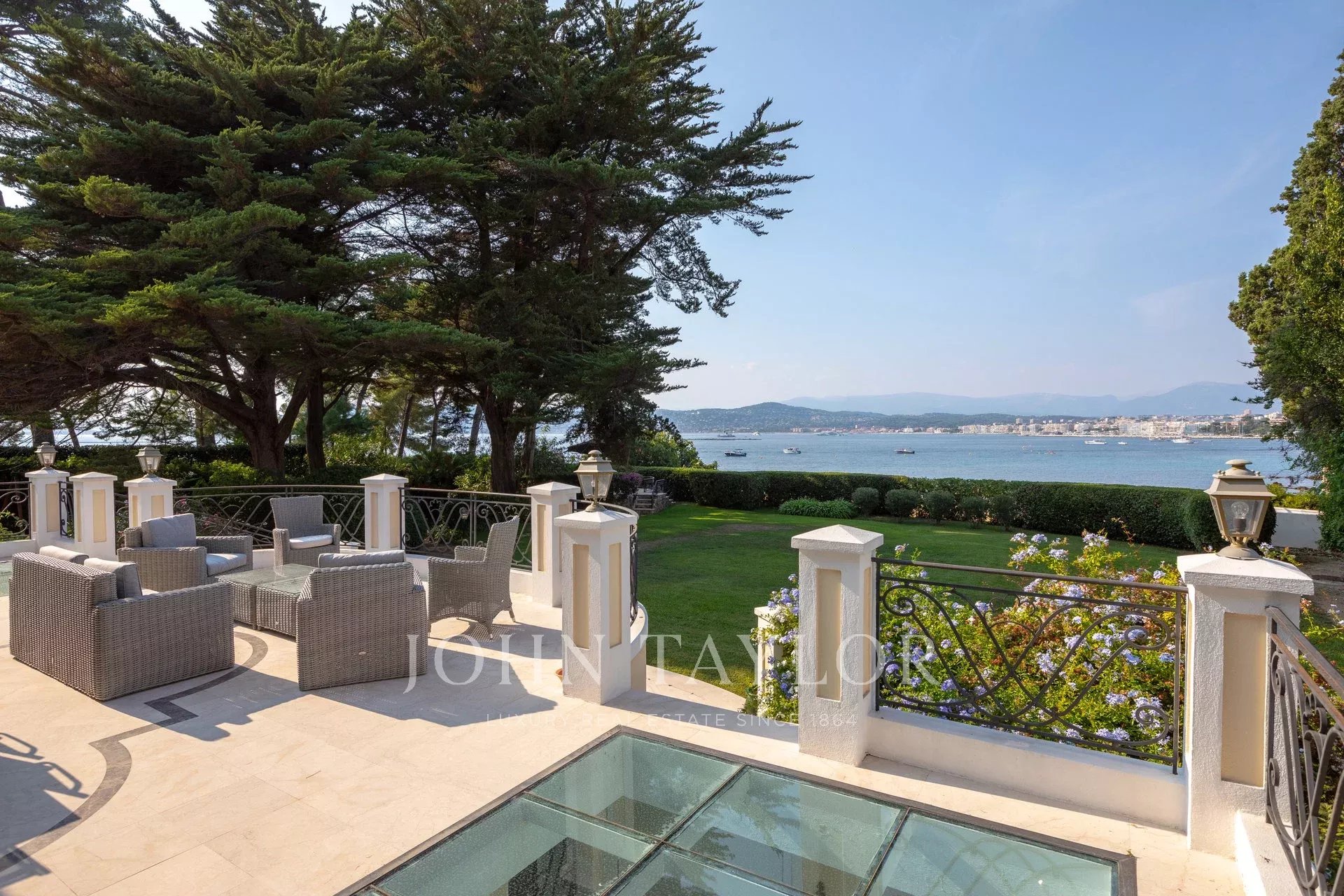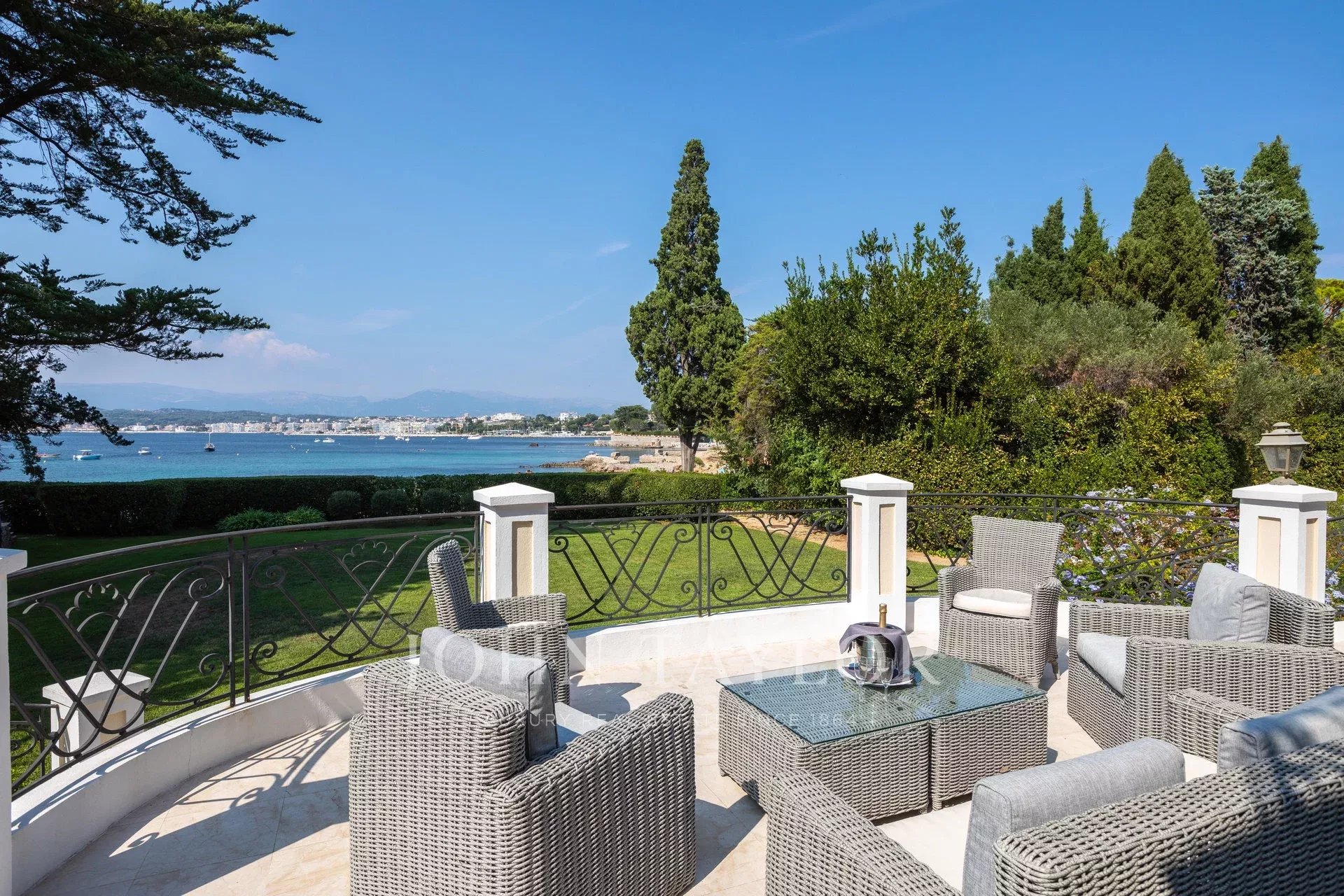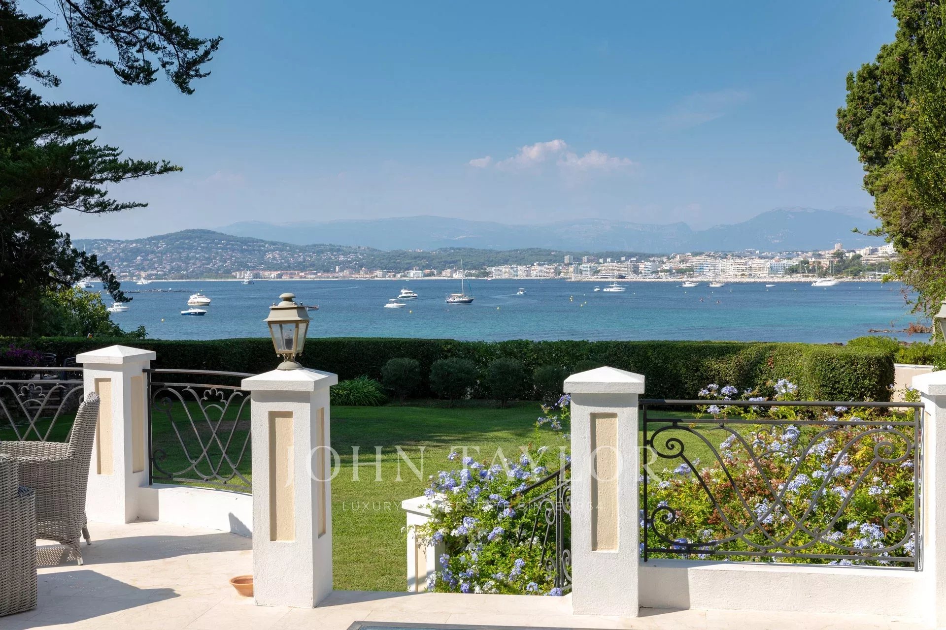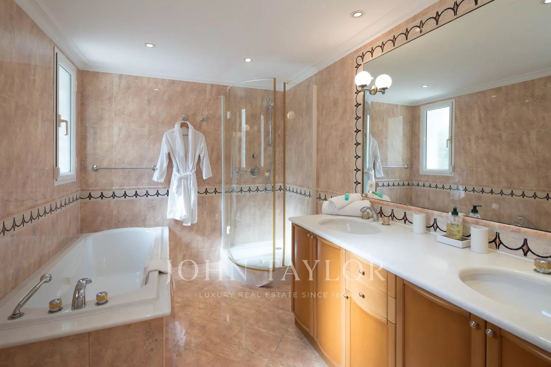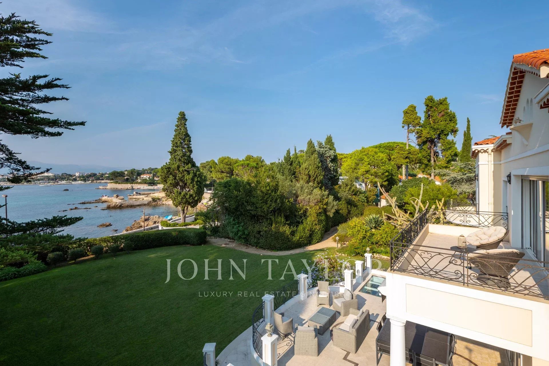 Nádherná třípodlažní nemovitost na bulváru Boulevard du Littoral. Nachází se jen několik minut chůze od hotelu Eden Roc a nabízí krásný výhled na záliv Juan Les Pins, ostrovy Lérins a Esterel. Kompletně zrekonstruovaný a klimatizovaný dům je obklopen 9 000 m2 dobře navrženého pozemku s trávníky, květinami a krásnými stromy.