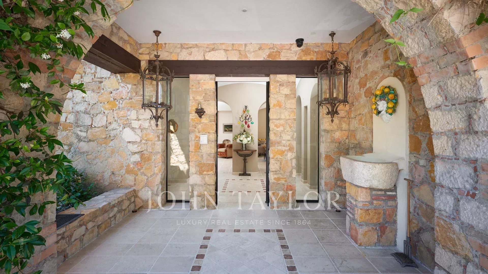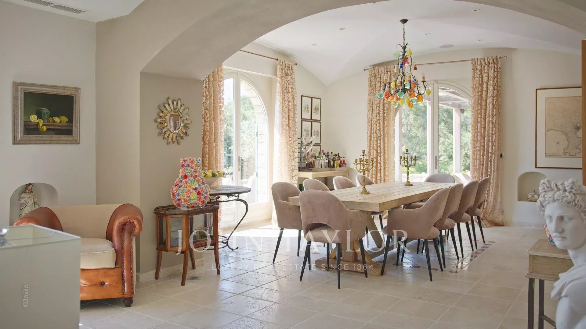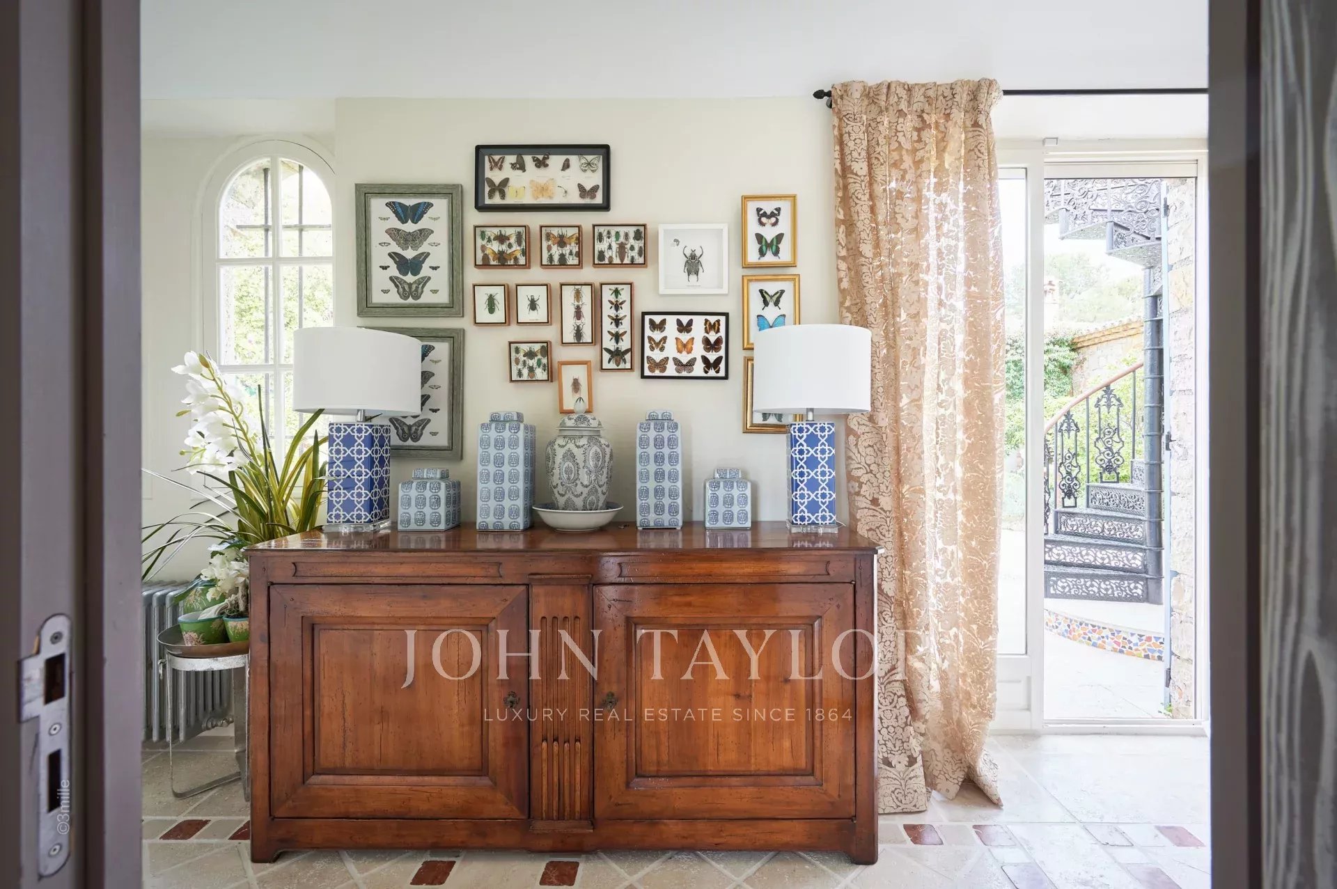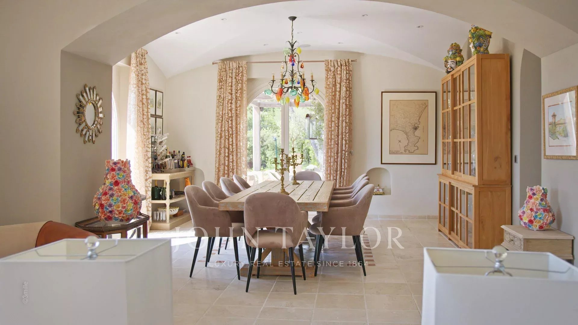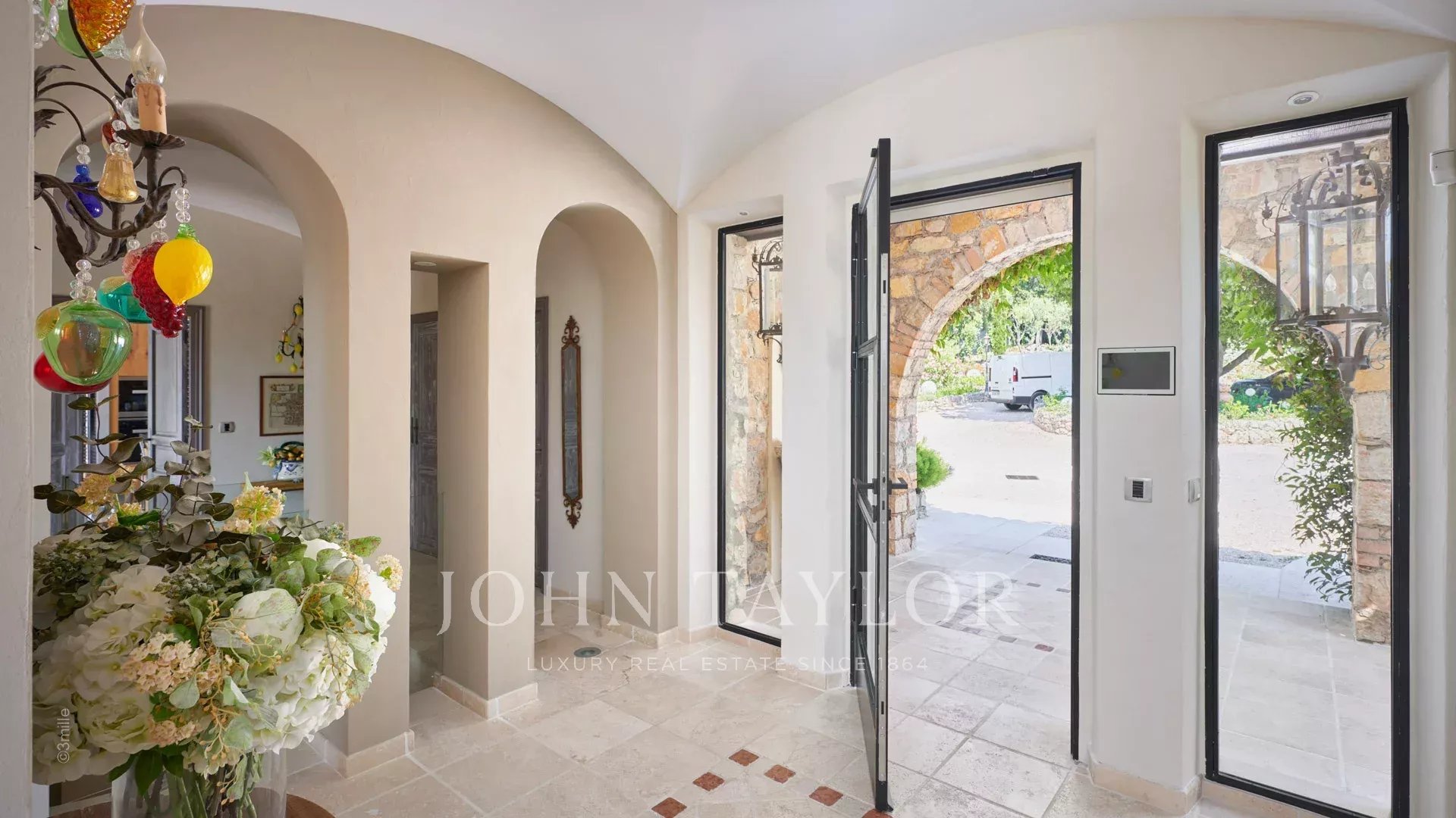 Vstupní hala vedoucí do přijímacího pokoje, který se skládá z velkého obývacího pokoje a jídelny a přes velká okna se otevírá na terasy.
