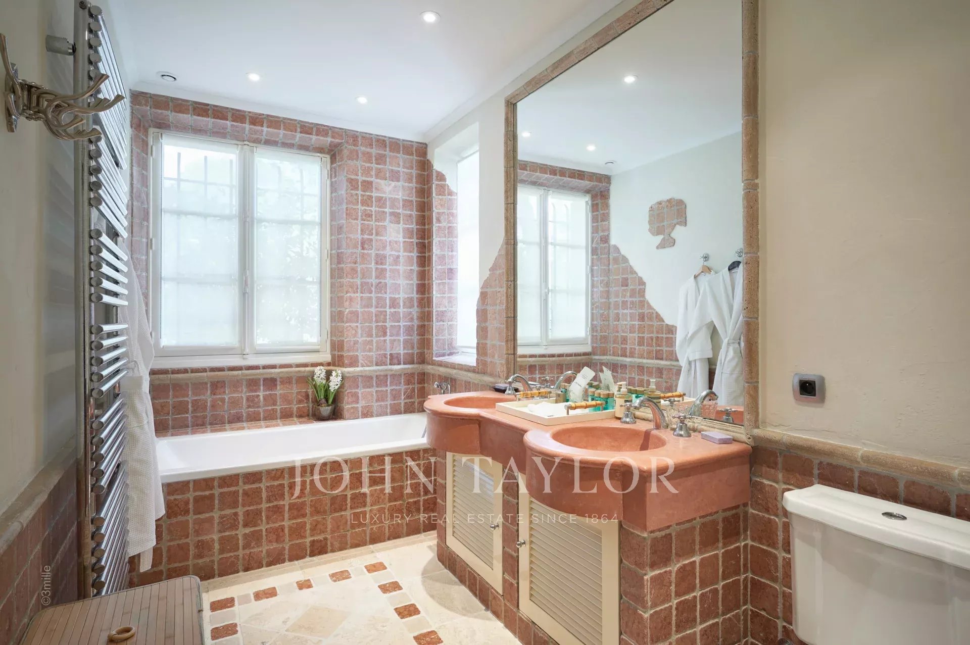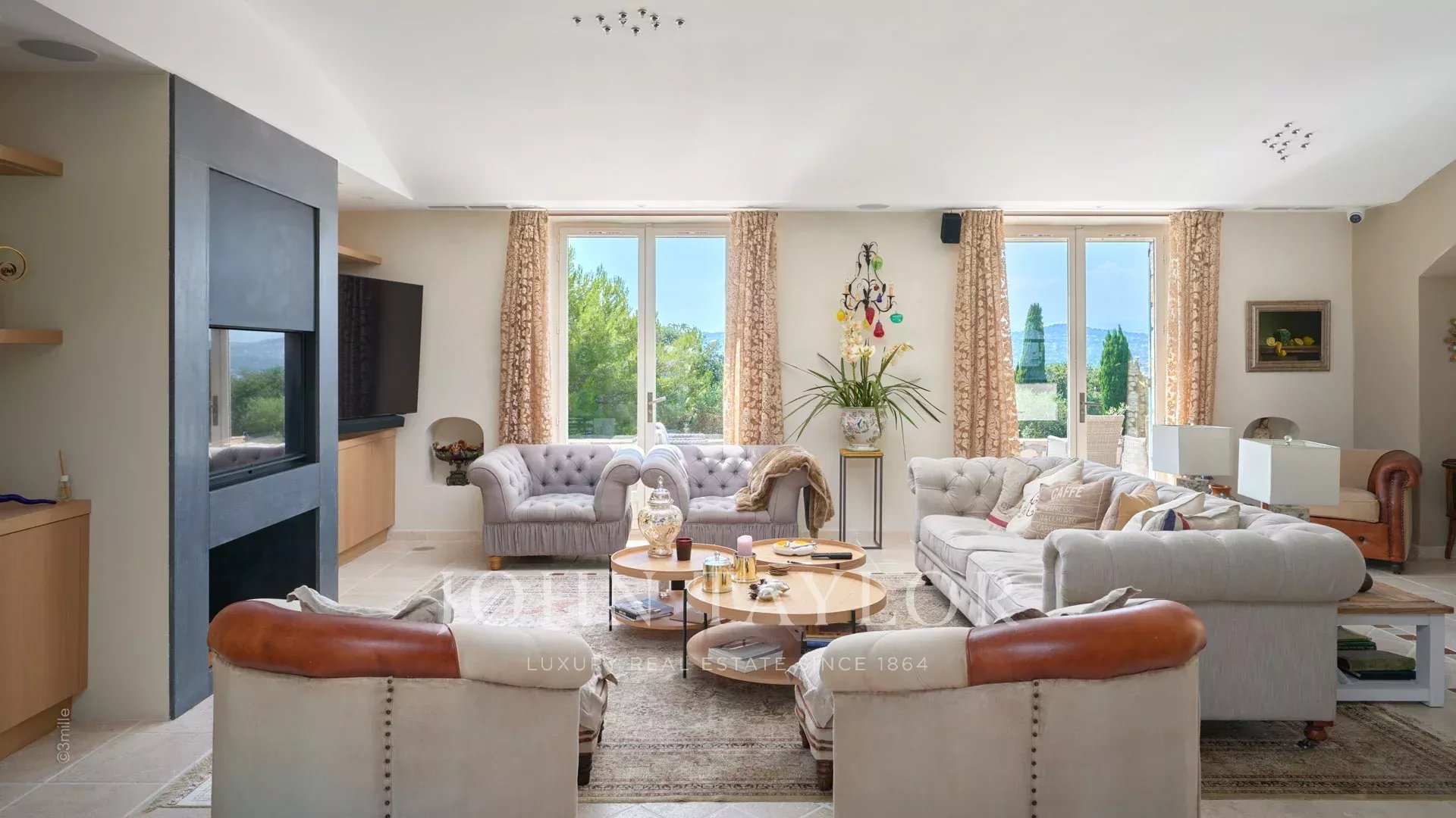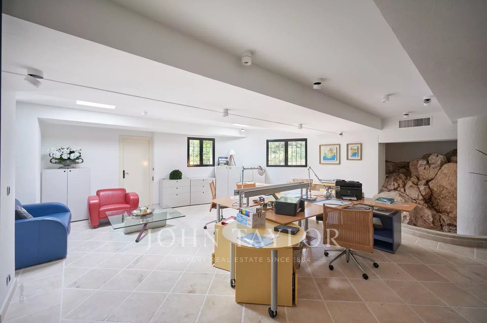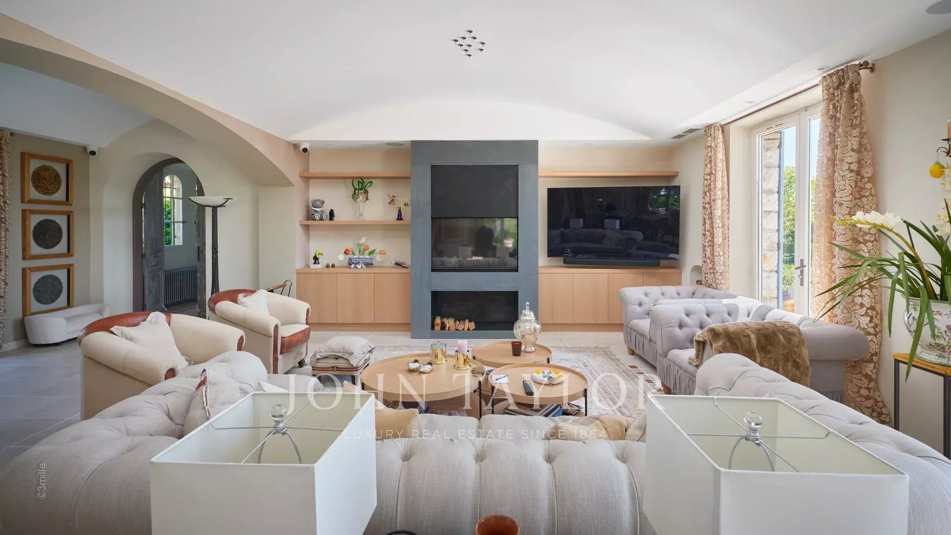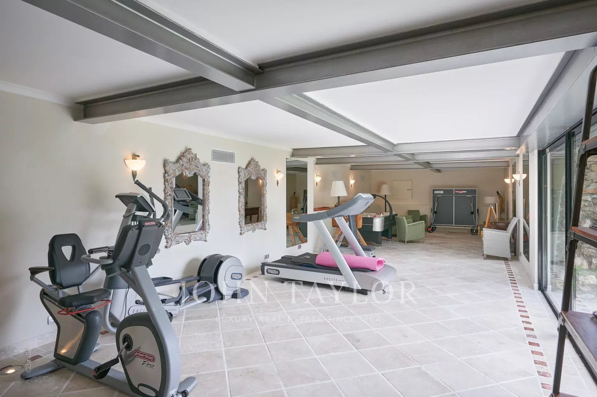 Vstupní hala vedoucí do přijímacího pokoje, který se skládá z velkého obývacího pokoje a jídelny a přes velká okna se otevírá na terasy.