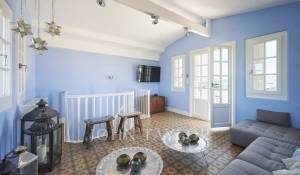 Jídelna/obývací pokoj otevřený na velkou terasu s výhledem na moře.