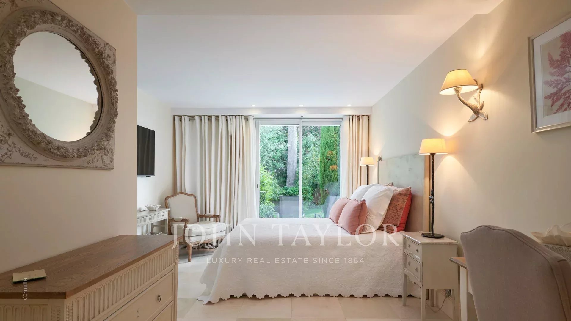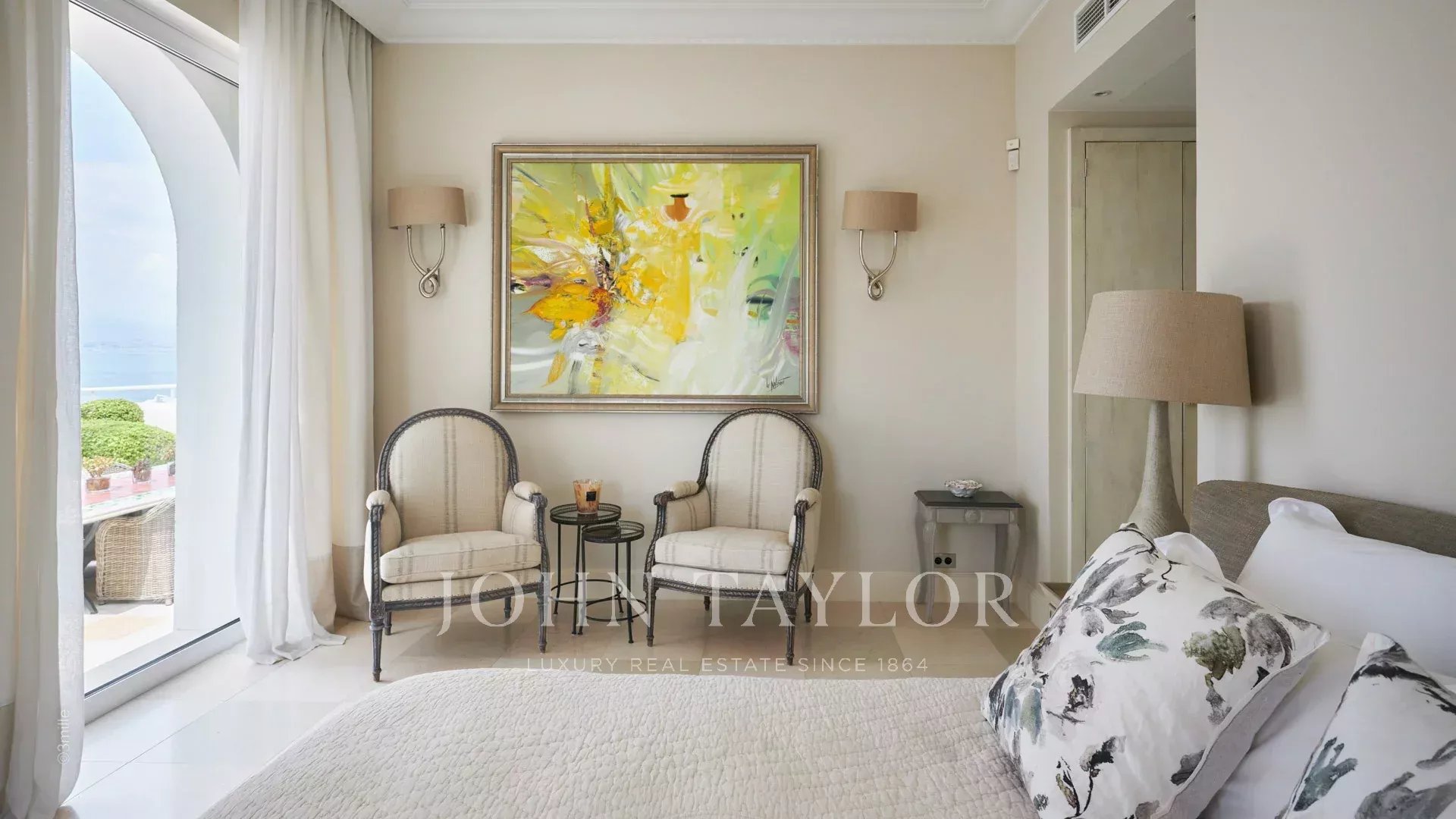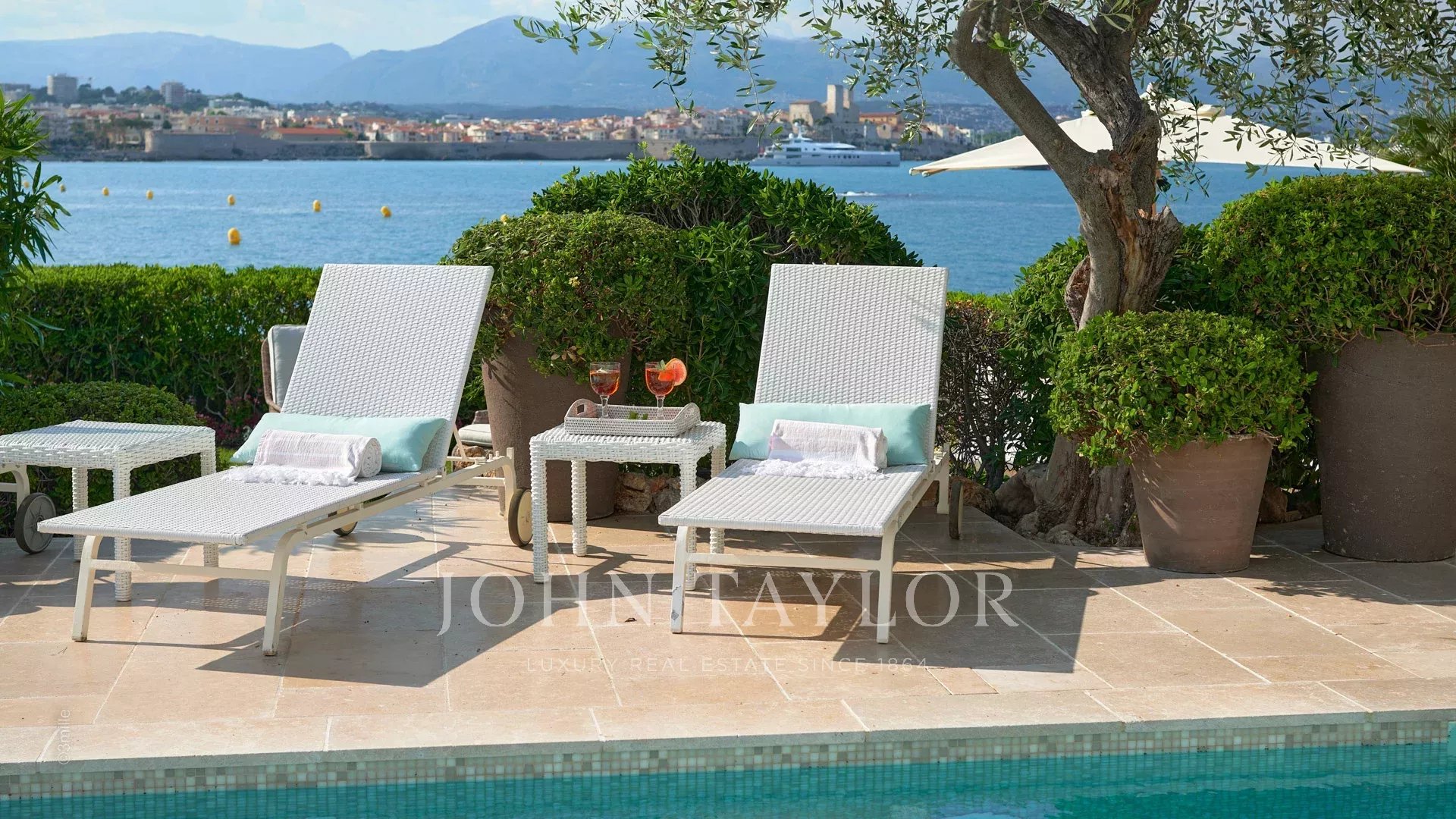 Vchod vede do rozlehlé přijímací místnosti s výhledem na nádhernou terasu s výhledem na moře a staré Antibes, která se skládá z obývacího pokoje a jídelny s kapacitou 12 osob.