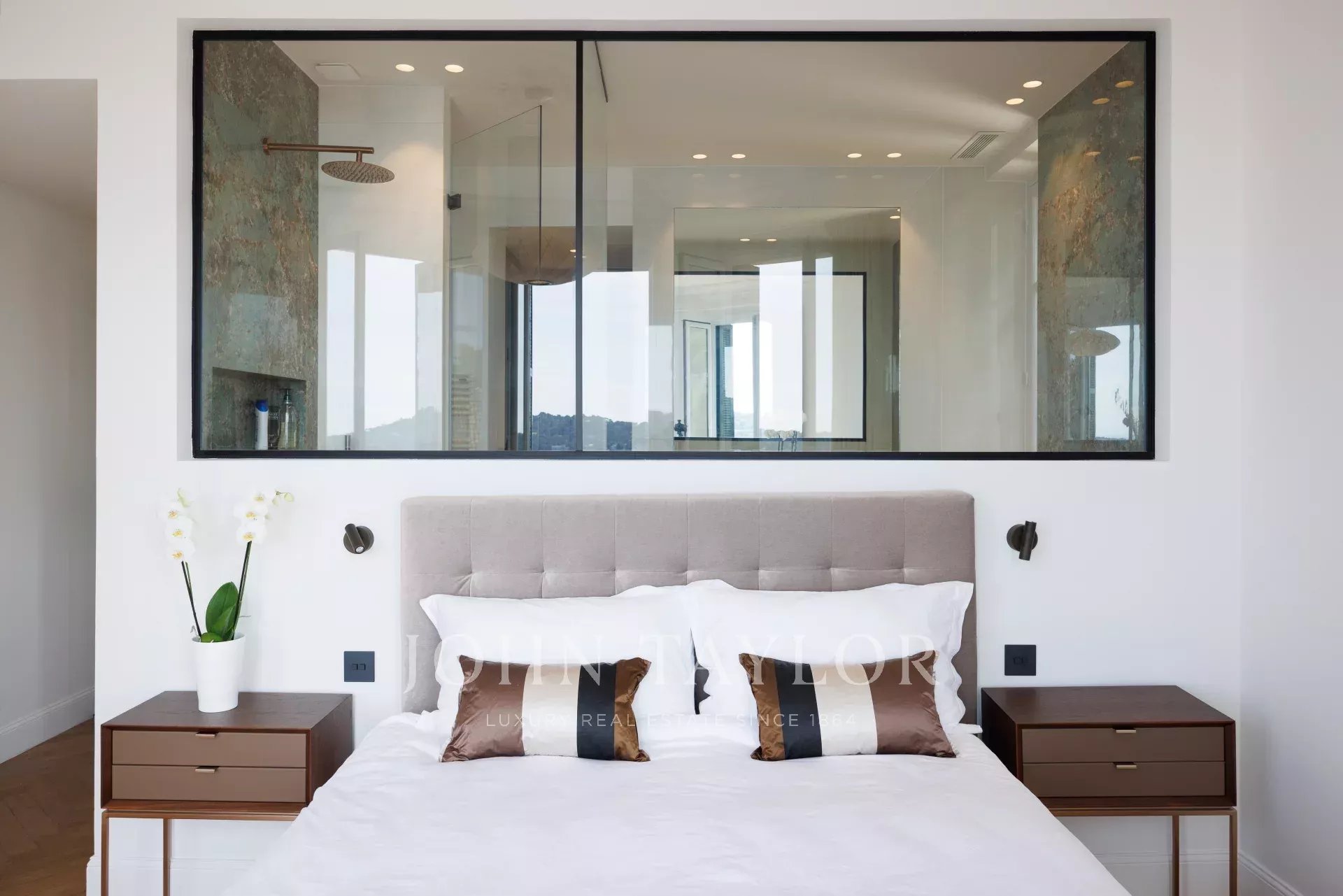 V horní části (1. patro) : Hlavní ložnice (manželská postel) s koupelnou (vana, sprcha, WC) a šatnou. Jedna ložnice (2 samostatná lůžka, která lze rozložit na manželskou postel) s vlastní sprchou (sprcha a WC) a skříněmi. Ložnice s vlastní sprchou (sprcha a WC) a skříní.