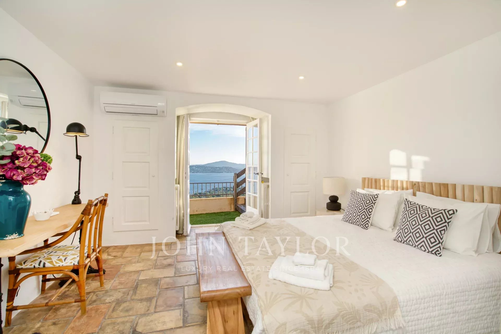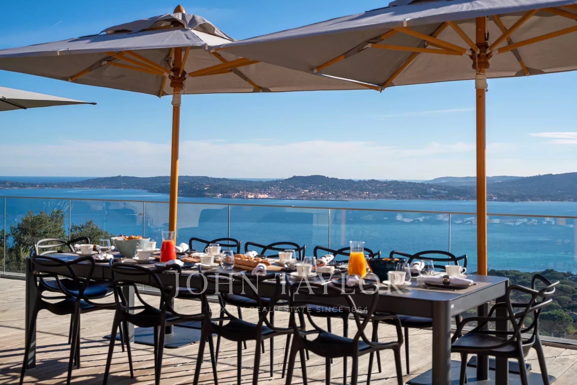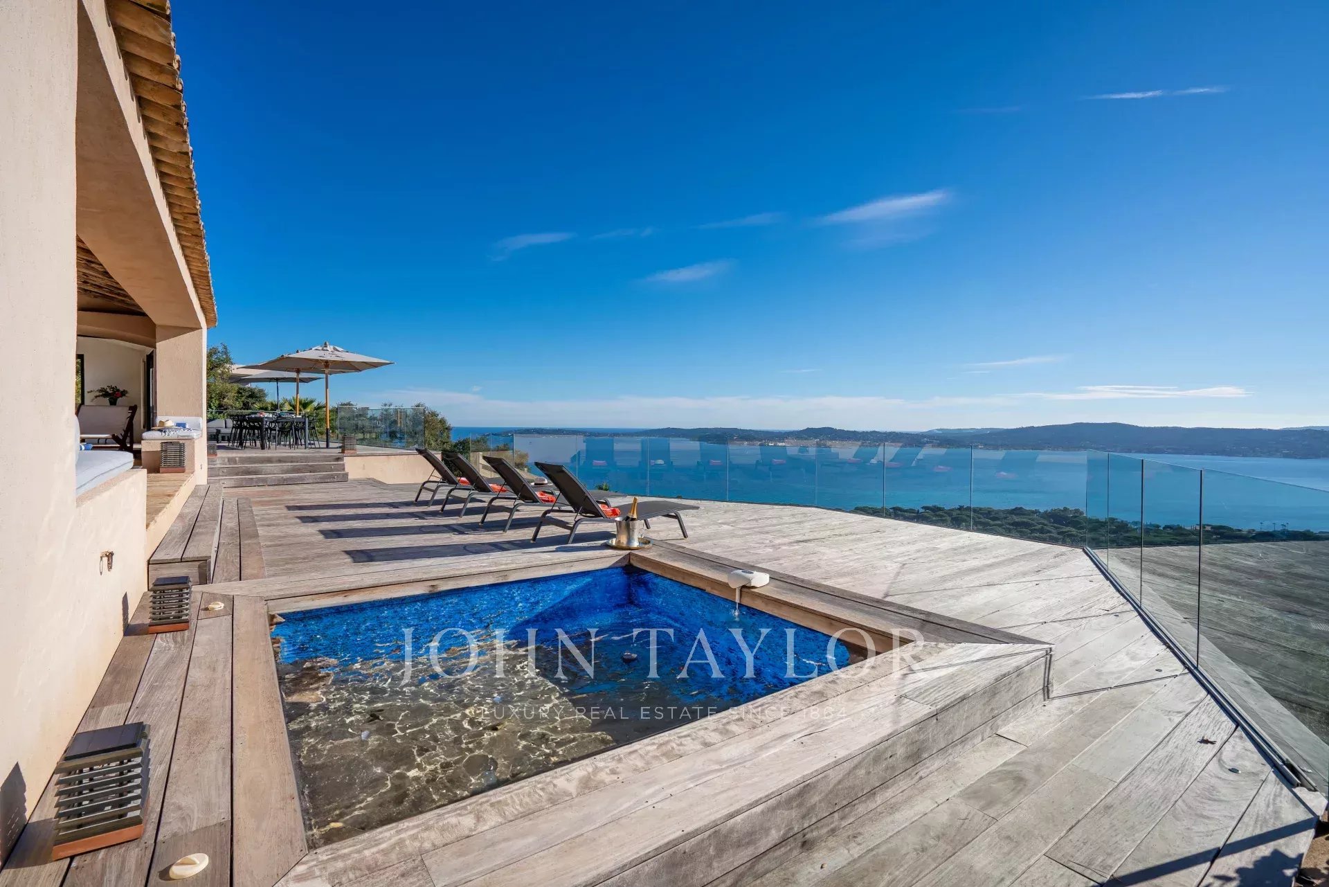 Vila má výhled na celý záliv Saint-Tropez a nabízí úchvatný panoramatický výhled na moře, okolní kopce a legendární vesnici Saint-Tropez.