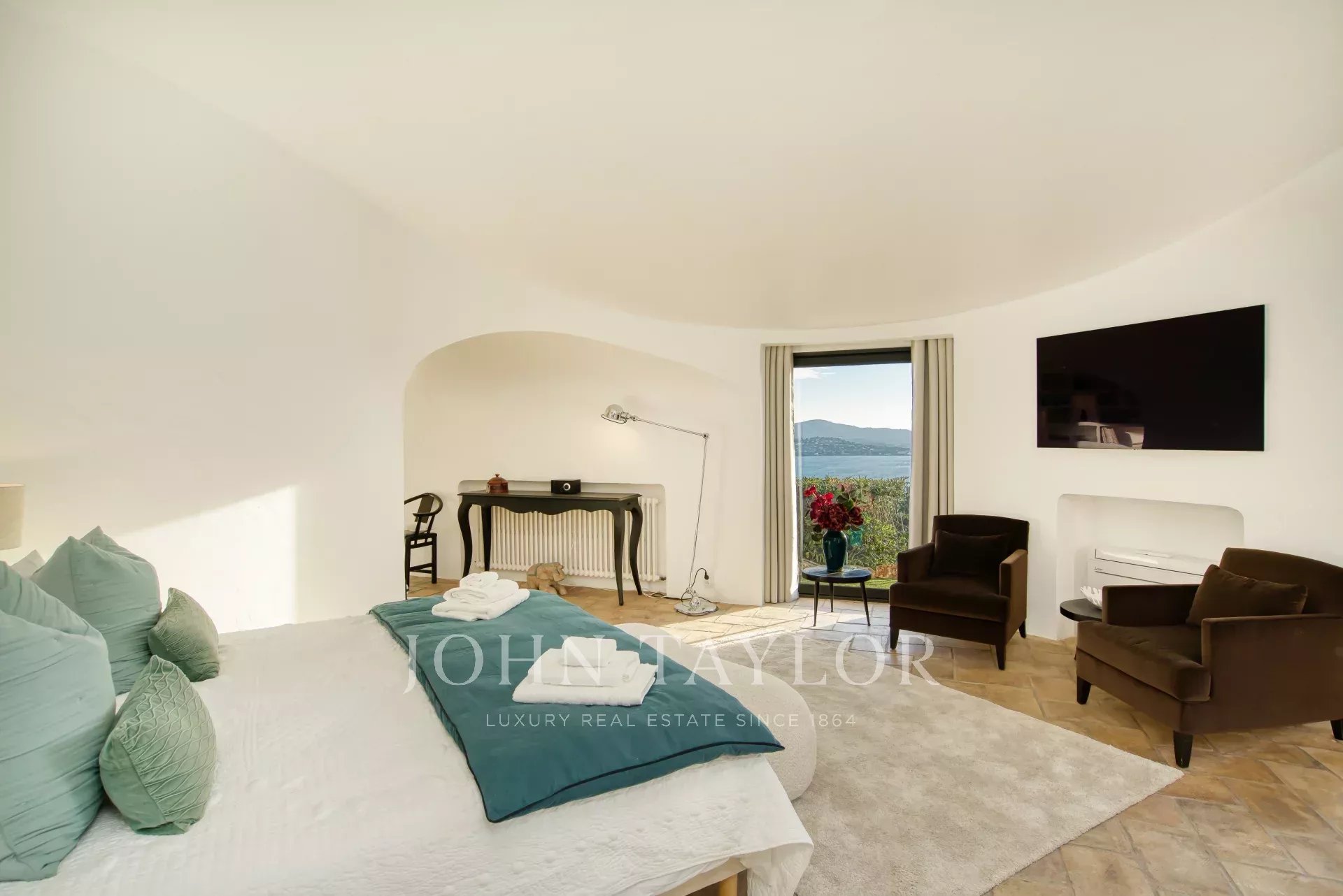 Interiéry o rozloze 660 m² byly do posledního detailu navrženy interiérovým designérem a odhalují jedinečnou a pečlivou výzdobu, jejíž eleganci symbolizuje téměř systematické používání bílé barvy a kterou přerušují architektonická rozhodnutí, jako je vznešený obývací pokoj a hlavní ložnice s oblými tvary a výjimečným pohlednicovým výhledem na celý záliv Saint-Tropez.