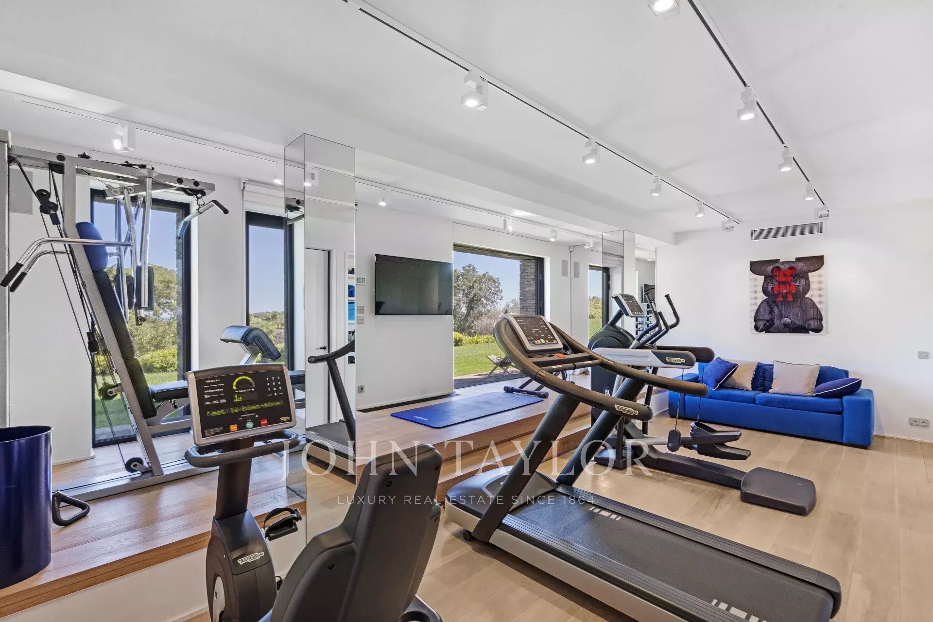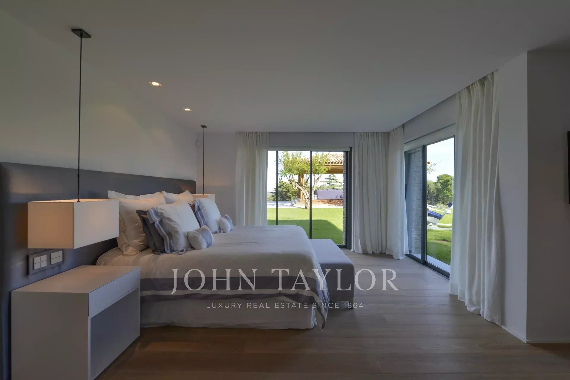 V přízemí se nachází: vstupní hala s toaletou pro hosty, velký obývací pokoj se vstupem na krytou terasu, jídelna, plně vybavená kuchyň s chladírnou, hlavní ložnice s výhledem na moře a Pampelonne, koupelna a šatna s vlastní terasou.