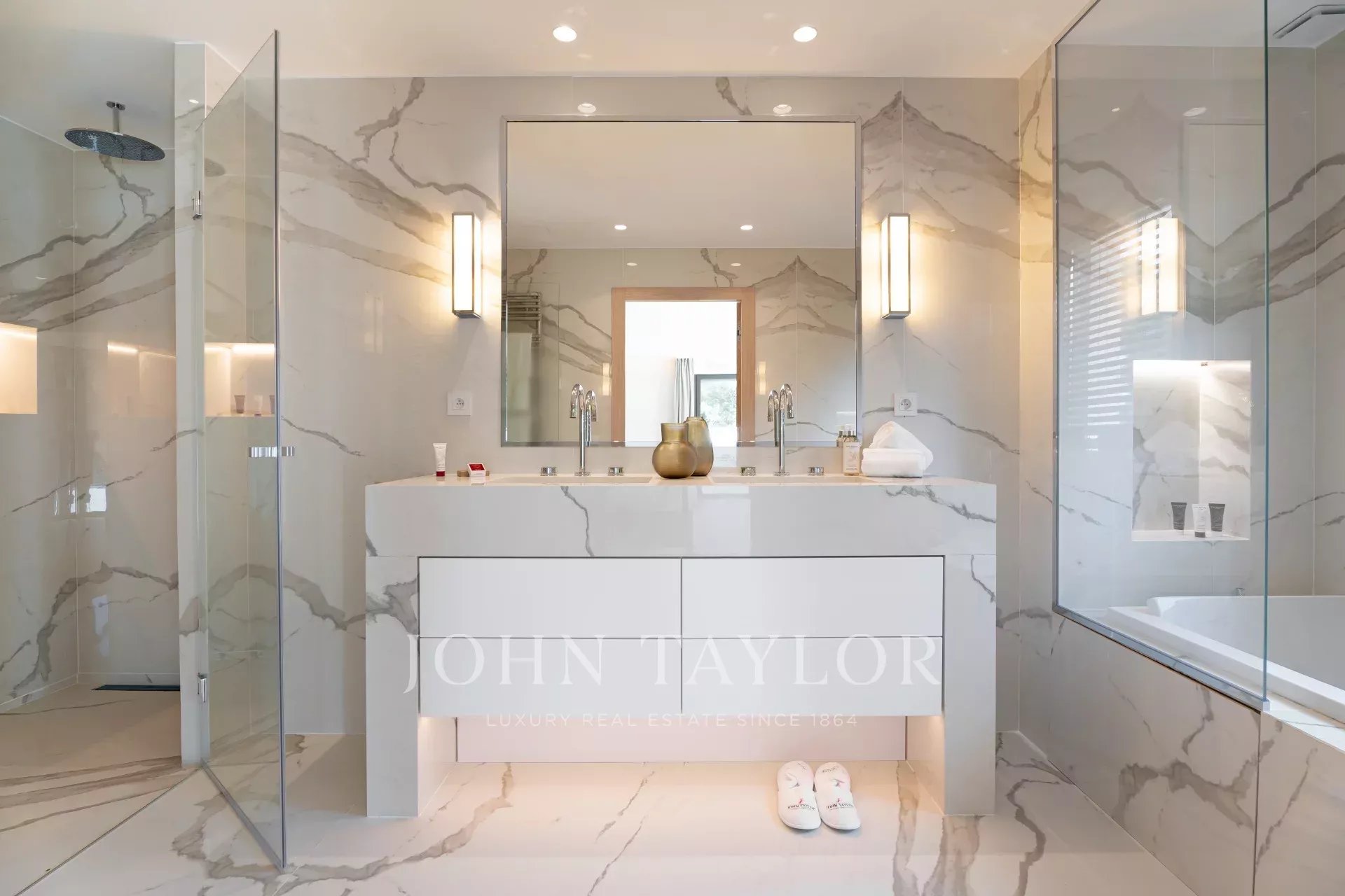 Vybavení: bazén (nevyhřívaný) s domkem u bazénu, klimatizace v celém objektu, trezory ve všech ložnicích, prádelna, garáž, alarm, fitness s masážní místností, hammam a sprcha/WC.