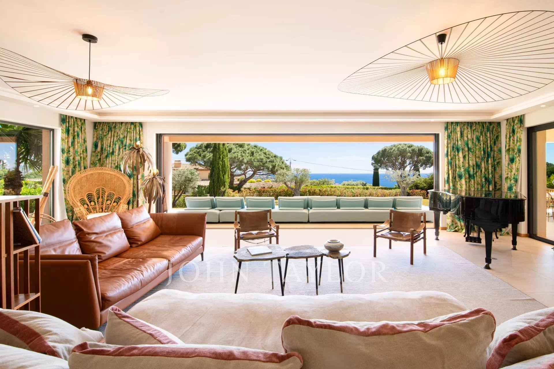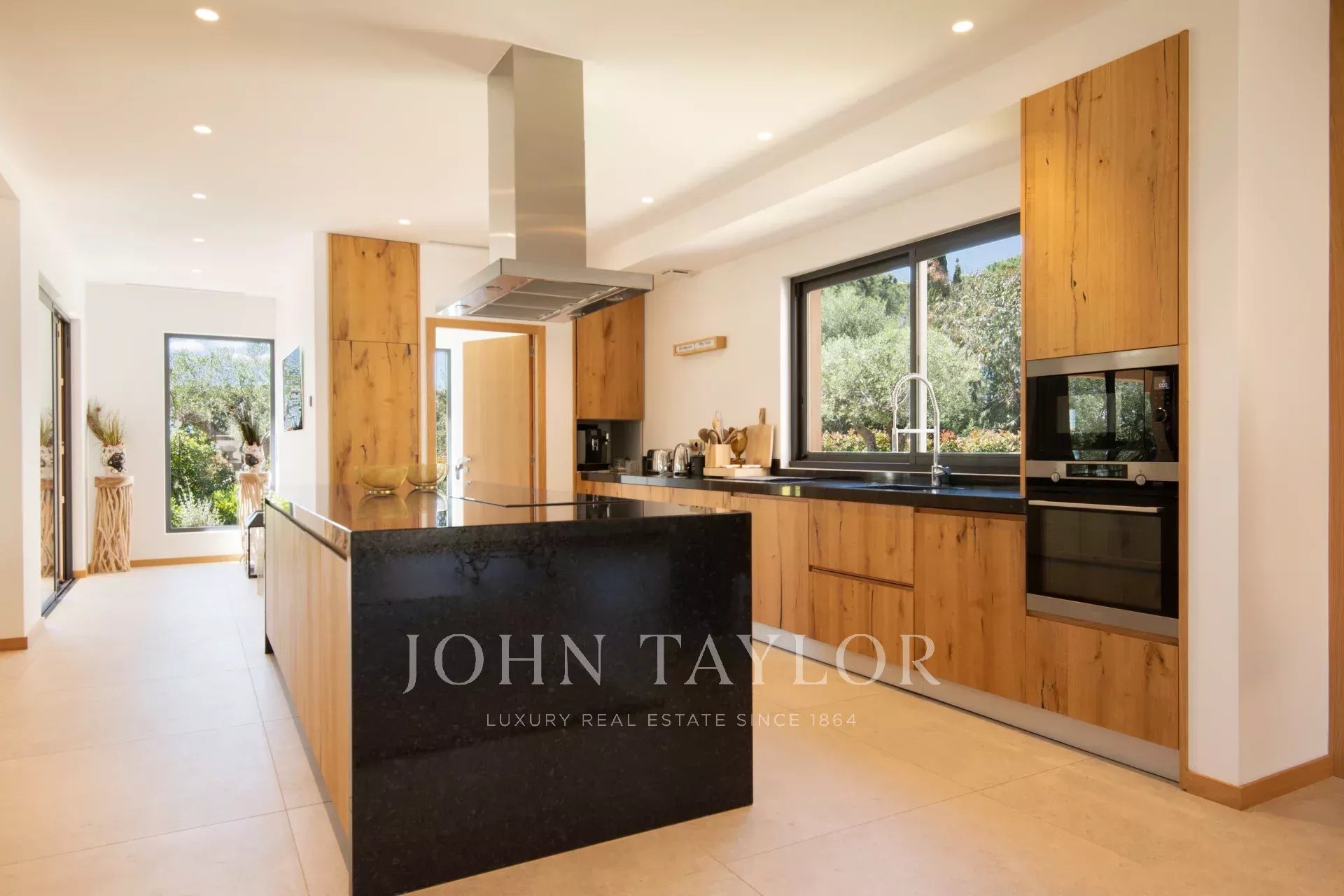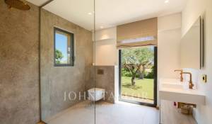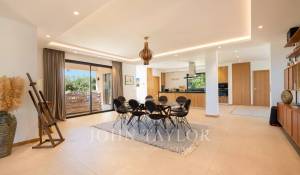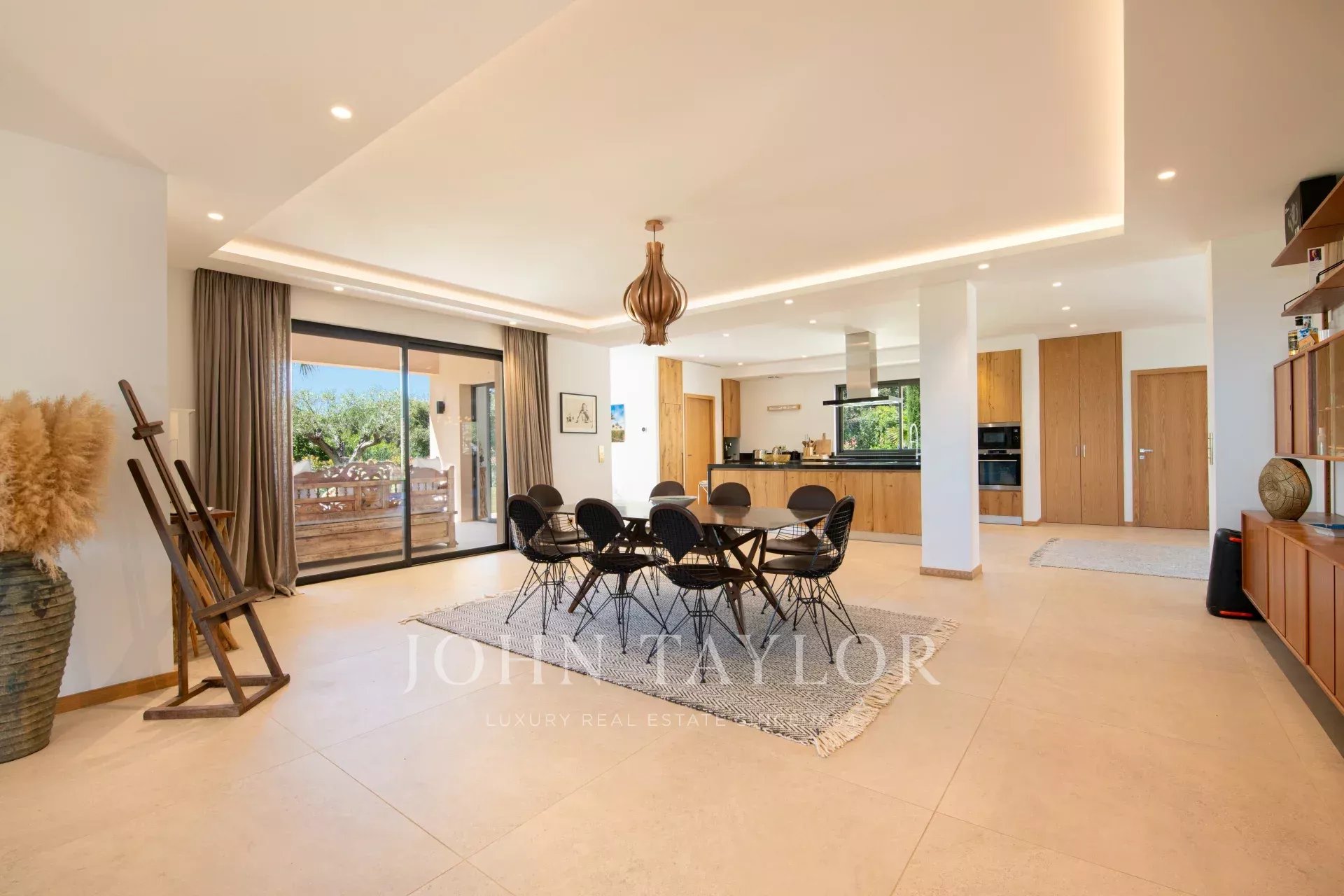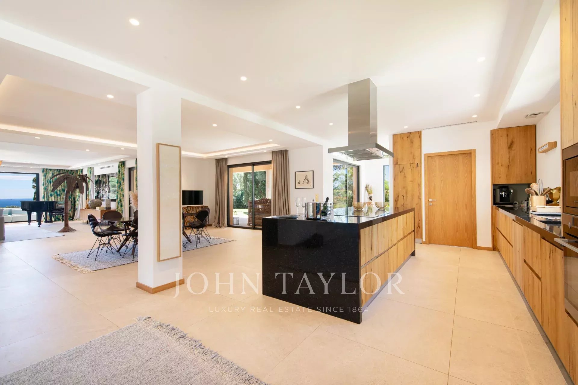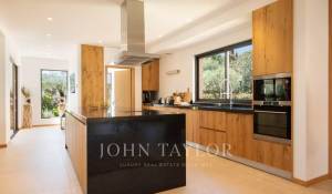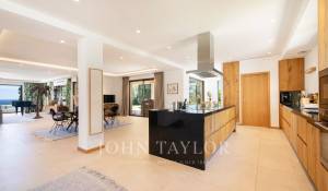 Tento moderní dům se otevírá do velkého obývacího pokoje, jídelny a plně vybavené kuchyně (dvě myčky, dvě lednice, trouba, mikrovlnná trouba, indukční varná deska, mrazák a veškeré kuchyňské náčiní). Obývací pokoj s velkými okny, která se zcela otevírají, nabízí úchvatný výhled do zahrady a na Středozemní moře.