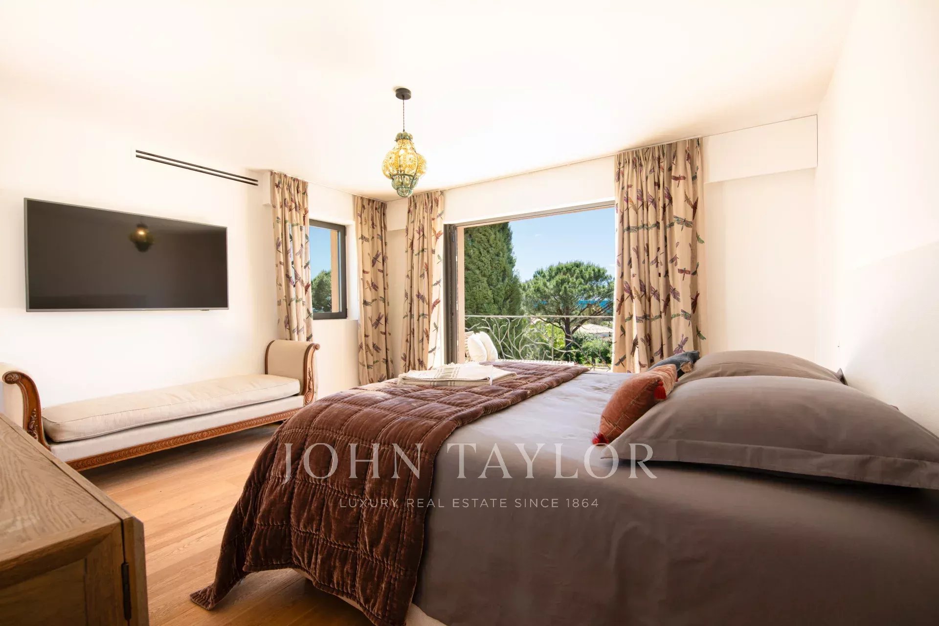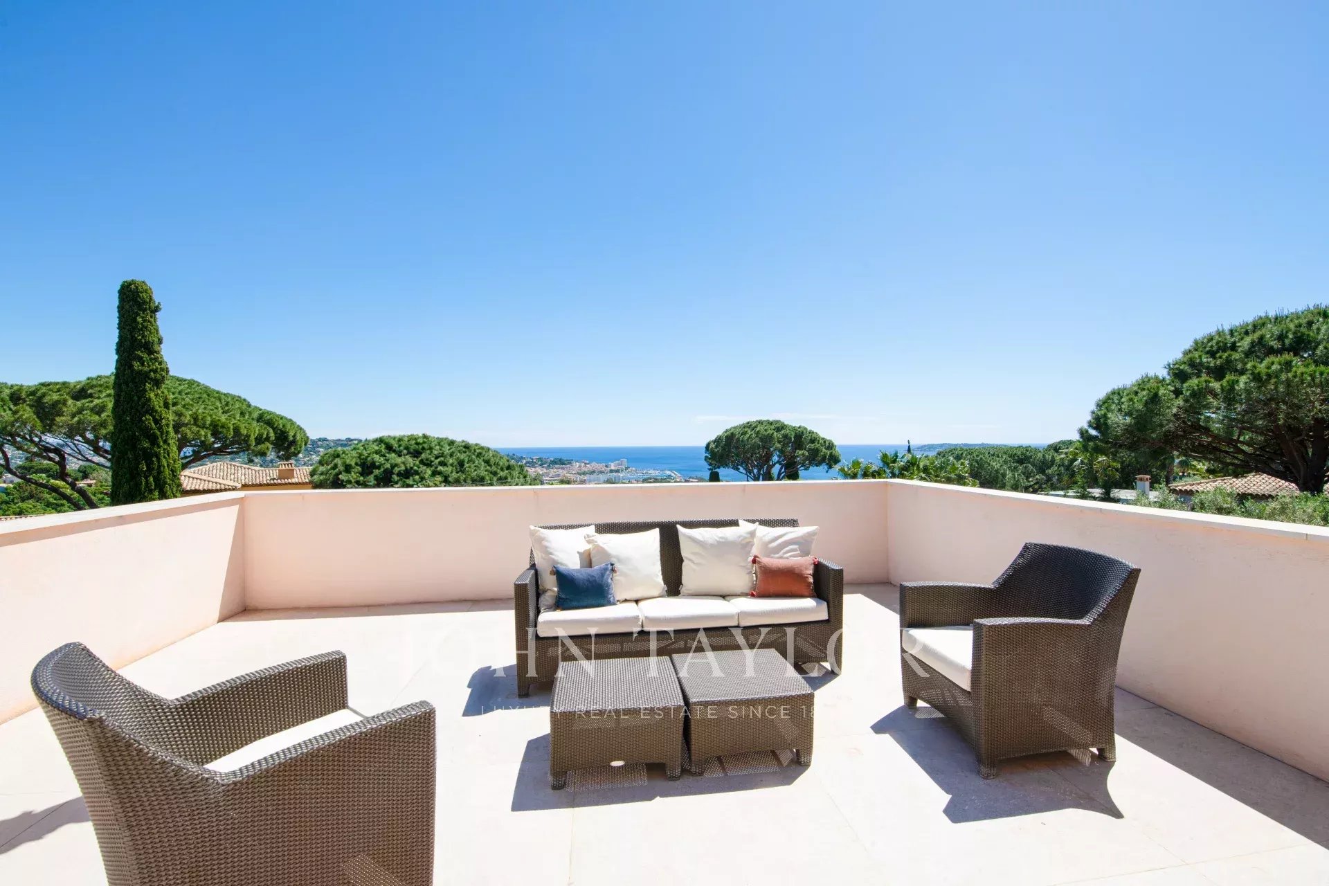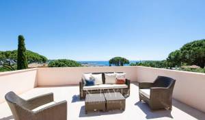Tento rodinný dům se nachází na střeženém pozemku 10 minut chůze od pláží Sainte-Maxime a nabízí výhled na moře, záliv Saint-Tropez a kopce Grimaud.