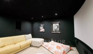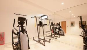 V suterénu se nachází domácí kino, plně vybavená posilovna (činky, veslovací trenažér, kola) a prádelna s pračkou a sušičkou.