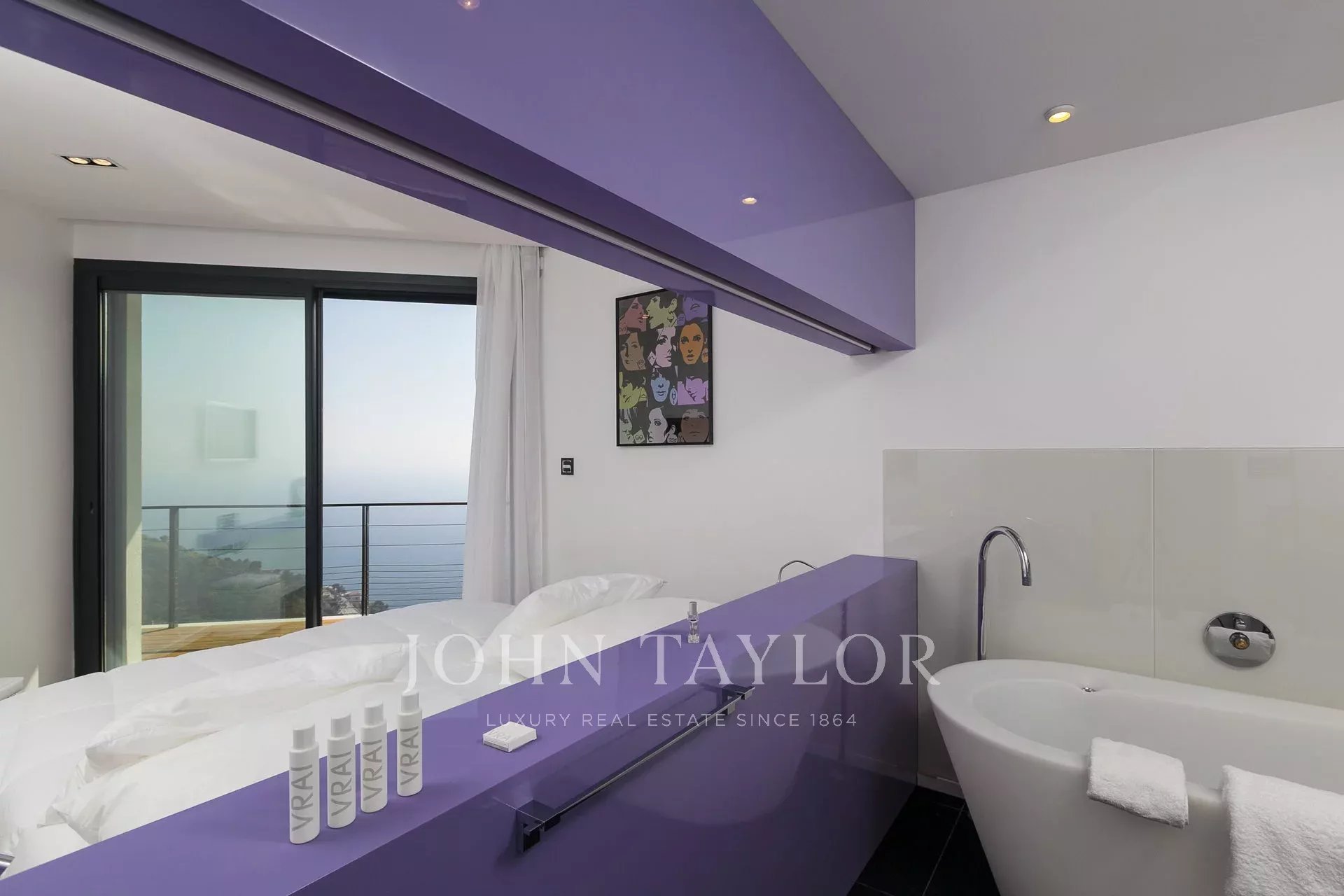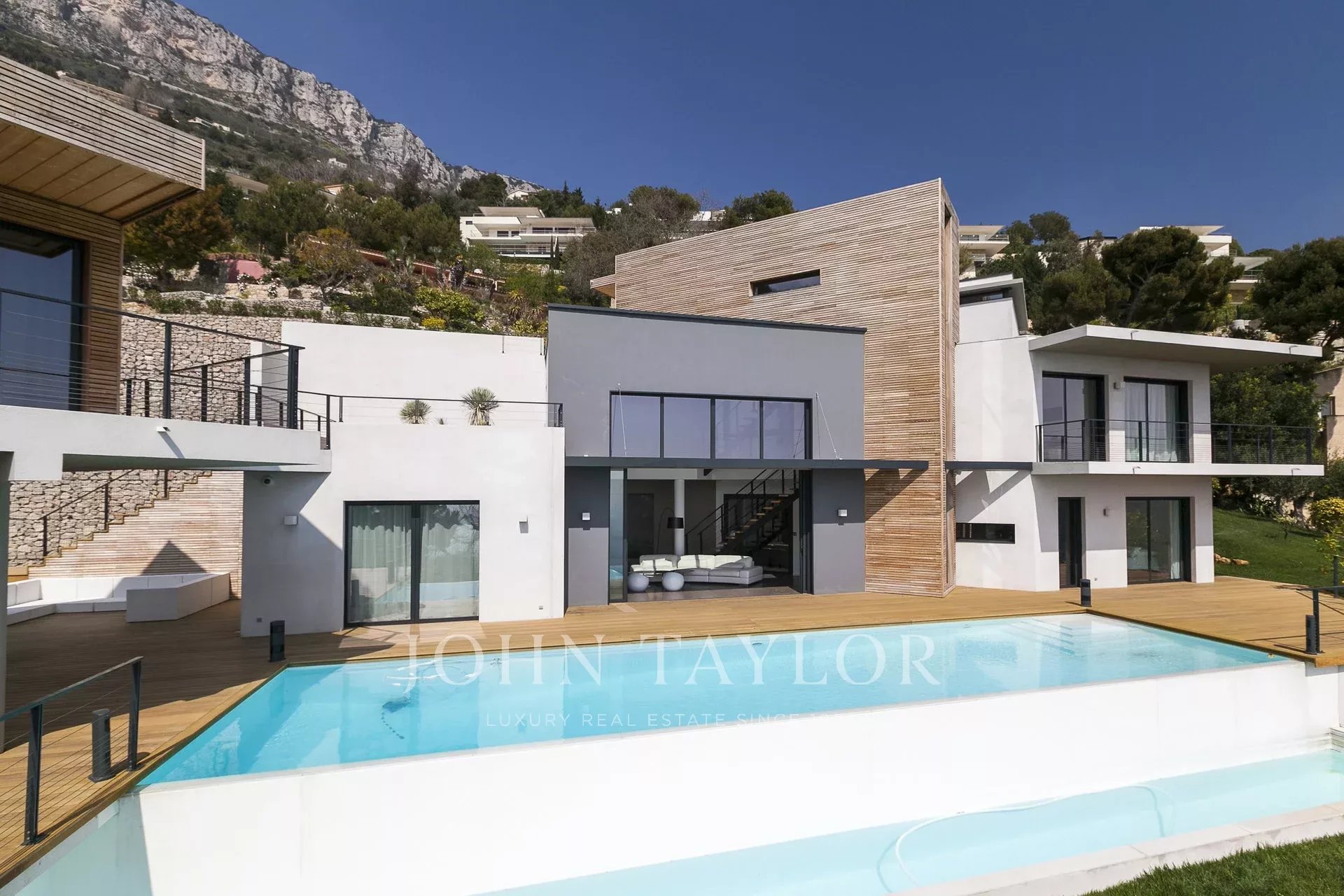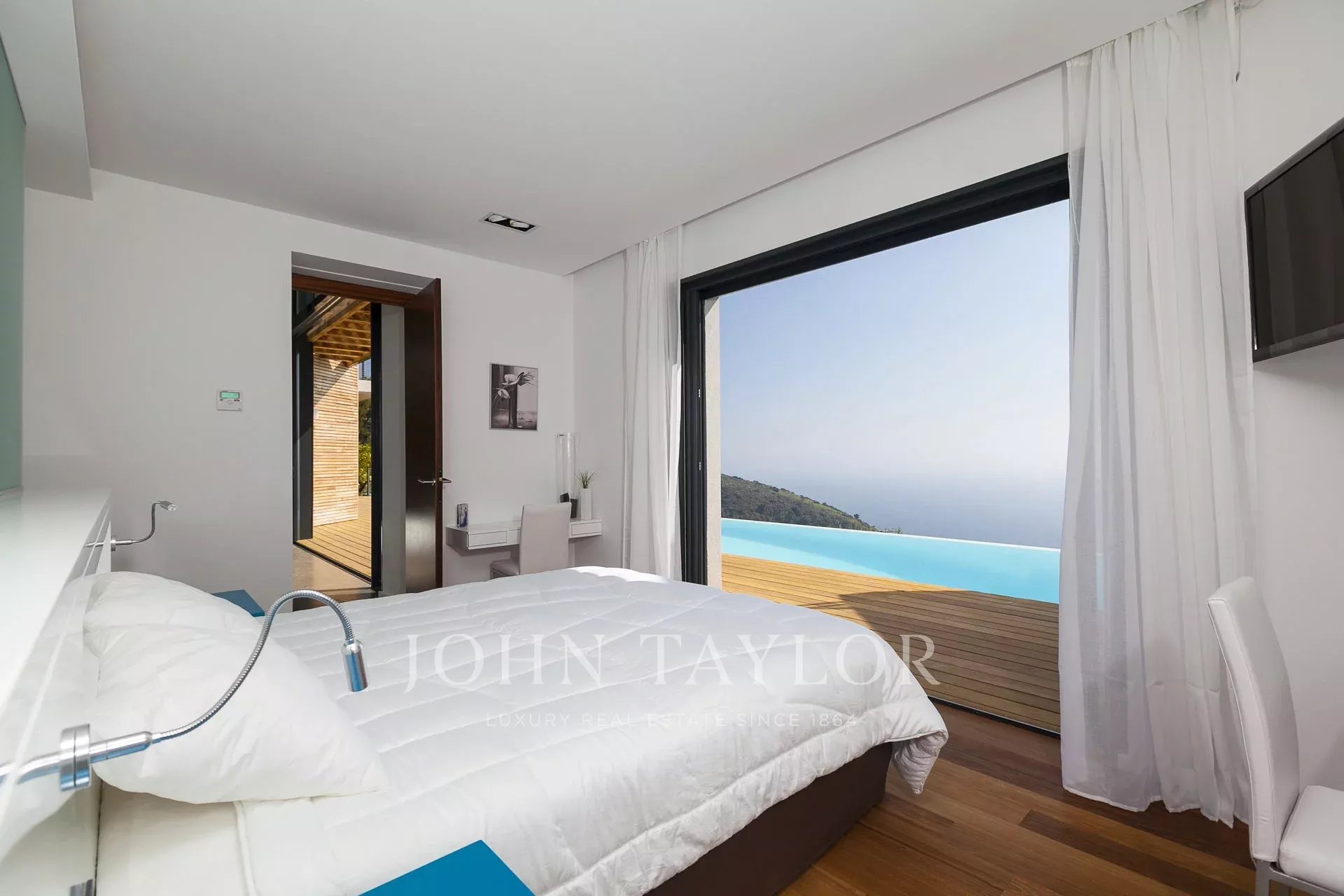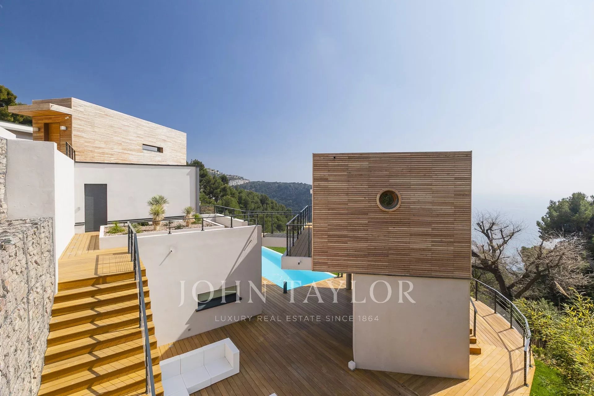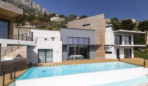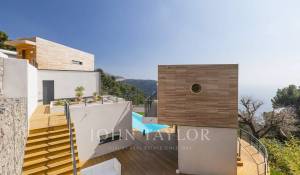 Vynikající moderní vila s obytnou plochou cca 350 m² na pozemku o rozloze 2 200 m², která se nachází na výšinách Eze v rezidenční čtvrti s nádherným výhledem na moře a kopce. Vila se skládá z 5 ložnic, z nichž každá má vlastní koupelnu nebo sprchový kout, obývacího pokoje otevřeného na rozlehlou terasu s vyhřívaným bazénem, jídelního koutu, plně vybavené kuchyně s poloprofesionální kuchyňskou linkou. Dům pro hosty s ložnicí a vlastní sprchou.