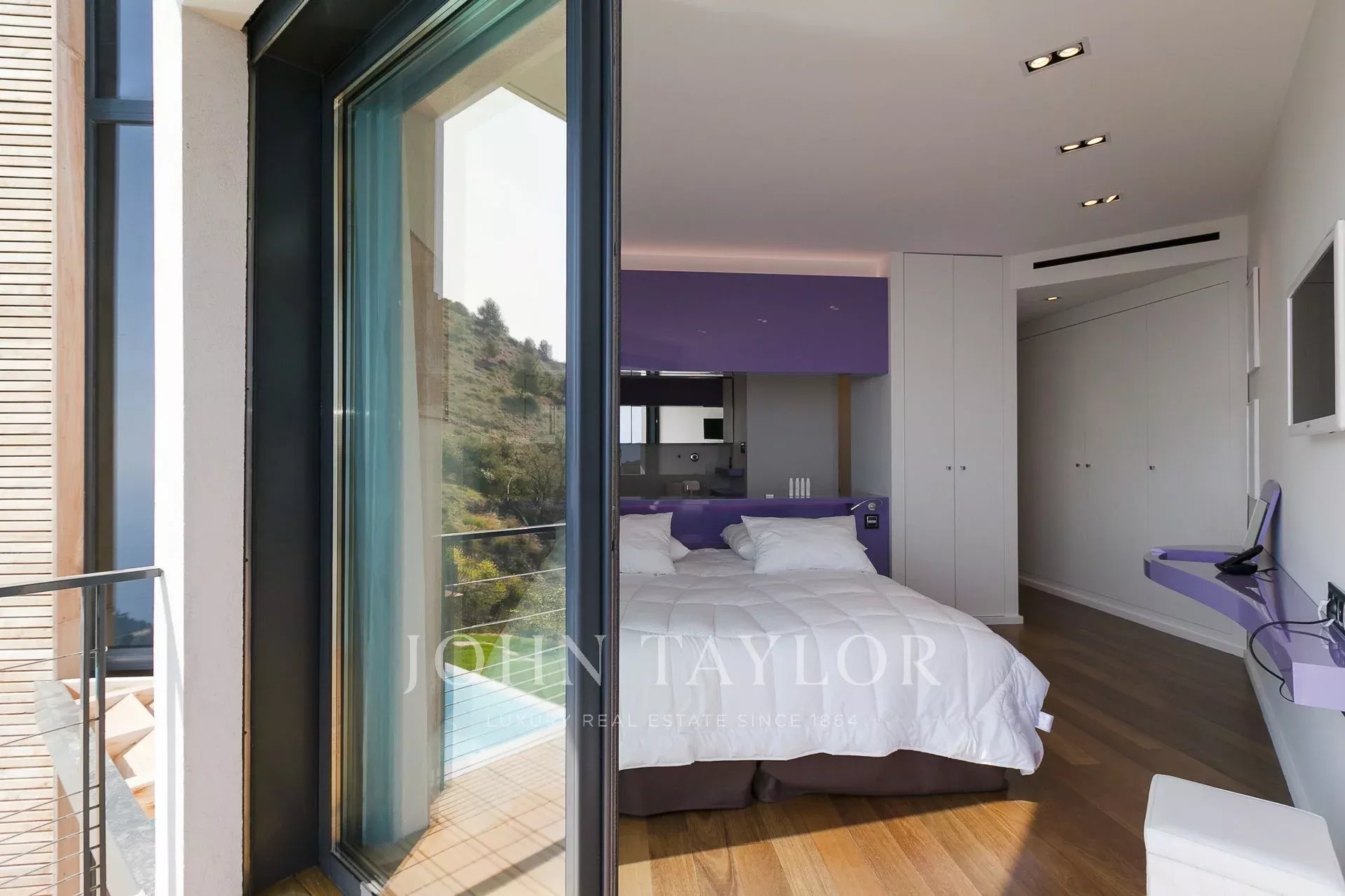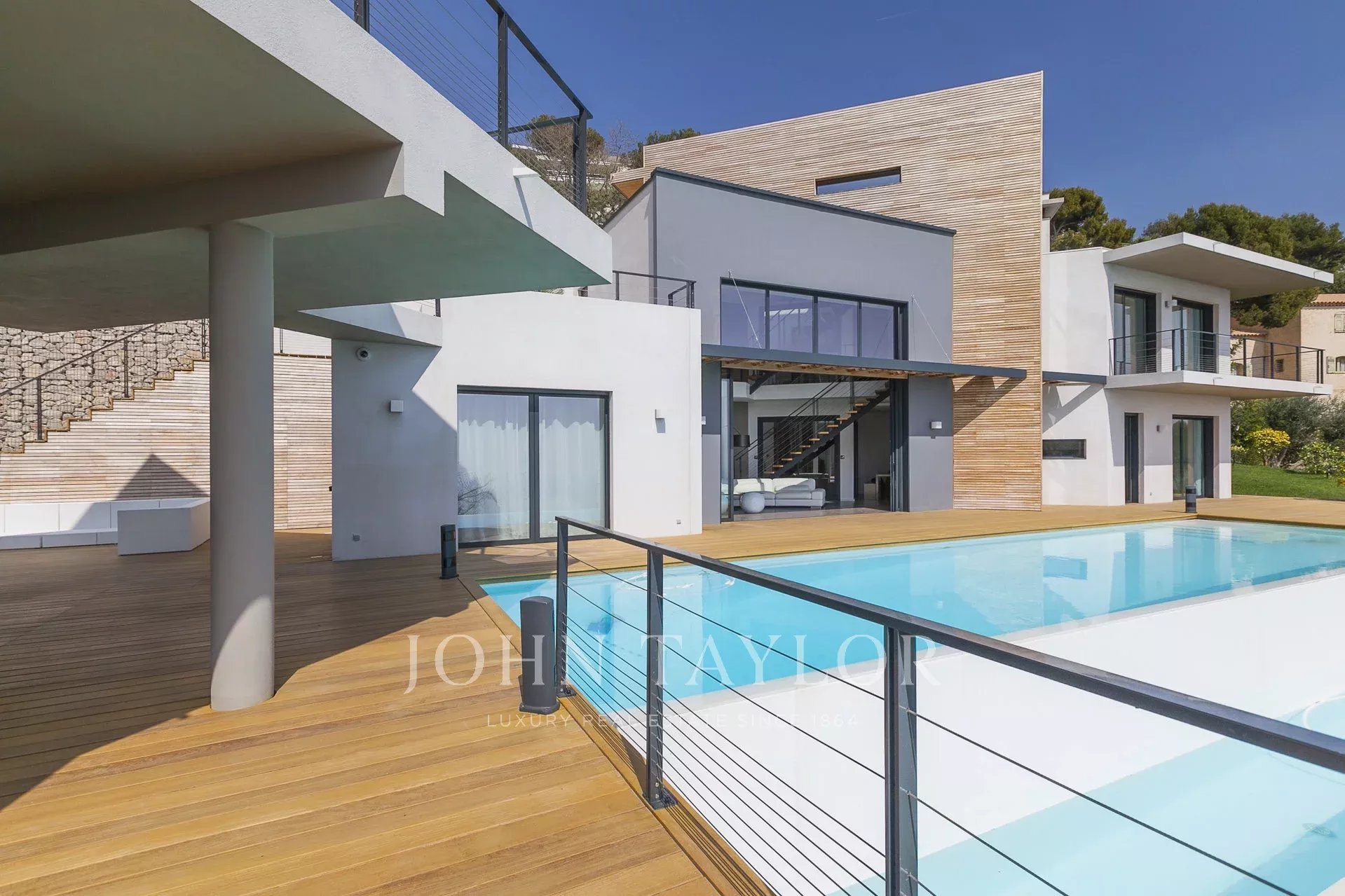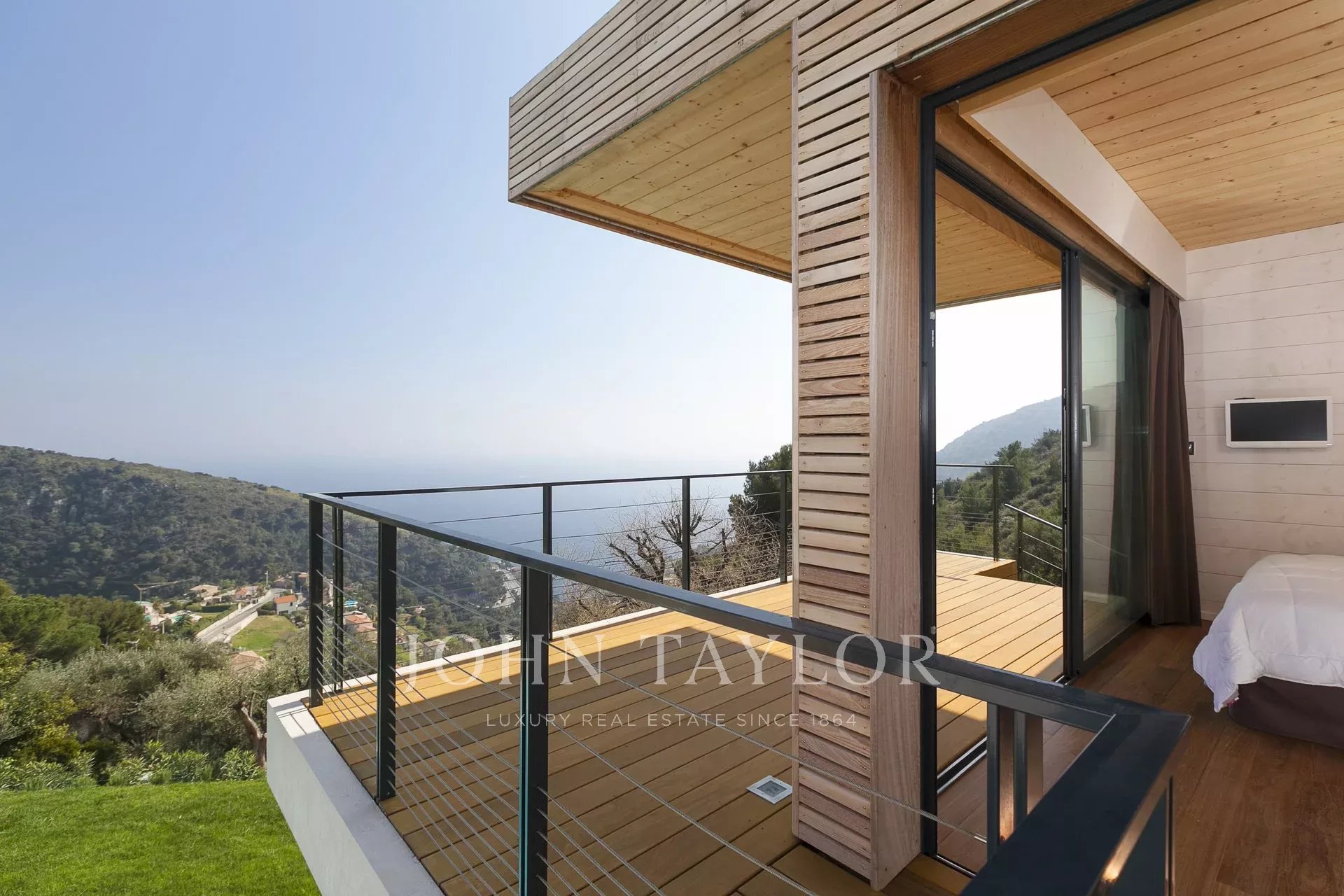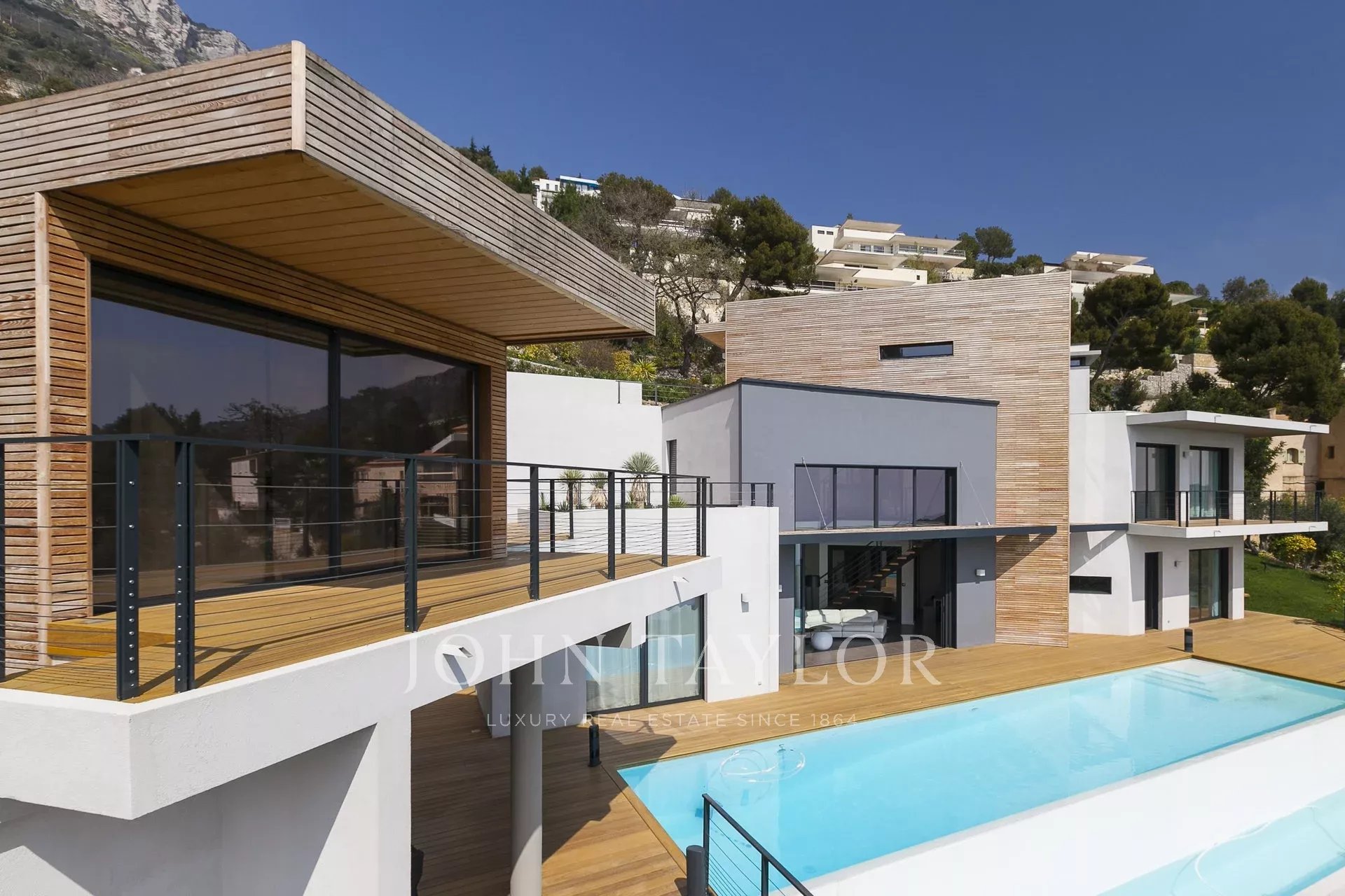 Vynikající moderní vila s obytnou plochou cca 350 m² na pozemku o rozloze 2 200 m², která se nachází na výšinách Eze v rezidenční čtvrti s nádherným výhledem na moře a kopce. Vila se skládá z 5 ložnic, z nichž každá má vlastní koupelnu nebo sprchový kout, obývacího pokoje otevřeného na rozlehlou terasu s vyhřívaným bazénem, jídelního koutu, plně vybavené kuchyně s poloprofesionální kuchyňskou linkou. Dům pro hosty s ložnicí a vlastní sprchou.