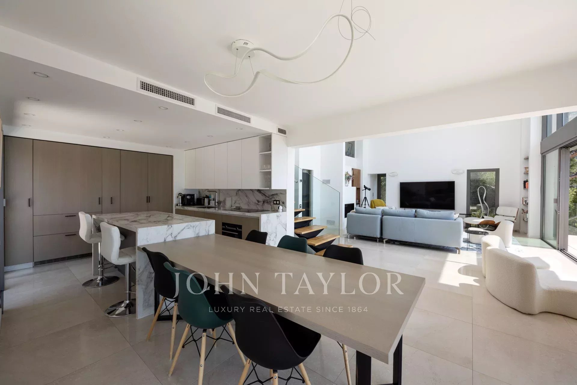 Úroveň +2: obývací pokoj s TV, jídelní kout s plně vybavenou otevřenou kuchyní, vše se otevírá na terasu s letní jídelnou.
