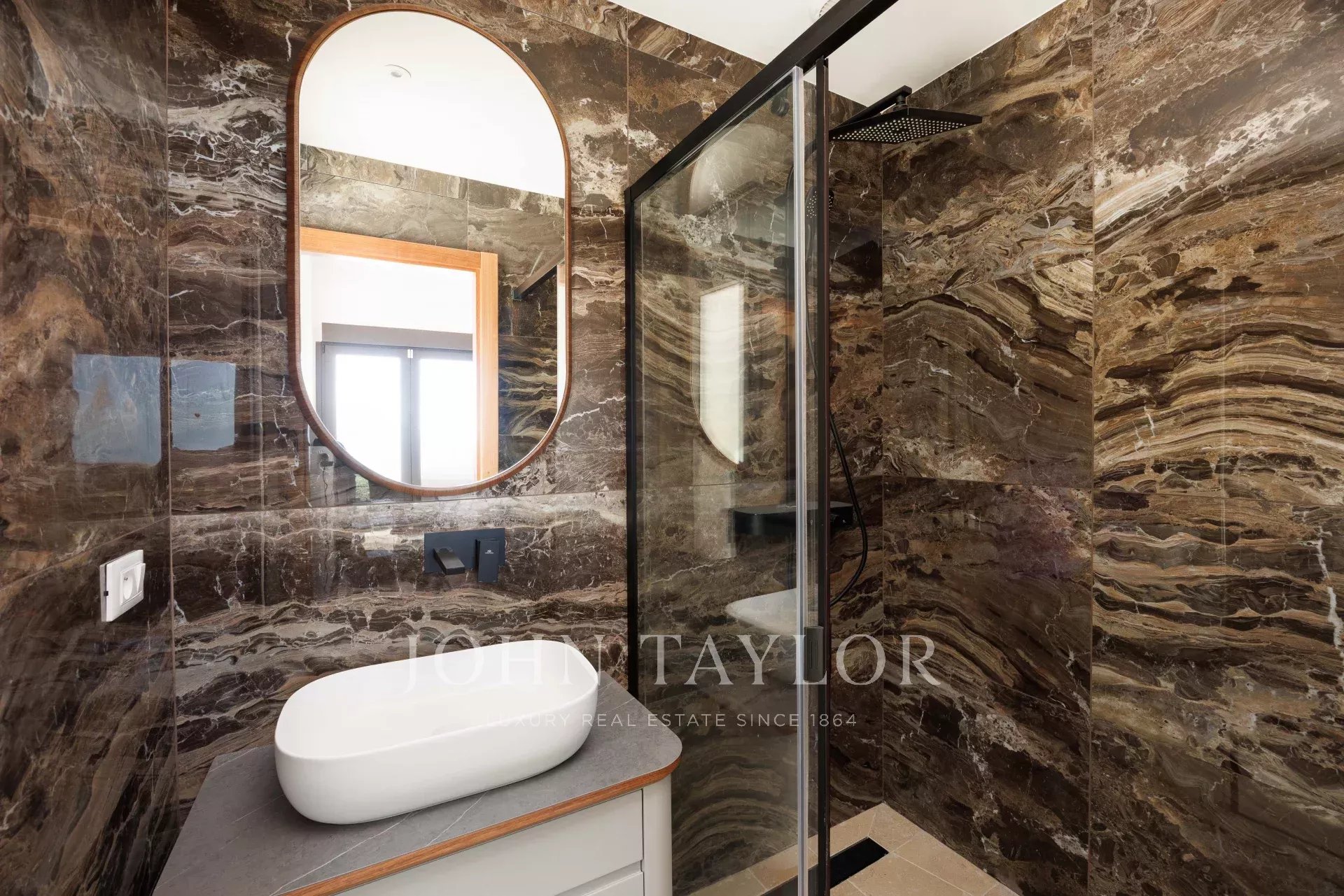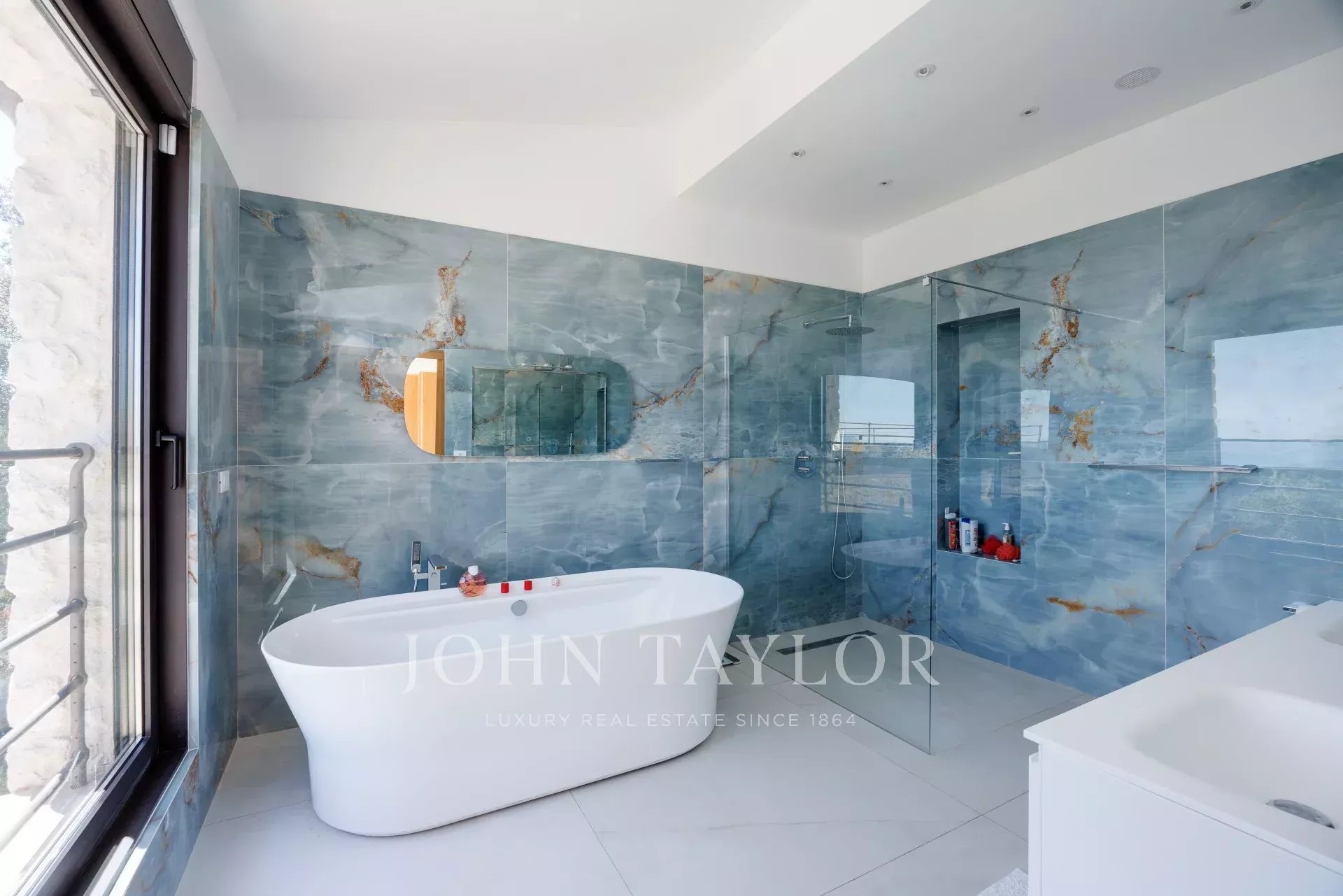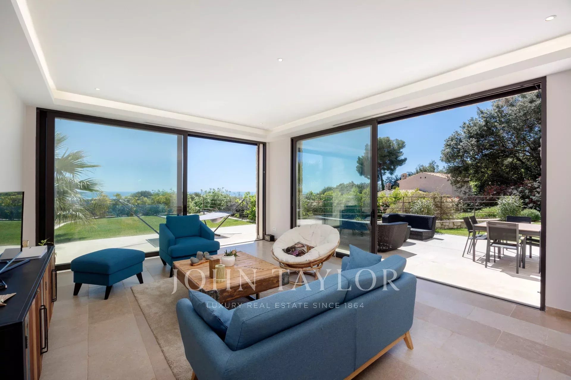 Vila se může pochlubit také dvojgaráží o rozloze 30 m², nádherným bazénem a soukromým tenisovým kurtem, což z této nemovitosti činí vzácné a vyhledávané zboží na Azurovém pobřeží.
