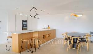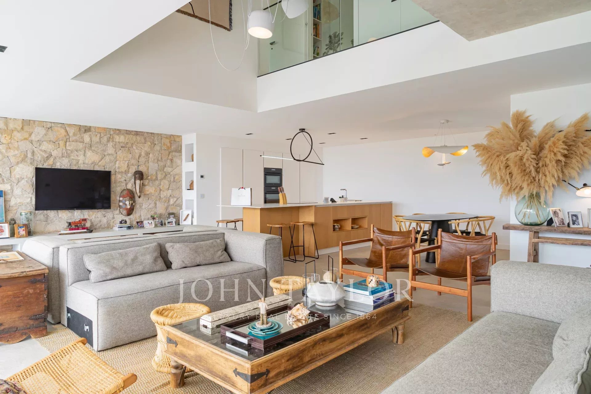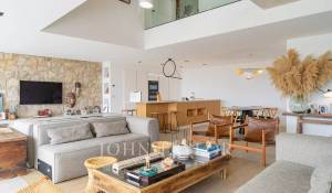 Vila má elegantní obývací pokoj z voskovaného betonu, který se skládá z prostorného obývacího pokoje, jídelny a plně vybavené kuchyně. Tento prostor je díky velkým třímetrovým posuvným skleněným oknům zcela otevřený ven, což nabízí výjimečné světlo a harmonické spojení s okolní přírodou.